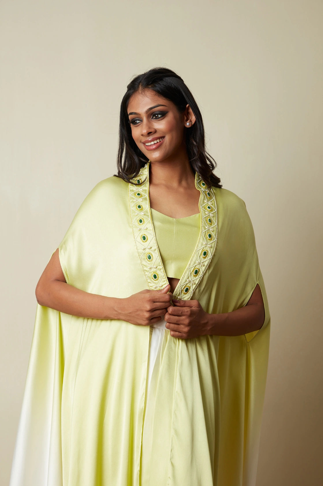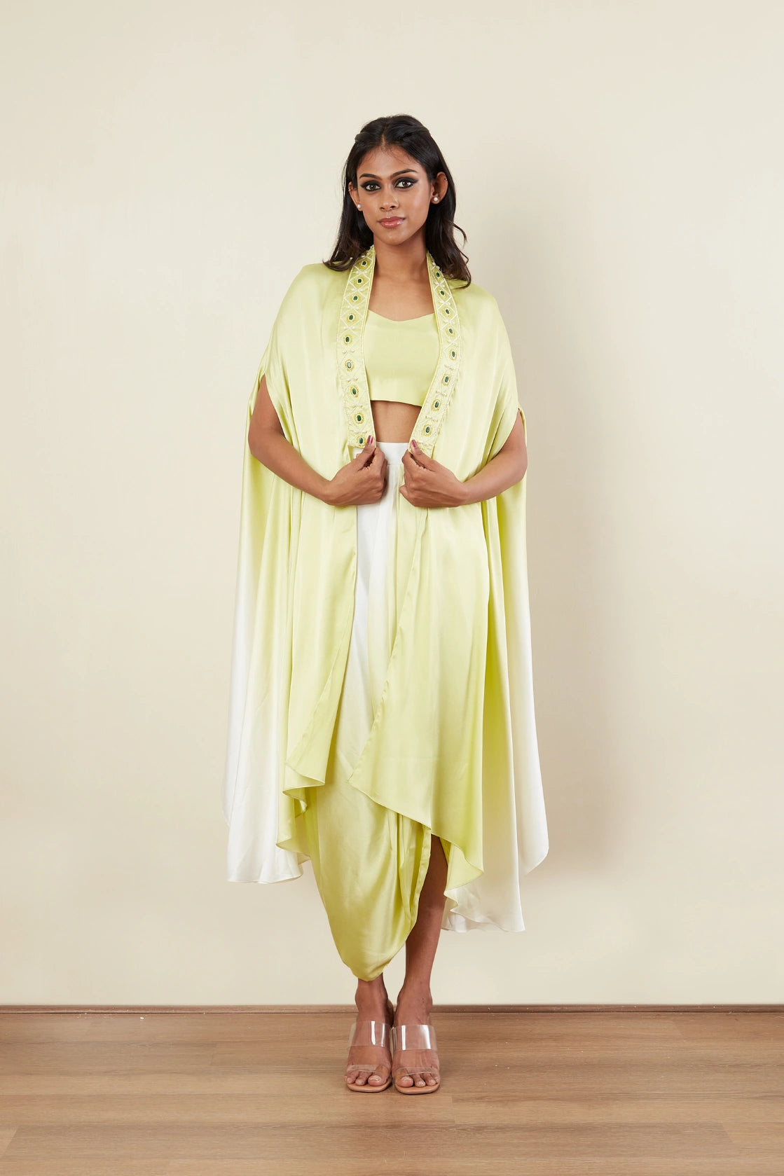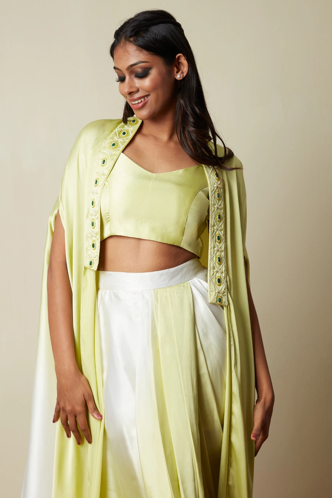 Long Cape -Crop Top -Dhoti Skirt -Emerald Stone, Tubes & Pearl Embroidery