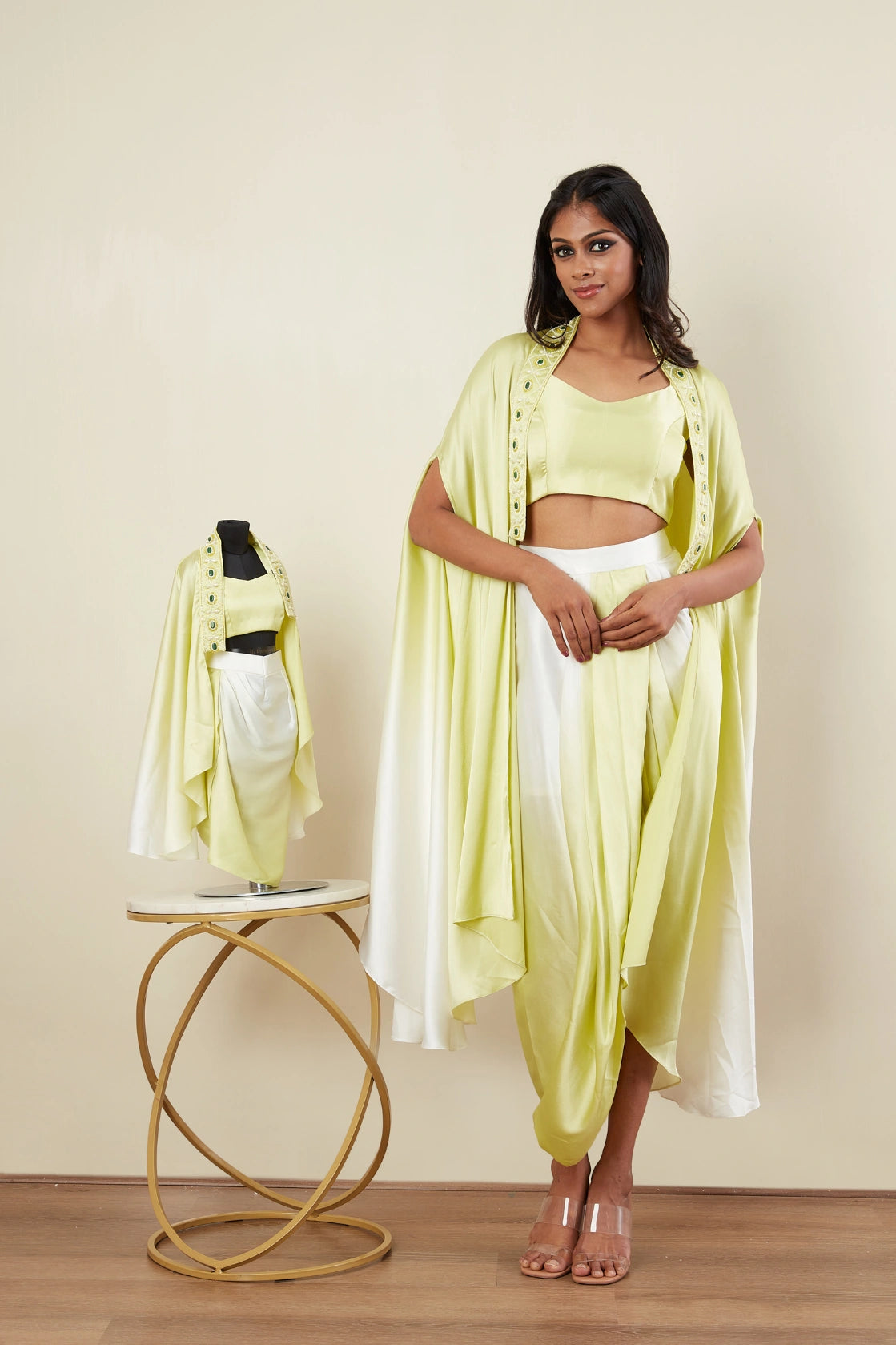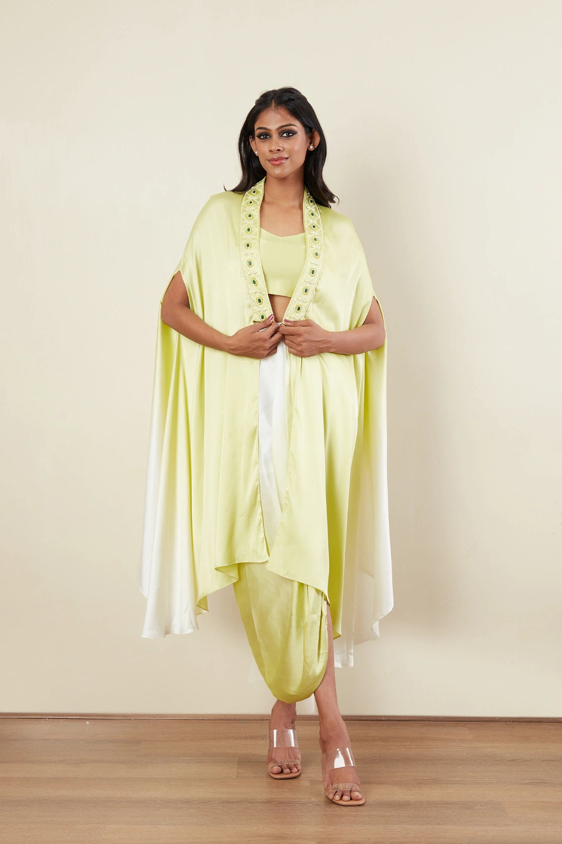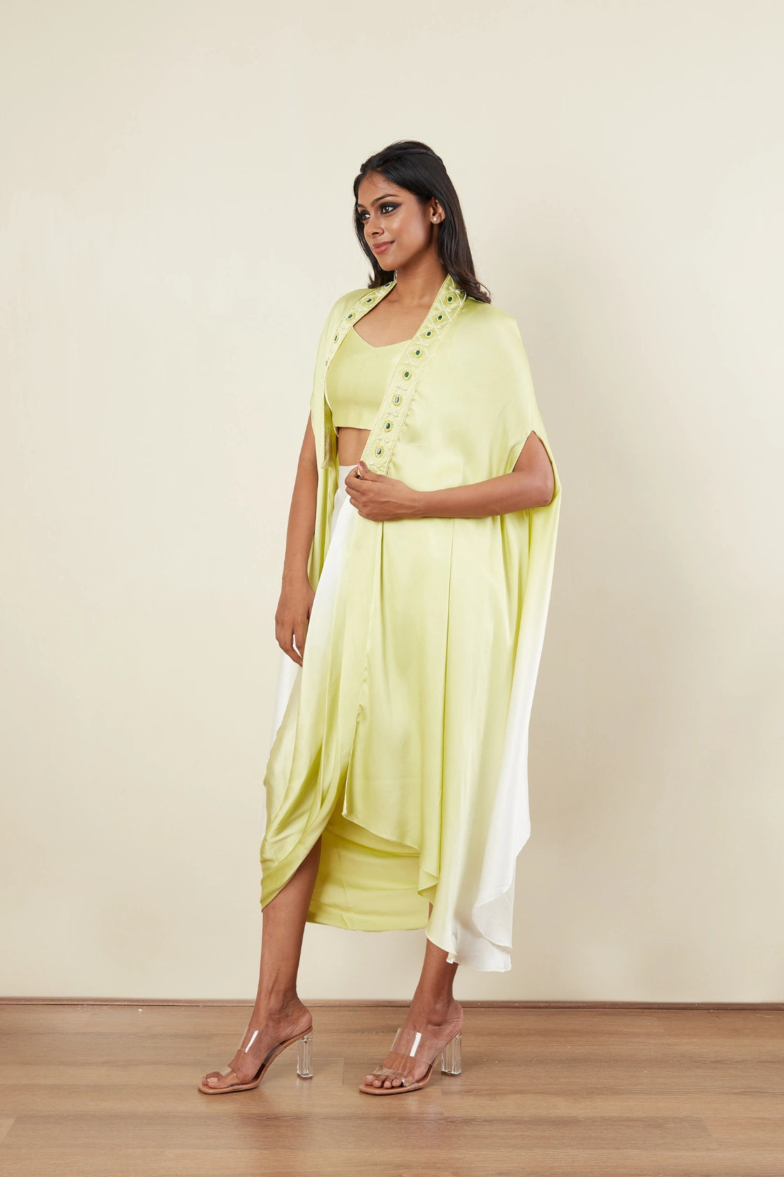 Long Cape -Crop Top -Dhoti Skirt -Emerald Stone, Tubes & Pearl Embroidery
