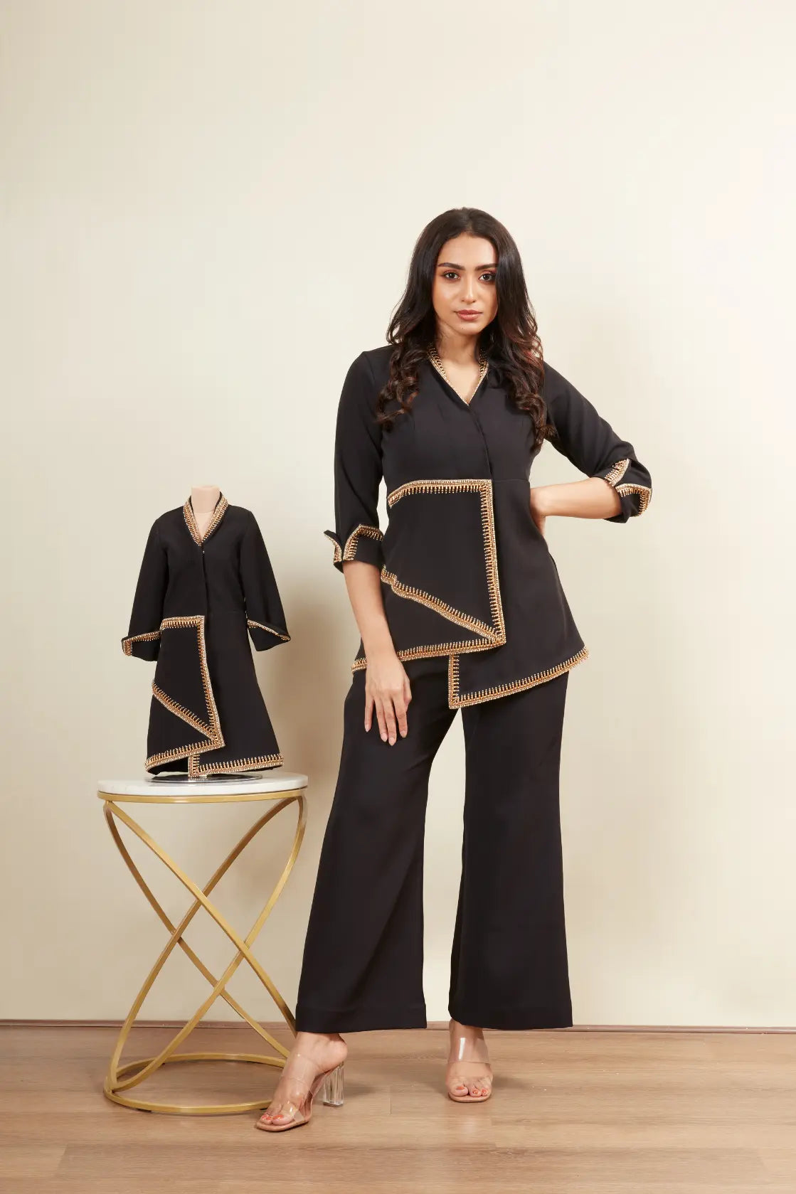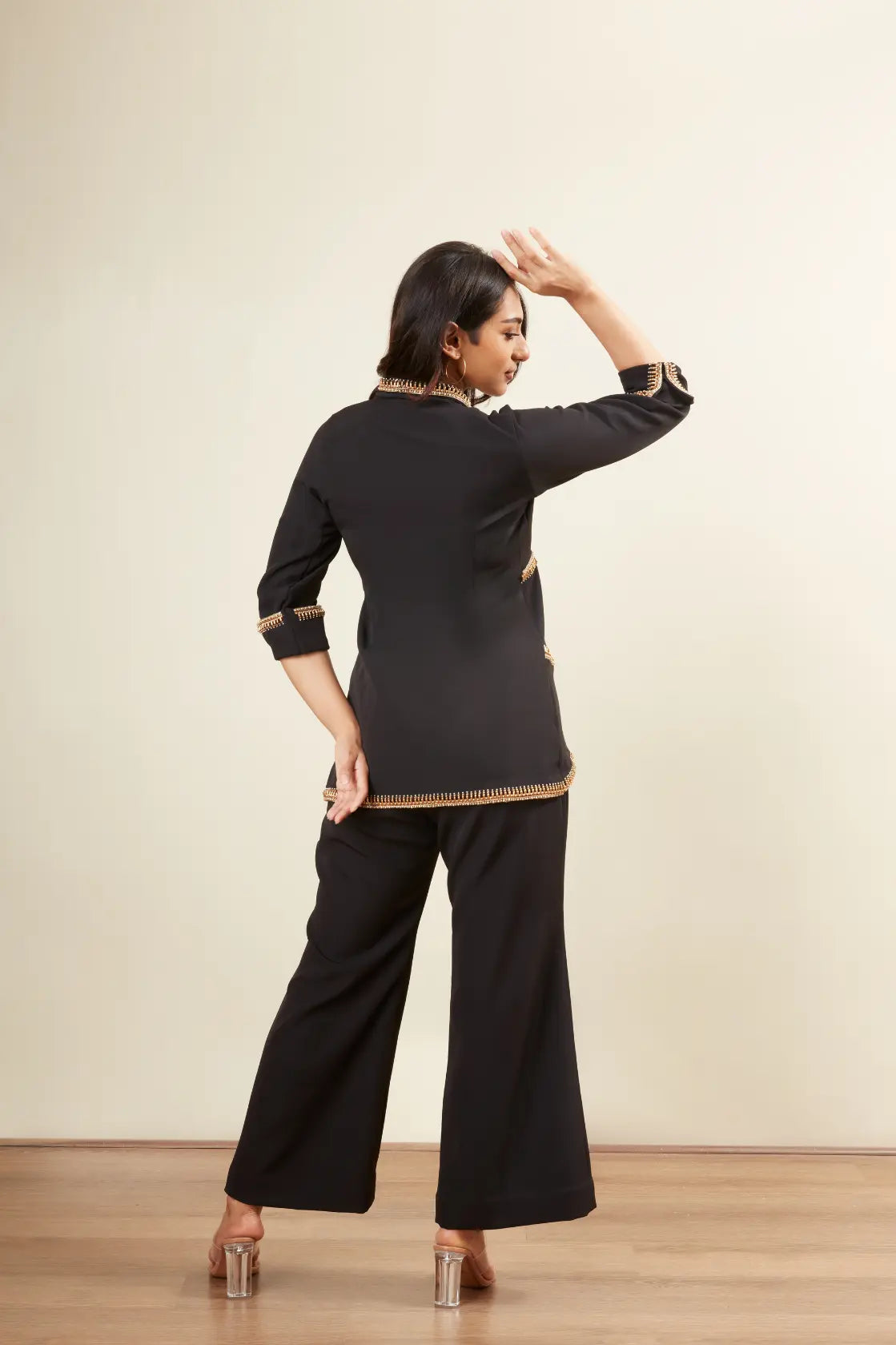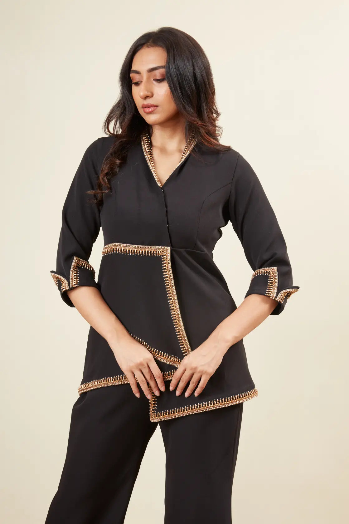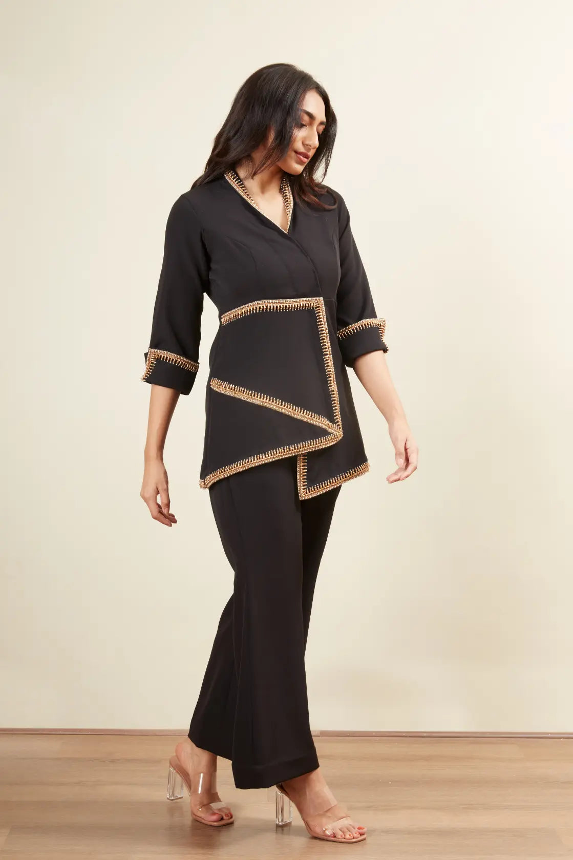 V neck -3/4 th sleeve -Copper bead embroidery -Pearl embroidery -Copper tube work -Flair pants -Floded cuff sleeve