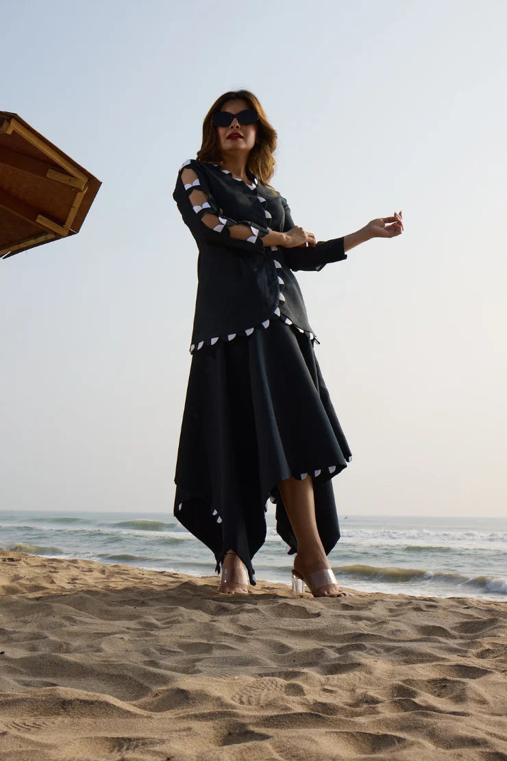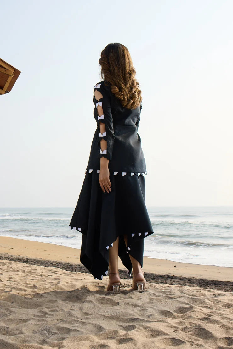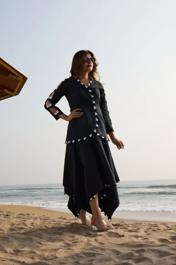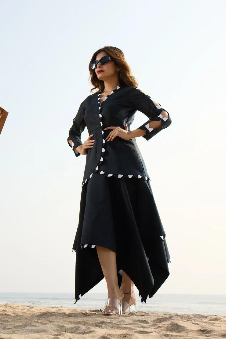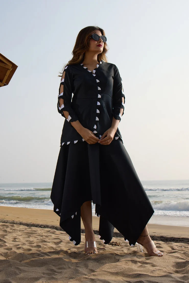 V - Neckline with Black and White Scallop work, 3/4th Sleeves with scallop applique,
