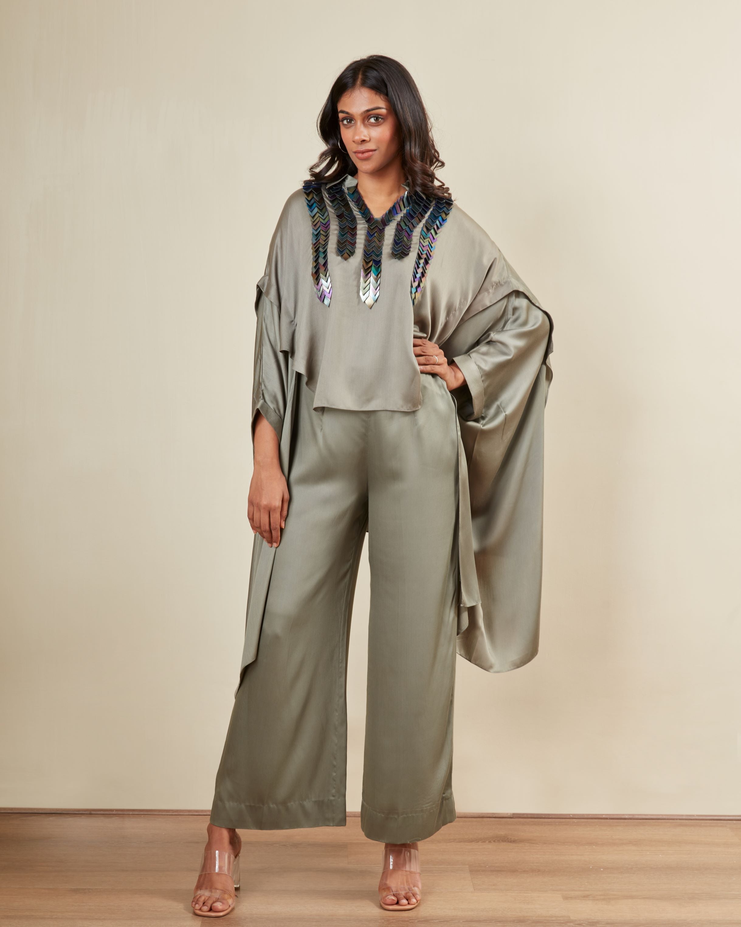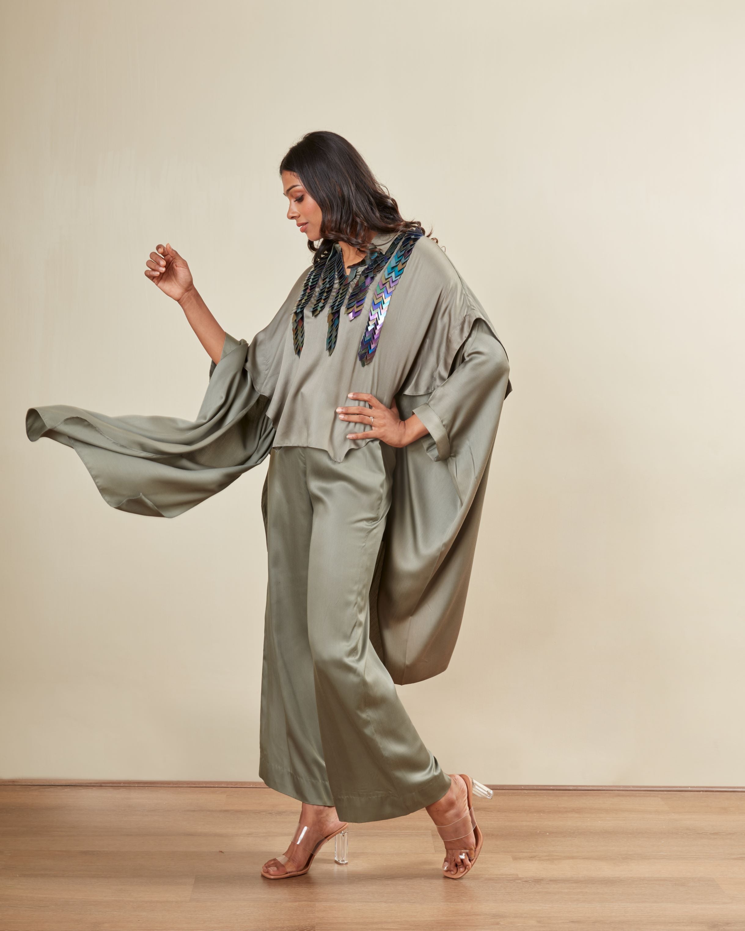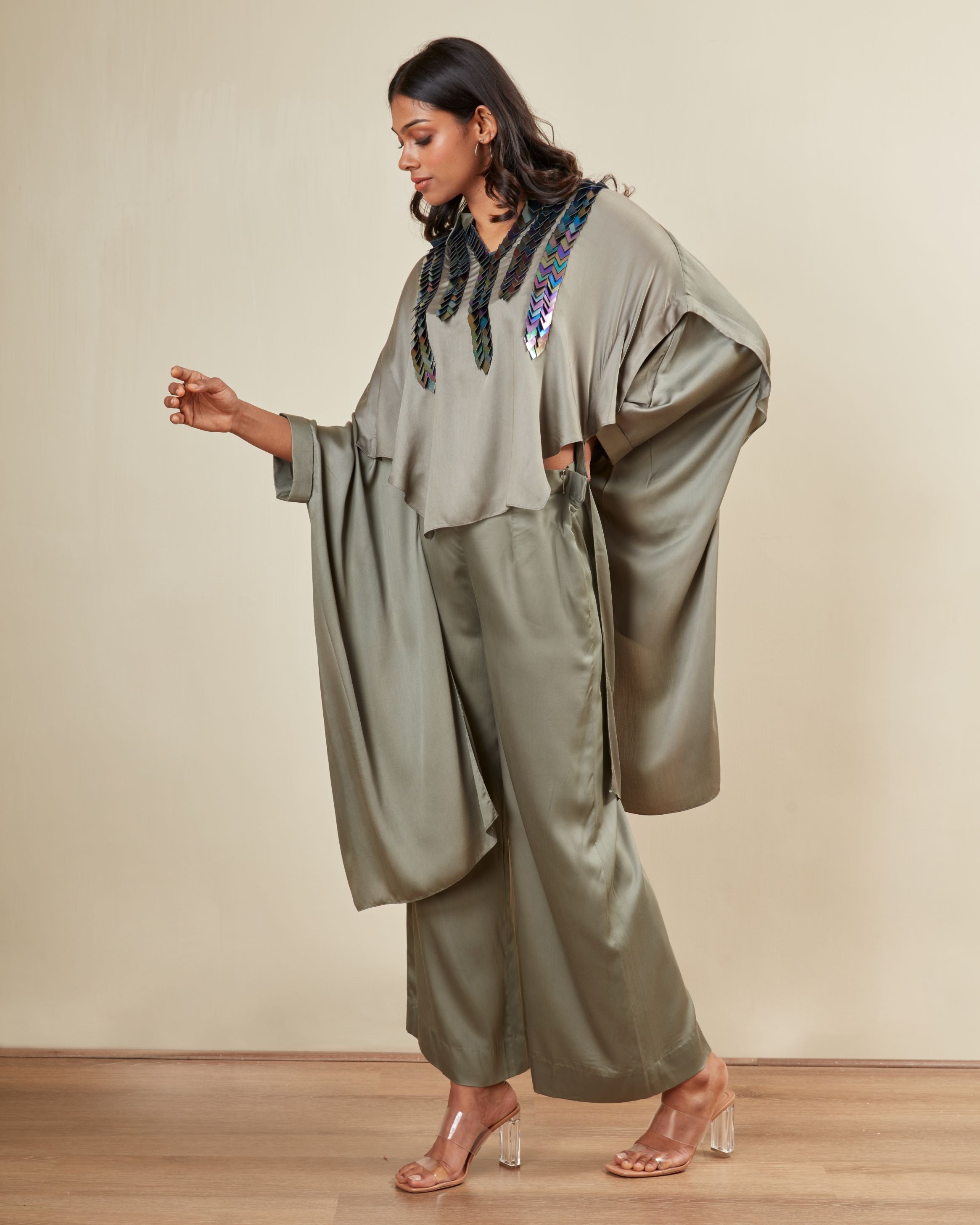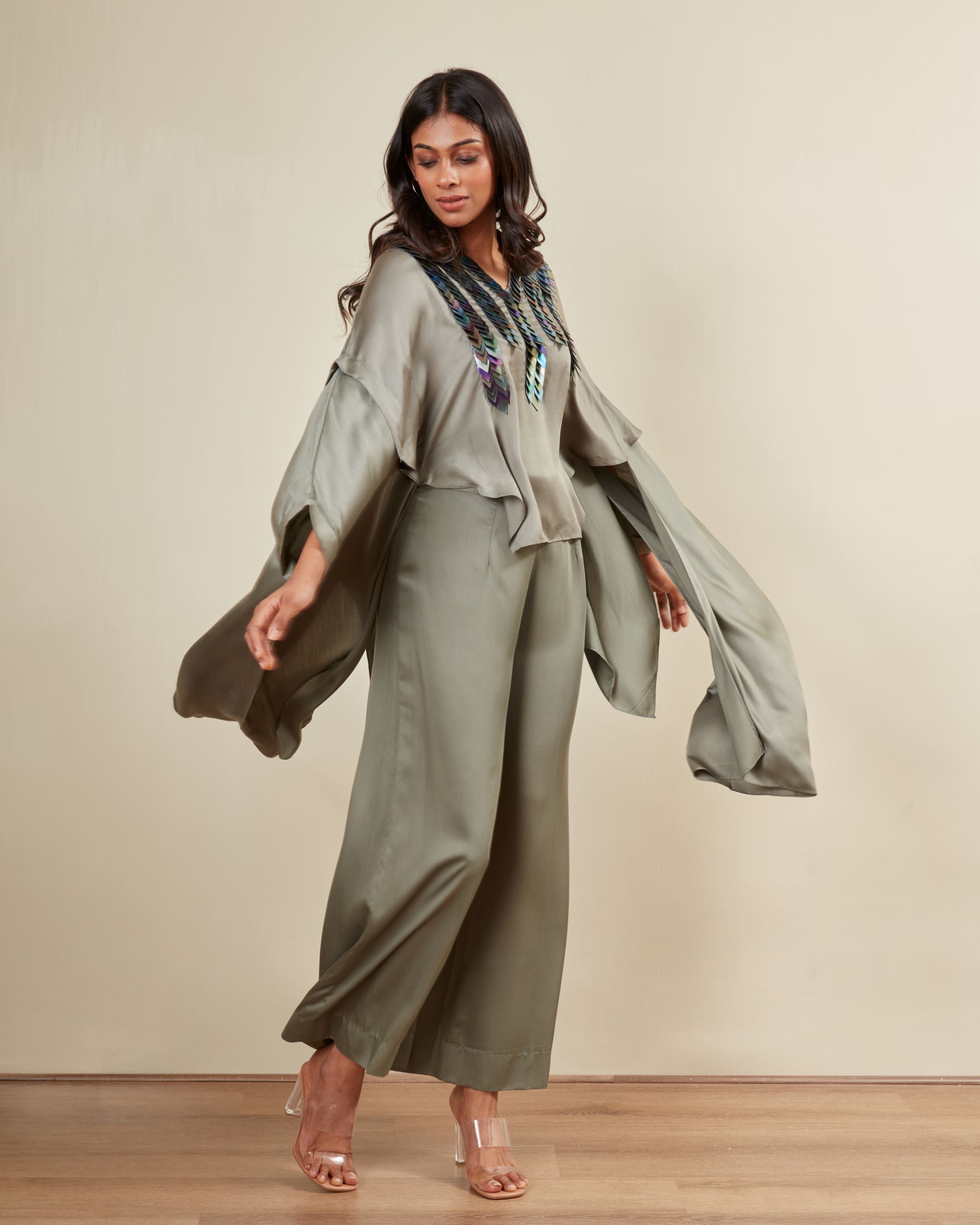 -Metallurgic embroidery -Olive green -Yukata sleeves -Wide leg pants