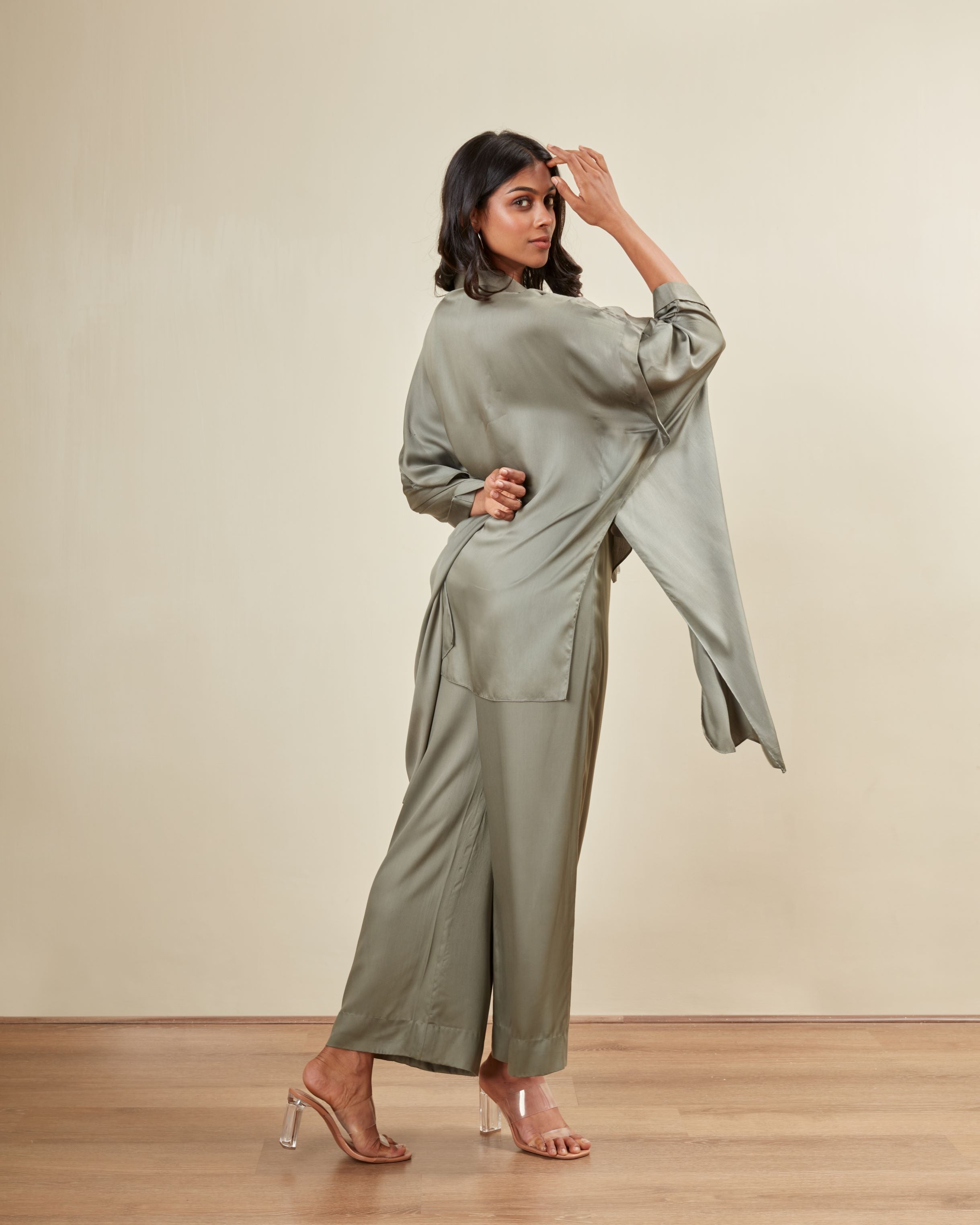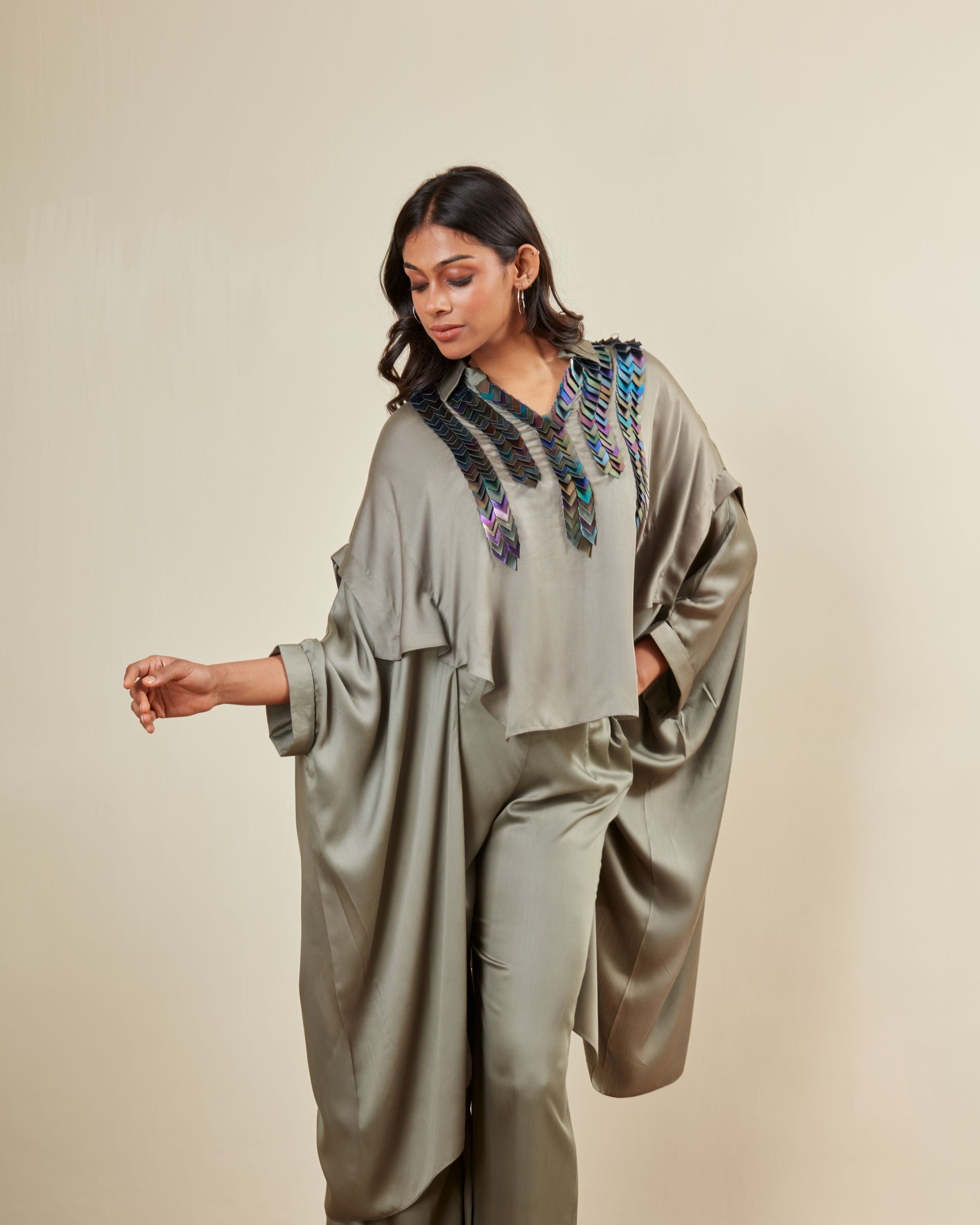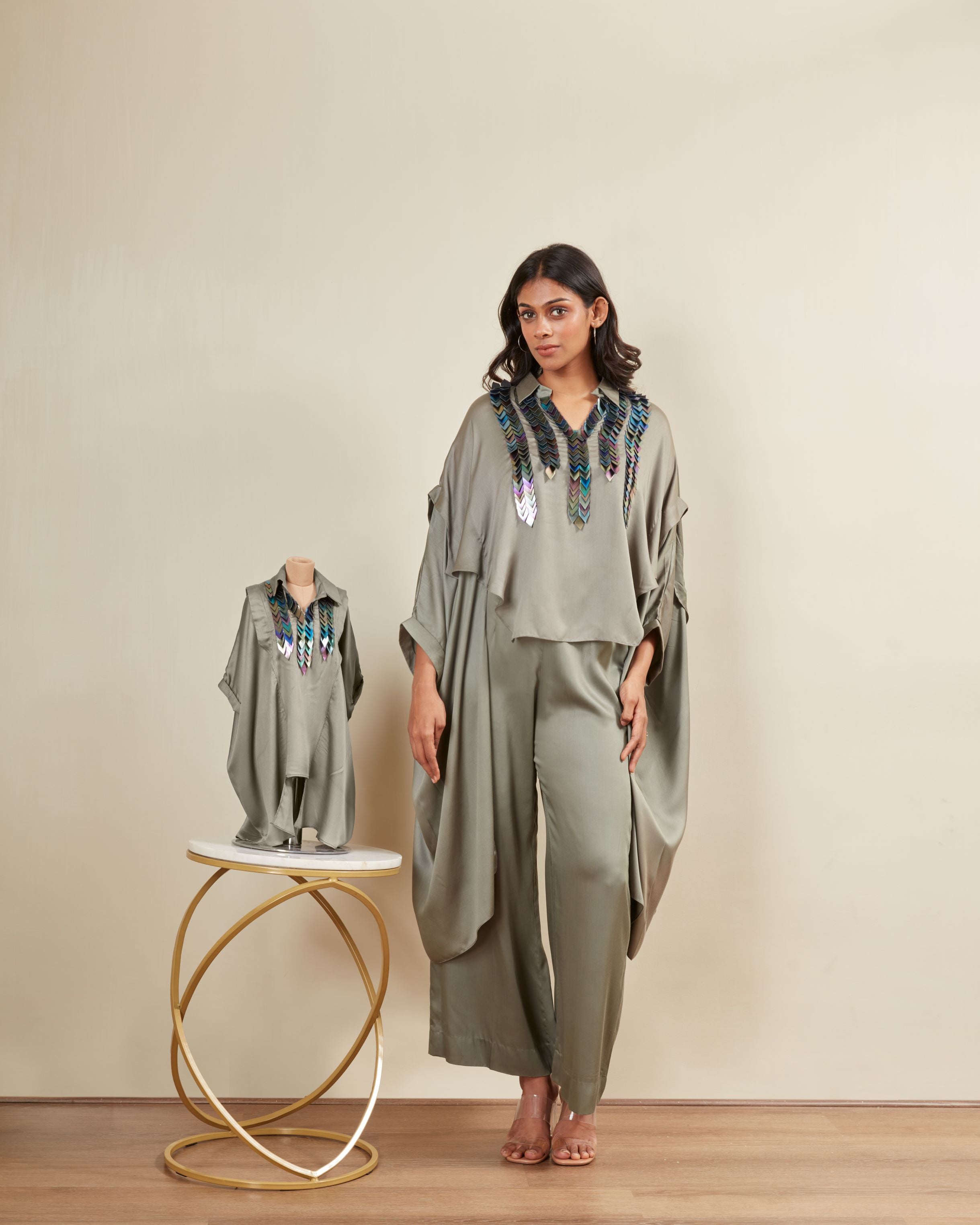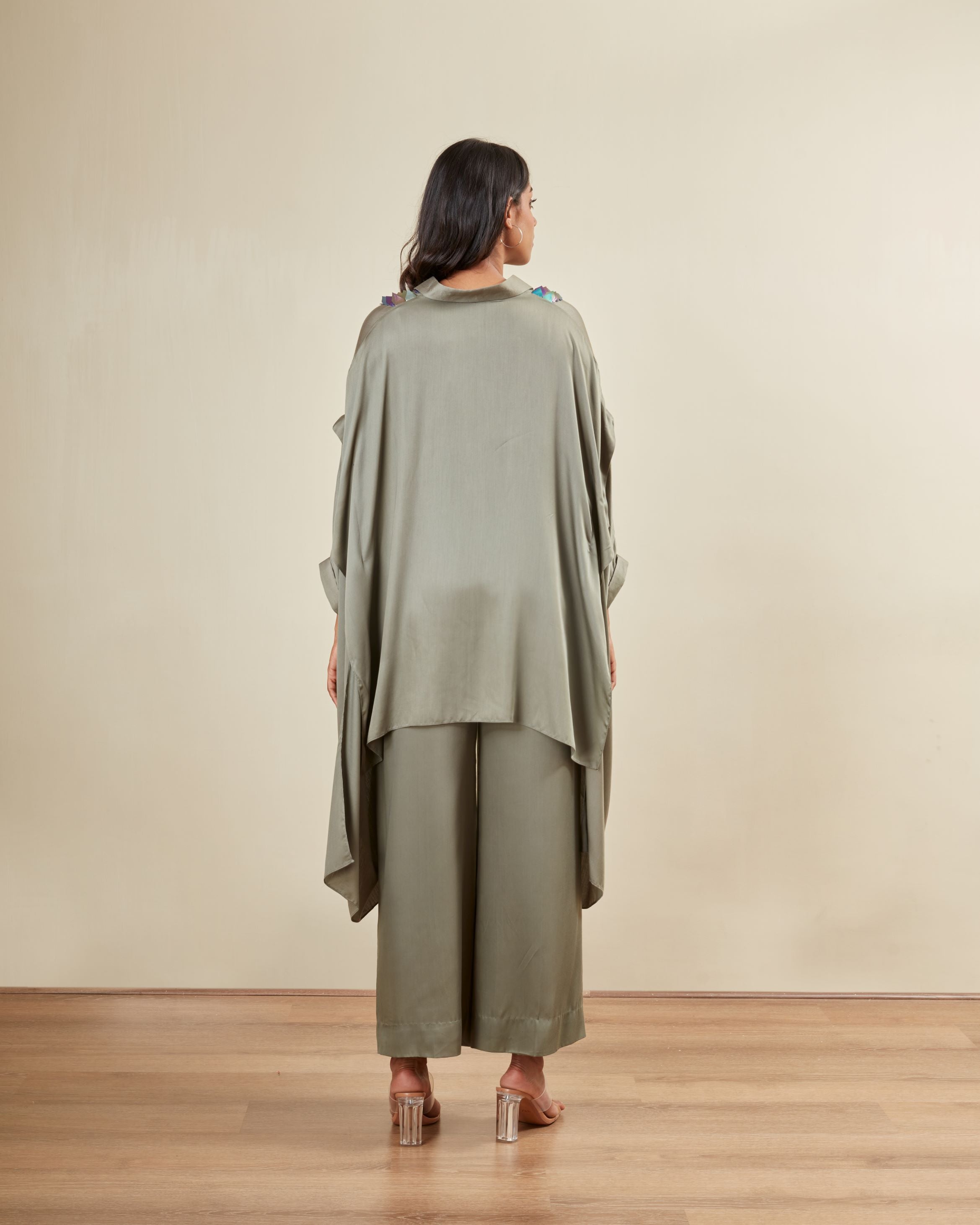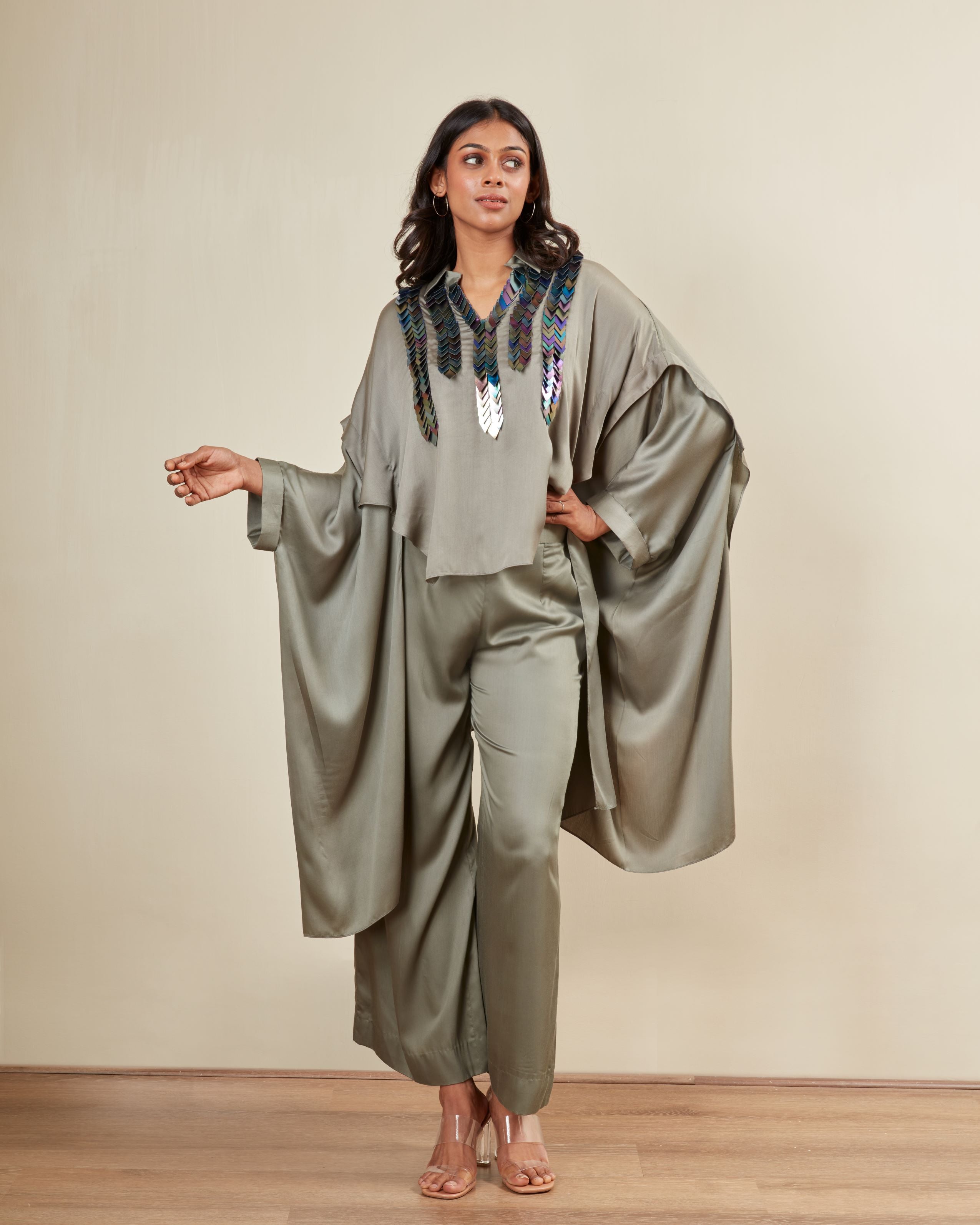 -Metallurgic embroidery -Olive green -Yukata sleeves -Wide leg pants