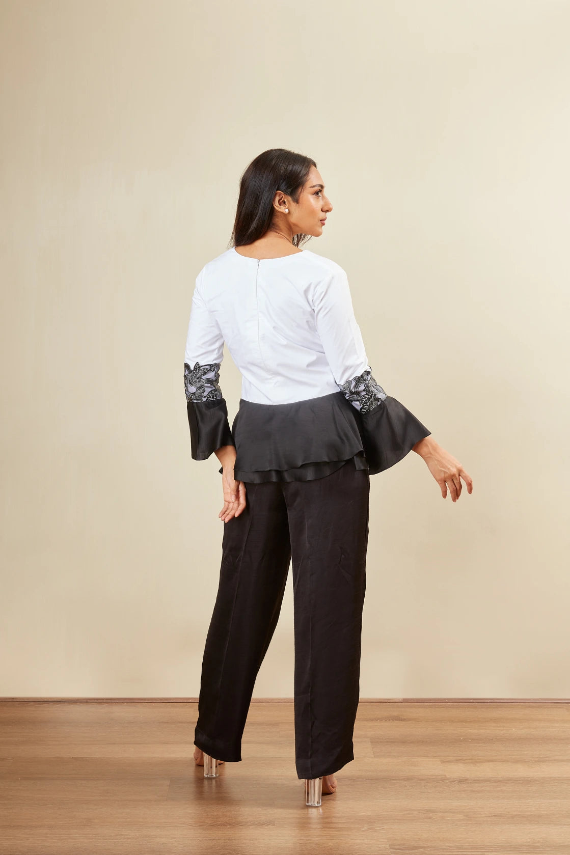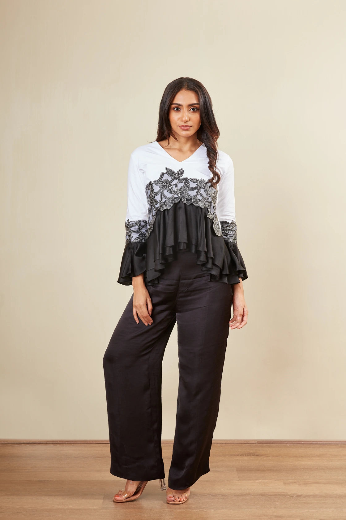 V neck -3/4 th sleeve -Bell sleeve -Peplum -Lazer cut floral motif -Loose pants