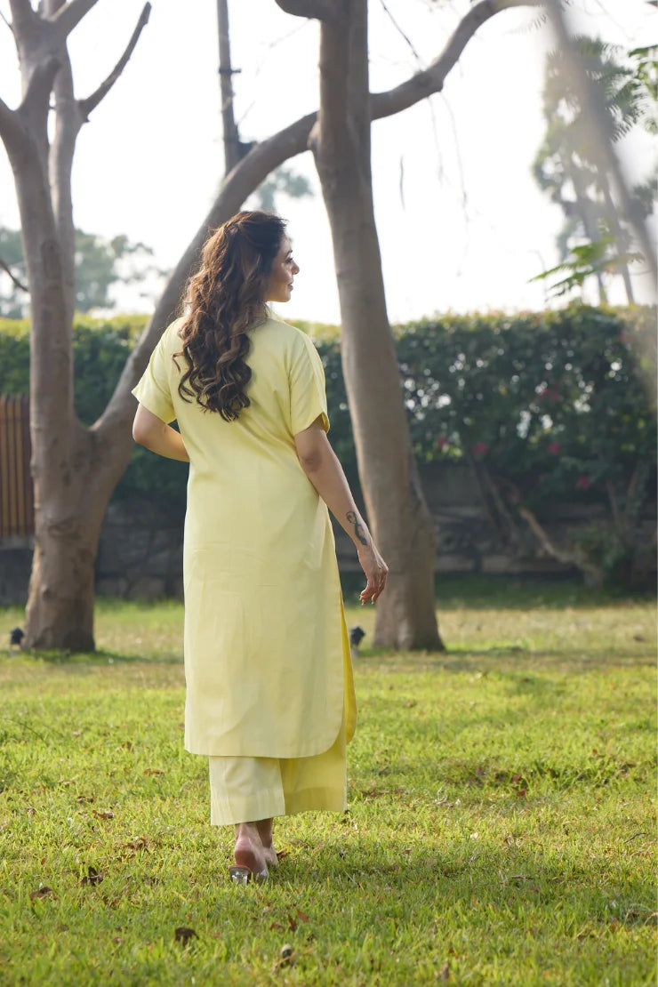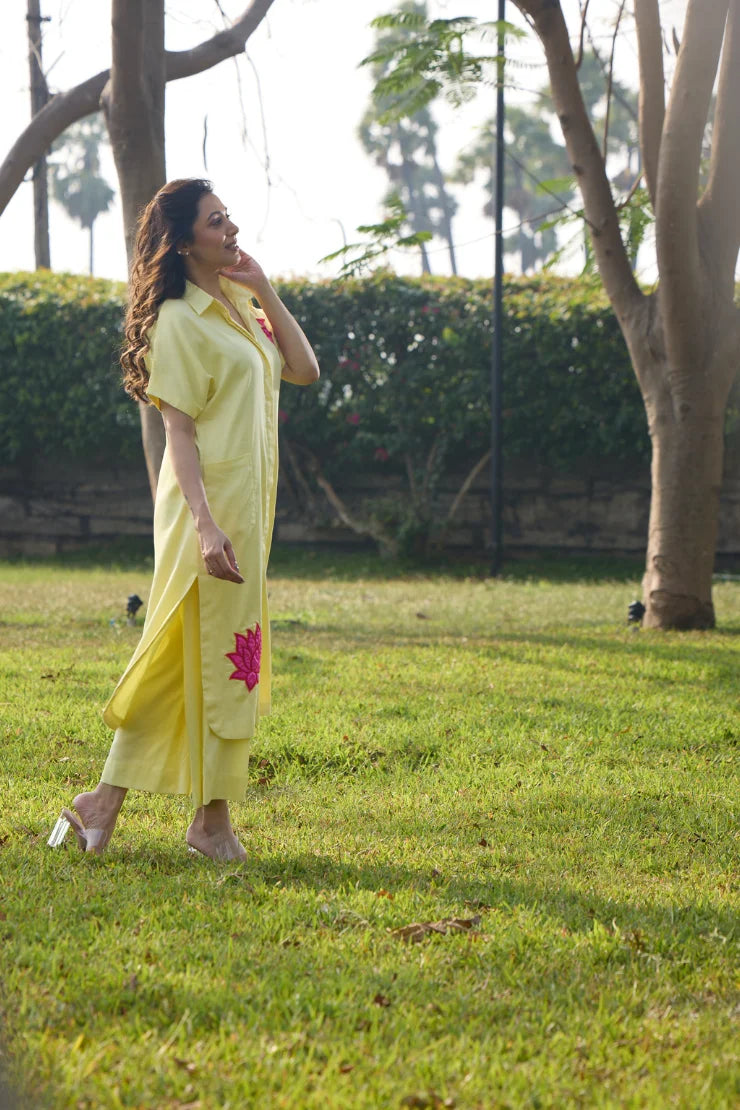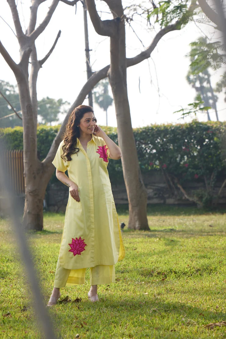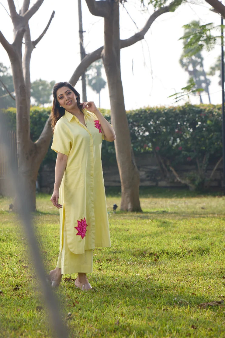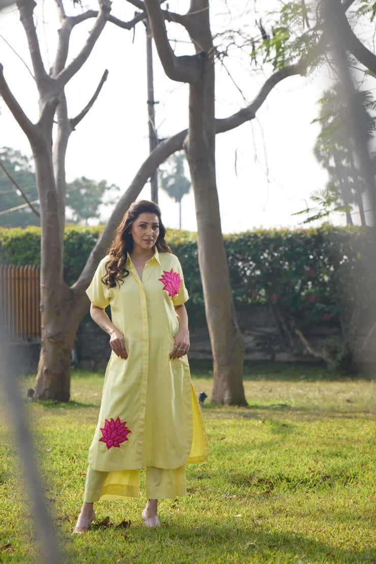 Shirt Collar, Short Sleeves, Front open kurta, Loose plazo pants, Pink Lotus Applique Embroidery