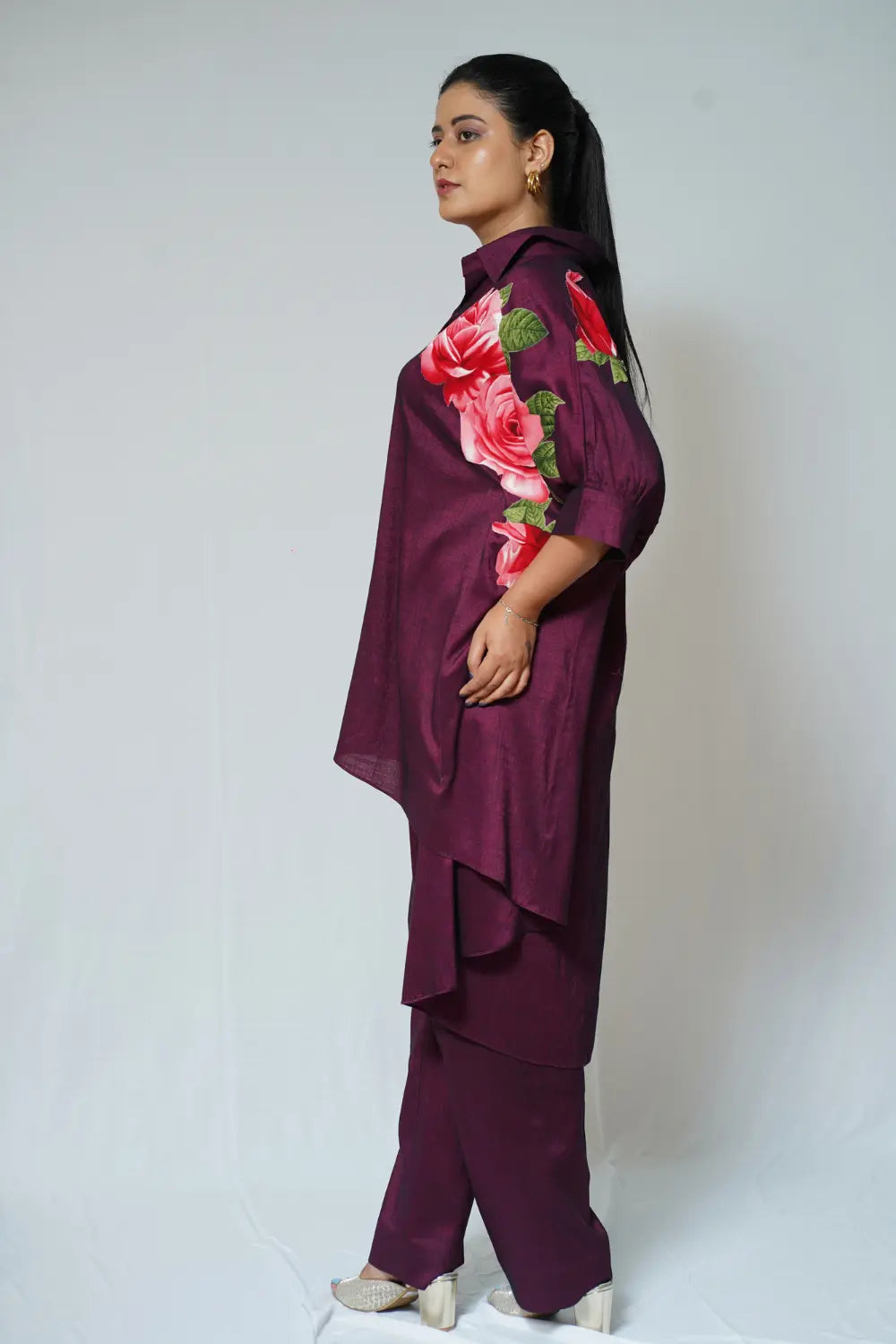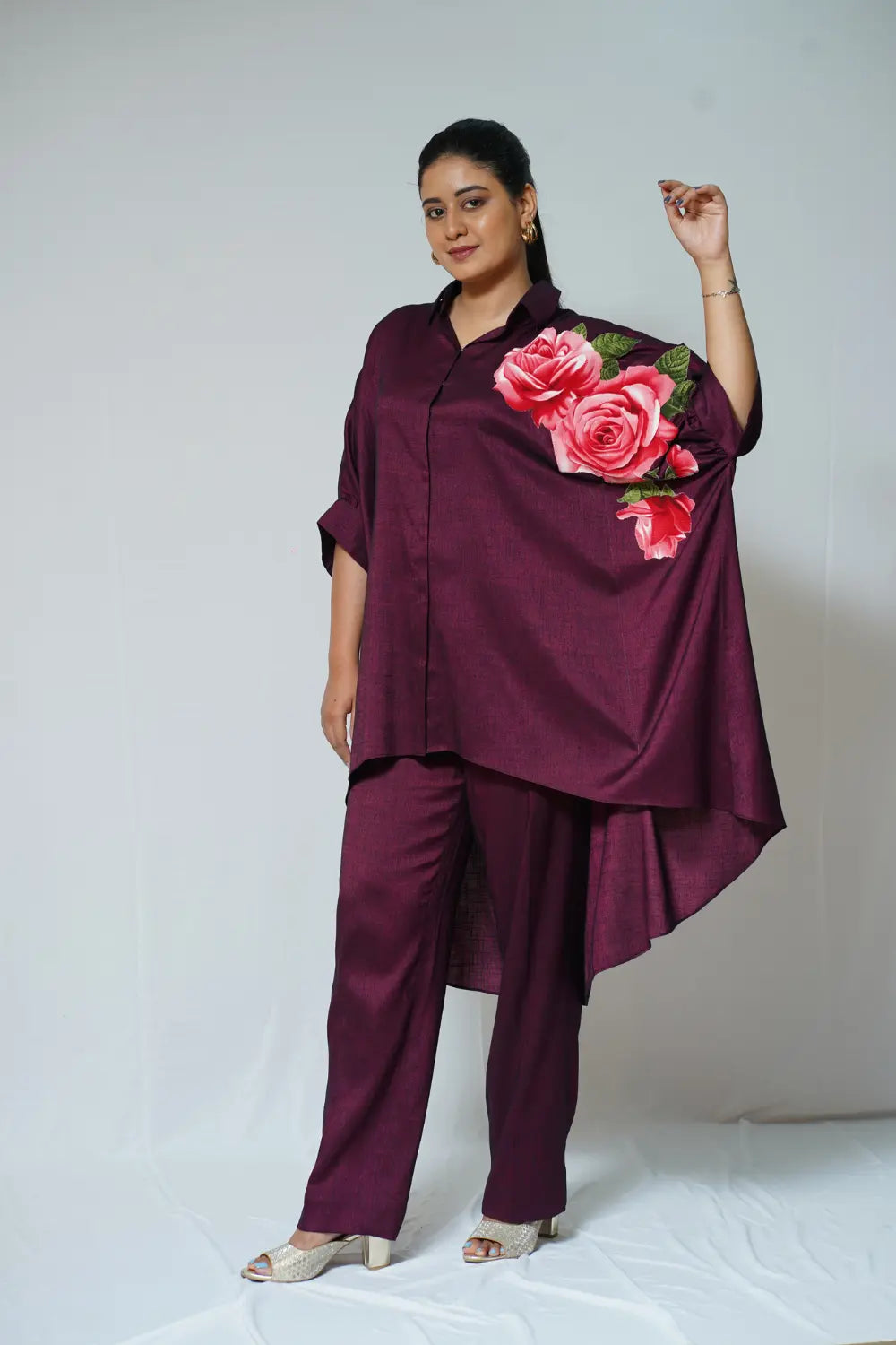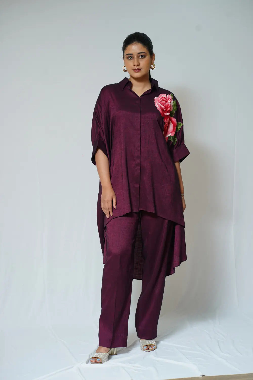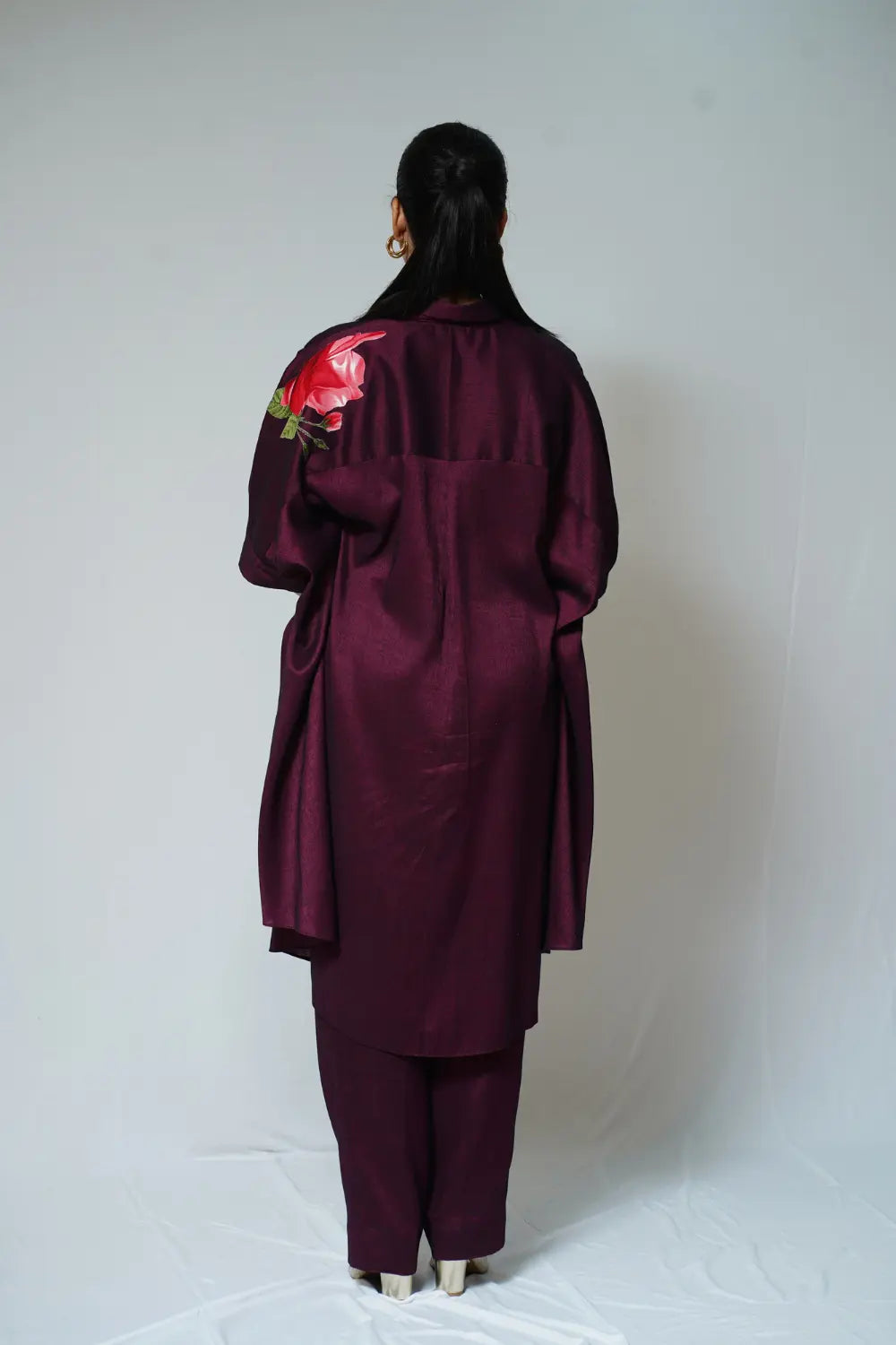 -Floral appliqué -Maroon -High low robe shirt -Front open -Shirt collar -Straight pants