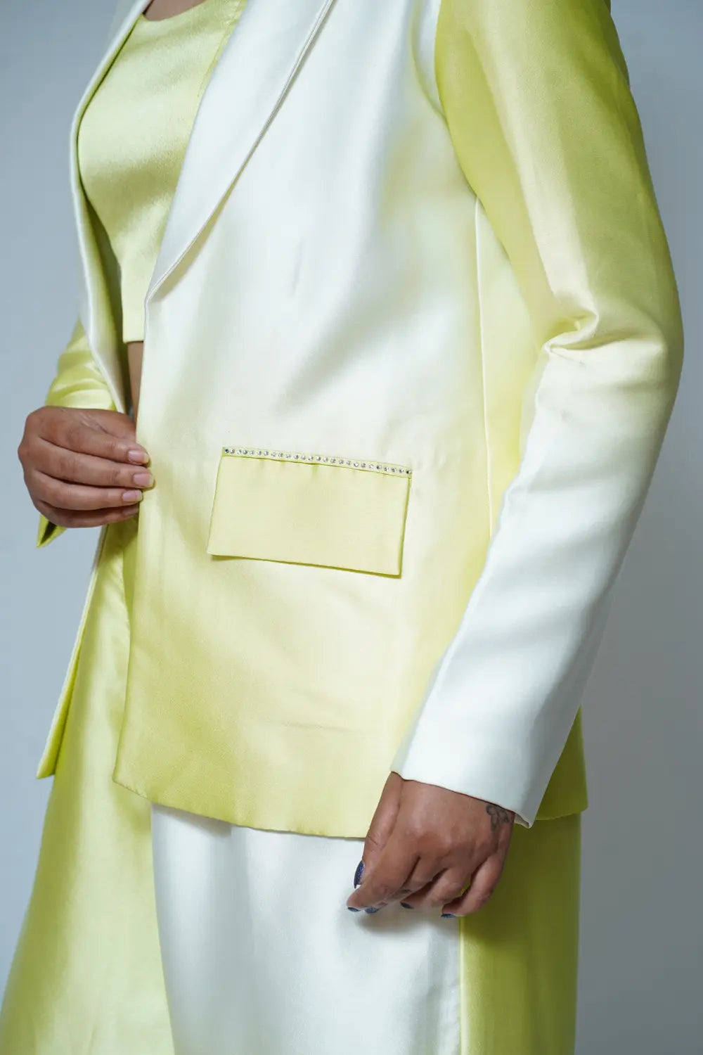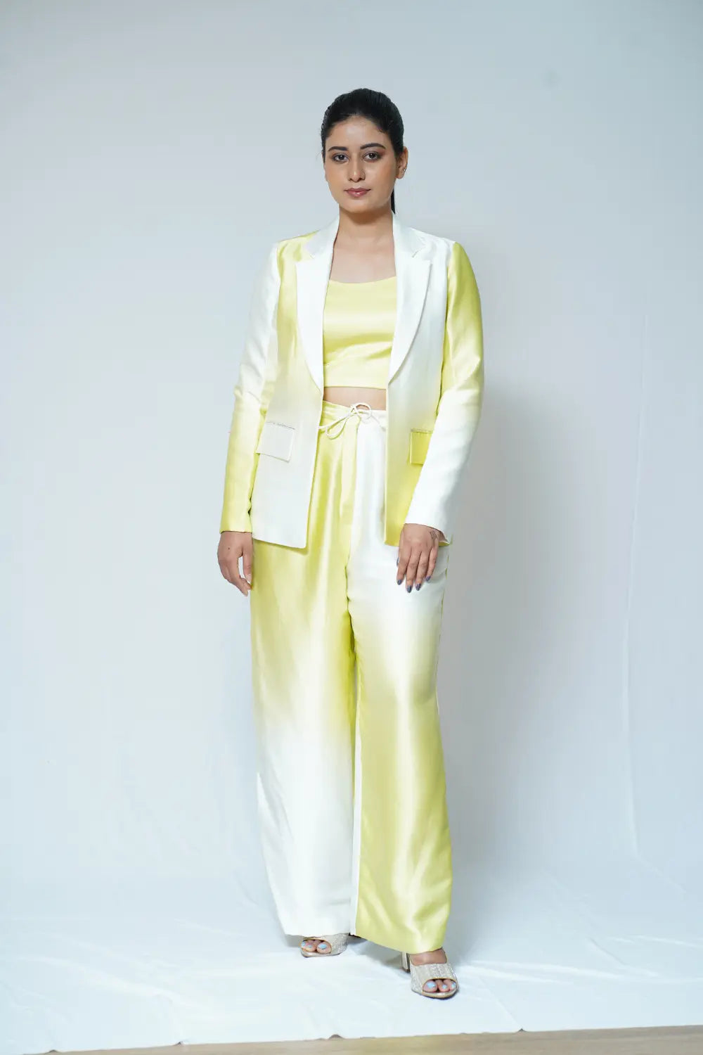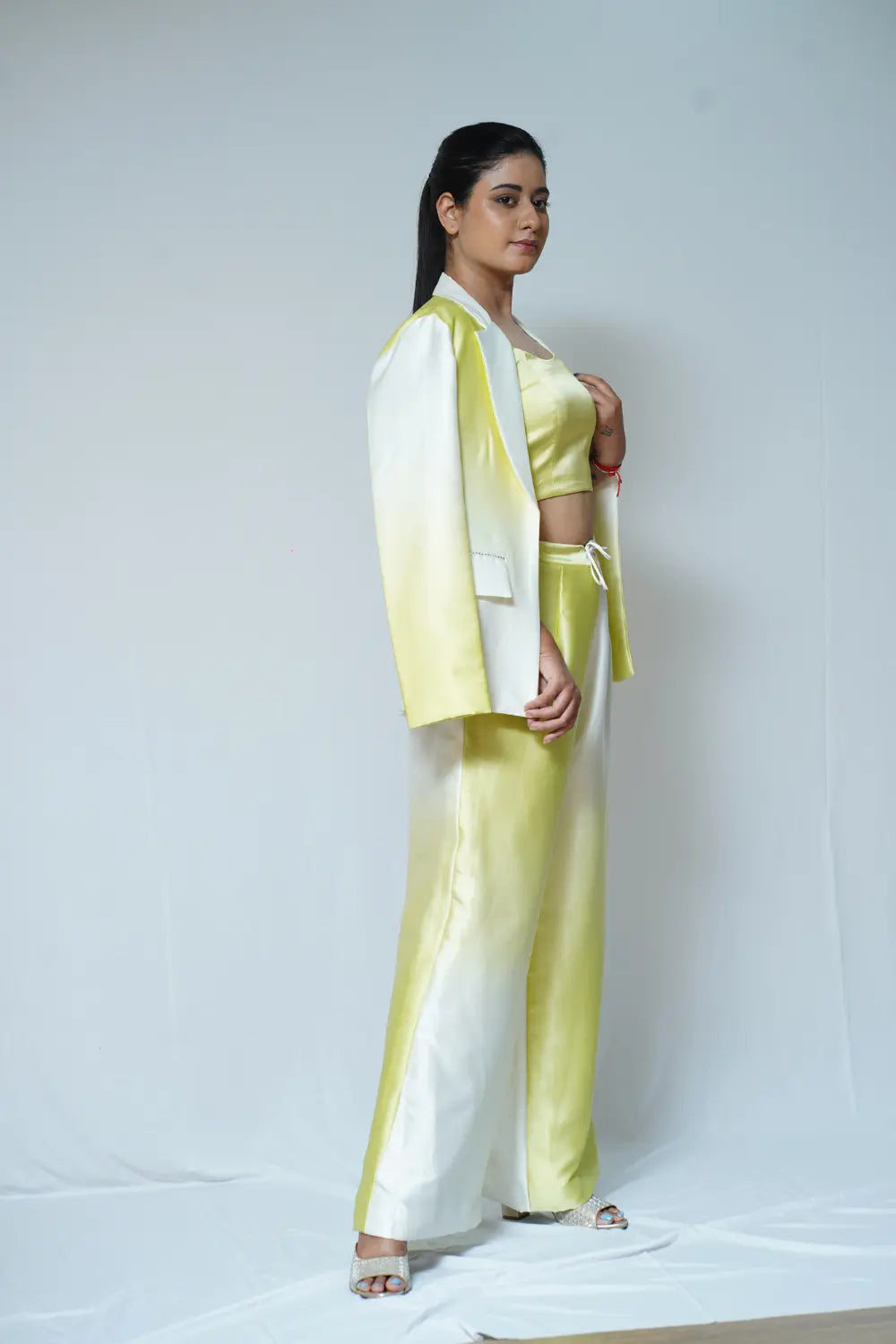 -Satin -Swarovski embelishment -White & Green ombre -Blazer Jacket -Crop top -Straight leg pants -Elastic waist band
