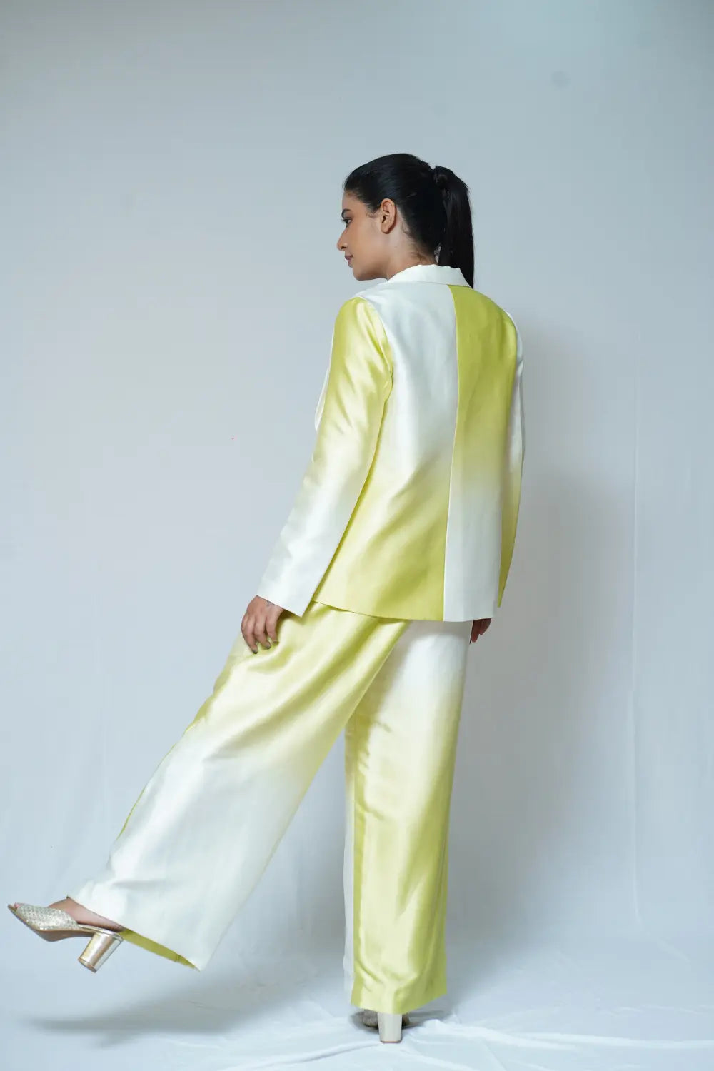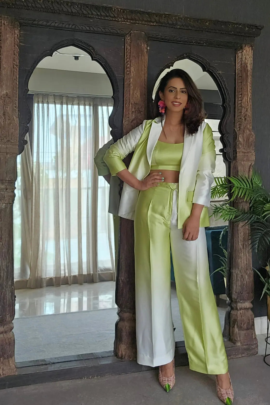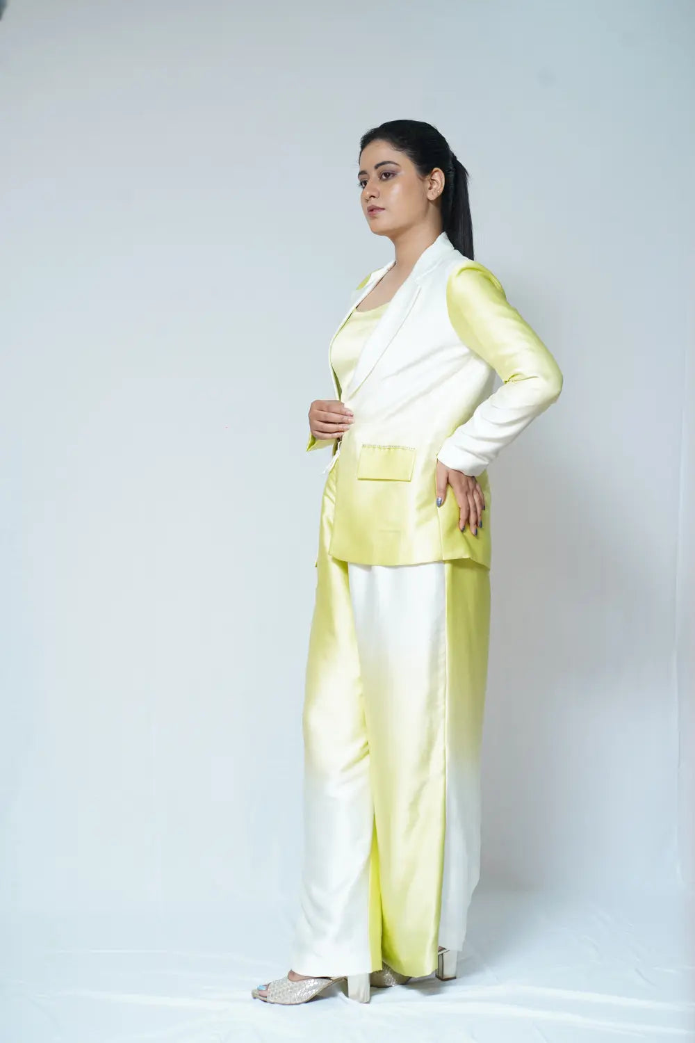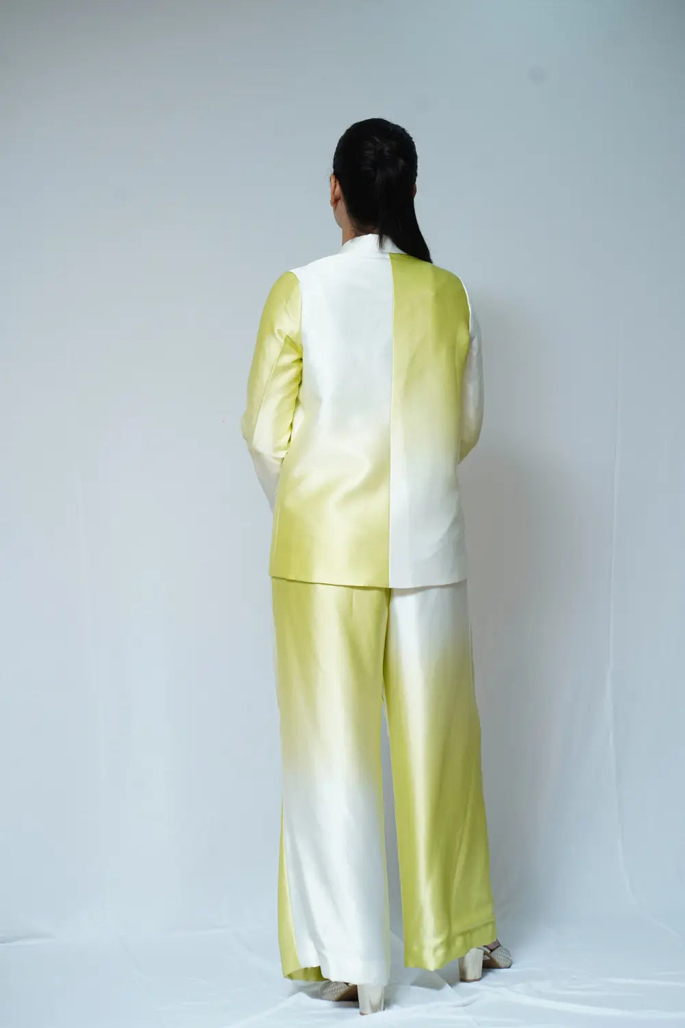 -Satin -Swarovski embelishment -White & Green ombre -Blazer Jacket -Crop top -Straight leg pants -Elastic waist band