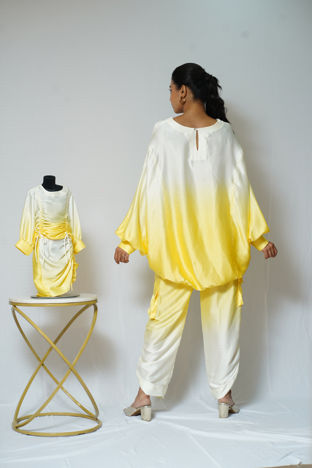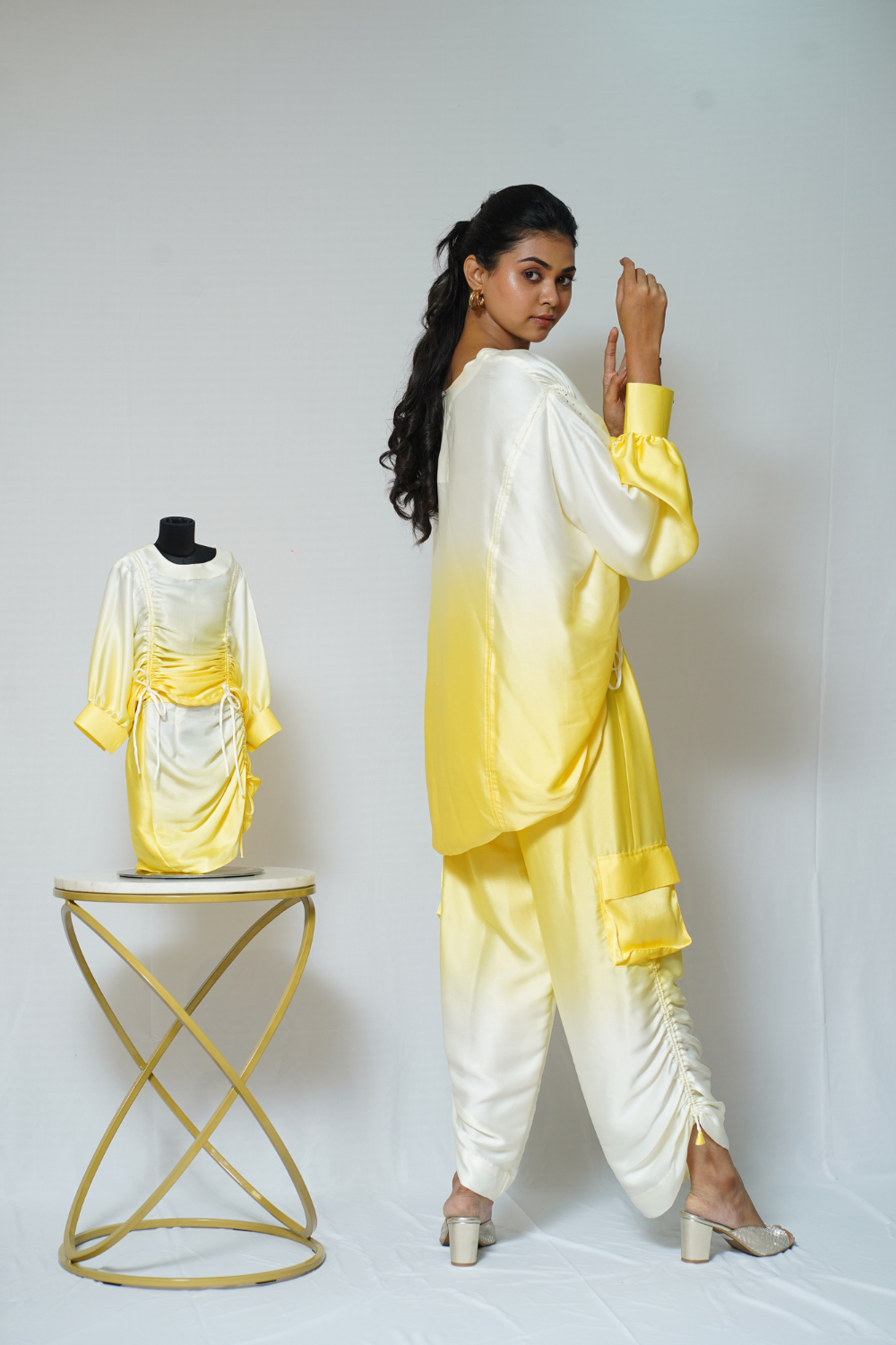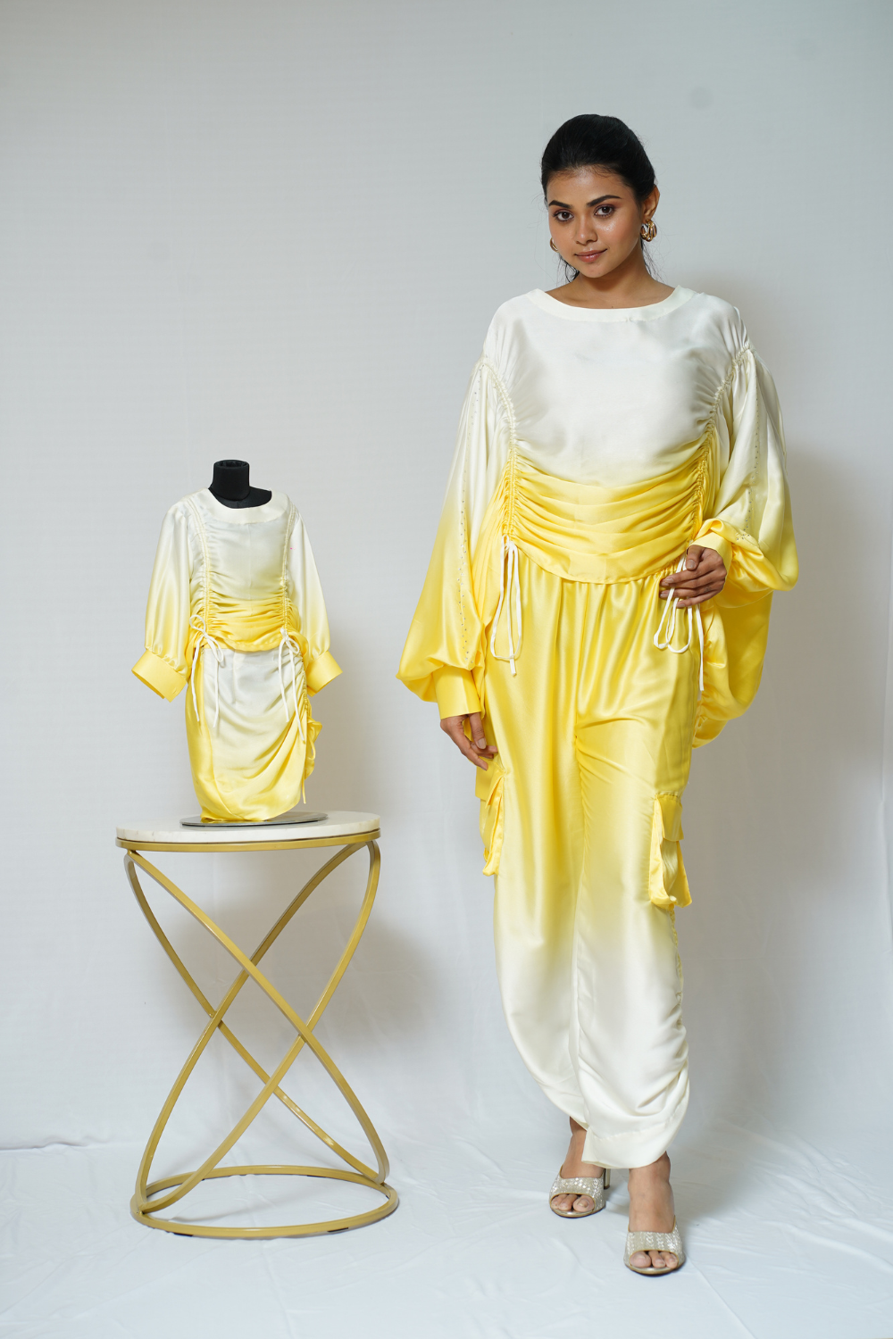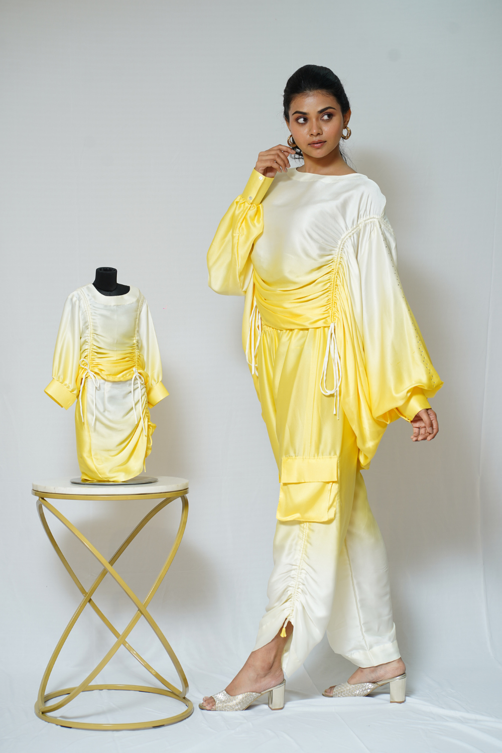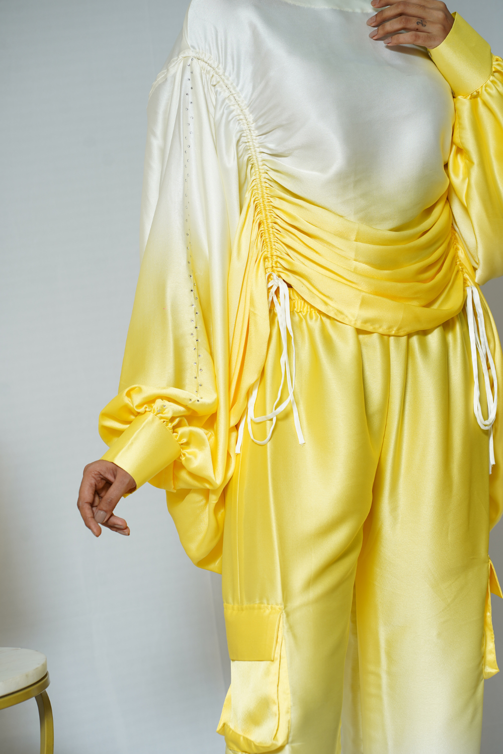 -Satin -Swarovski embelishment-White & yellow ombre -Tie up in front and back Full sleeves top -Round neck -Side pockets Slim cargo pants -Tie up in the side of pants -Elastic waist band
