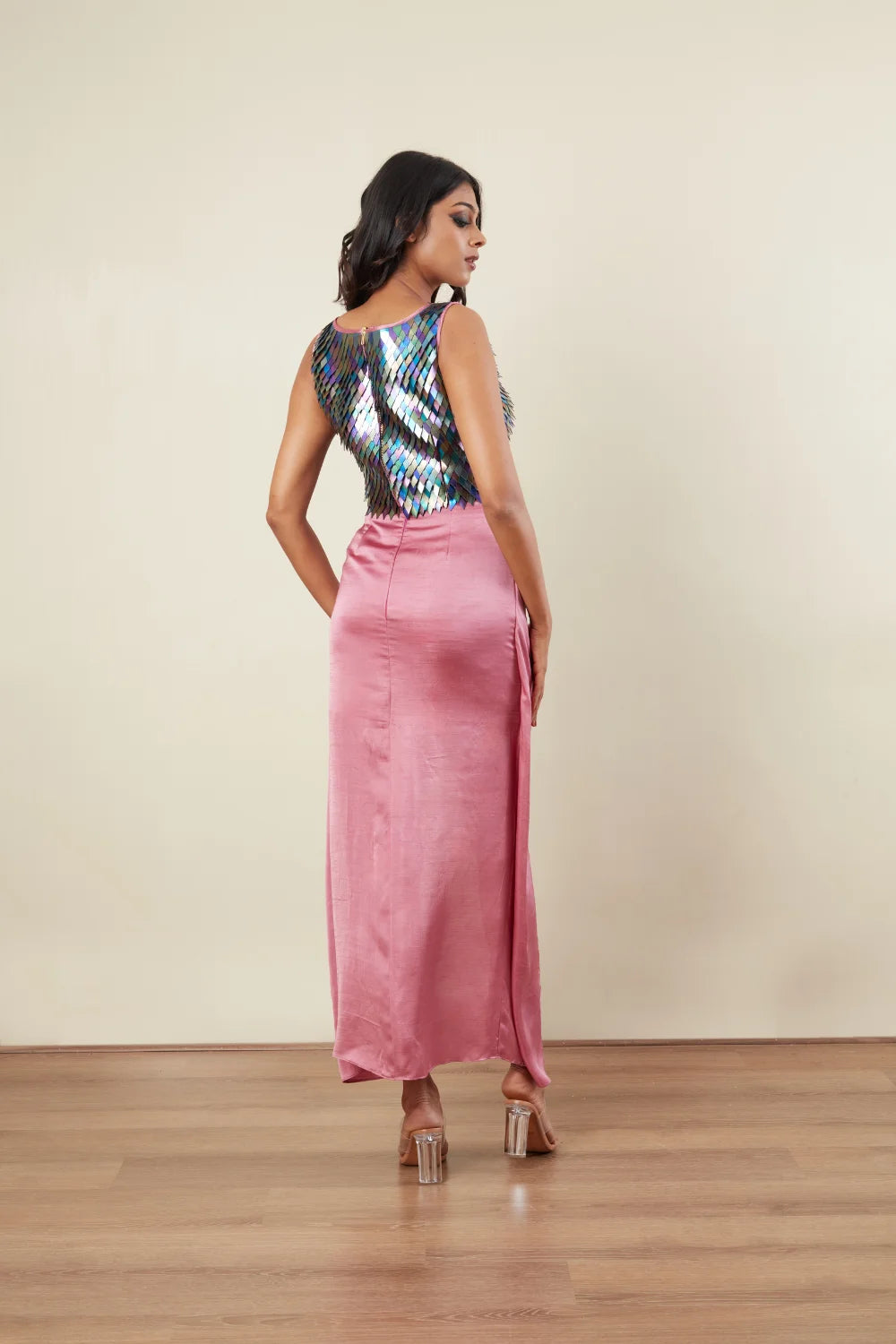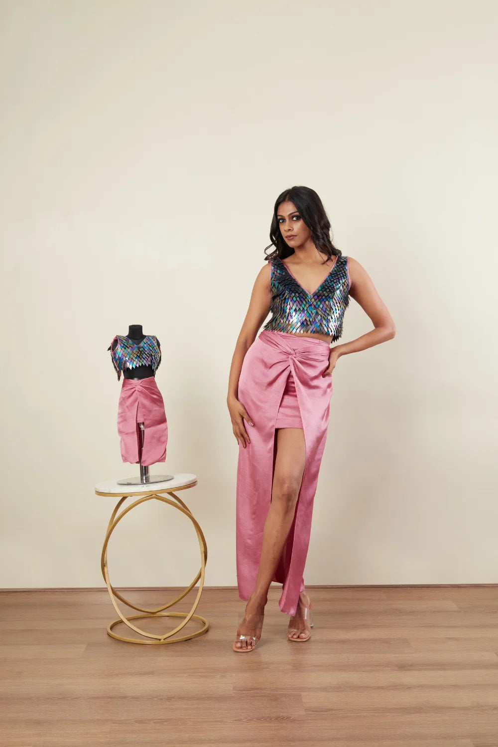Multi Colour PU Embroidery wide V neck Crop Top Sleeveless Drape Skirt