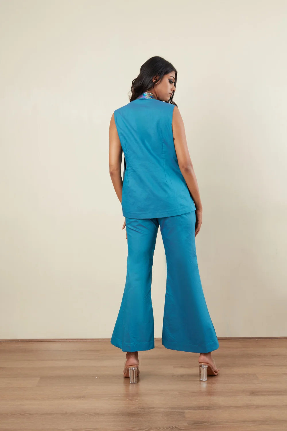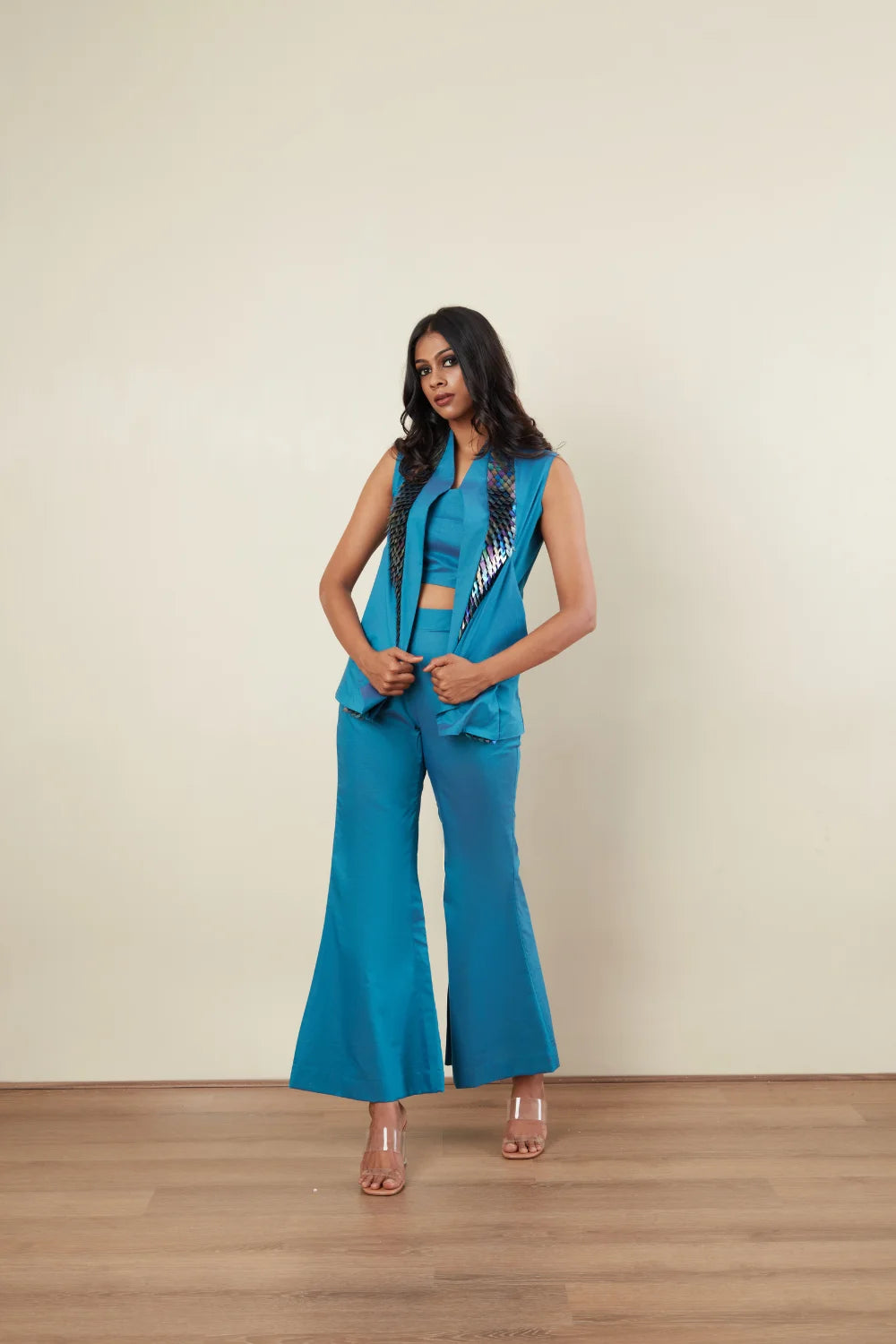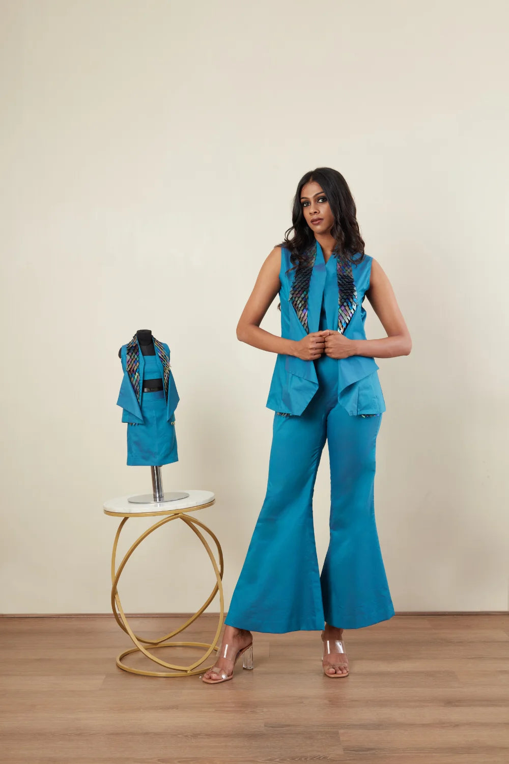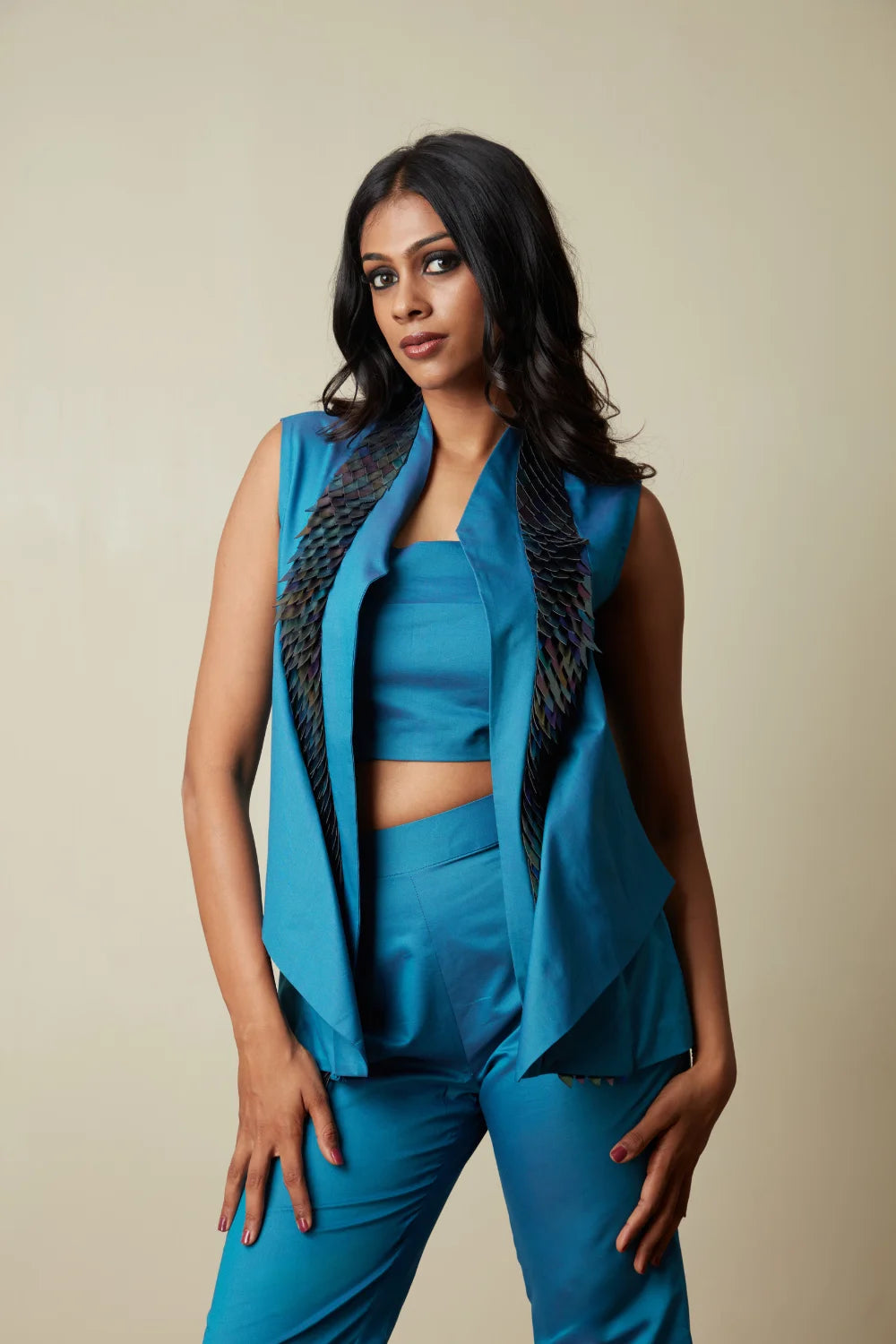 Crop Top Jacket Hipster Pants Sleevless Multi Colour PU Embroidery