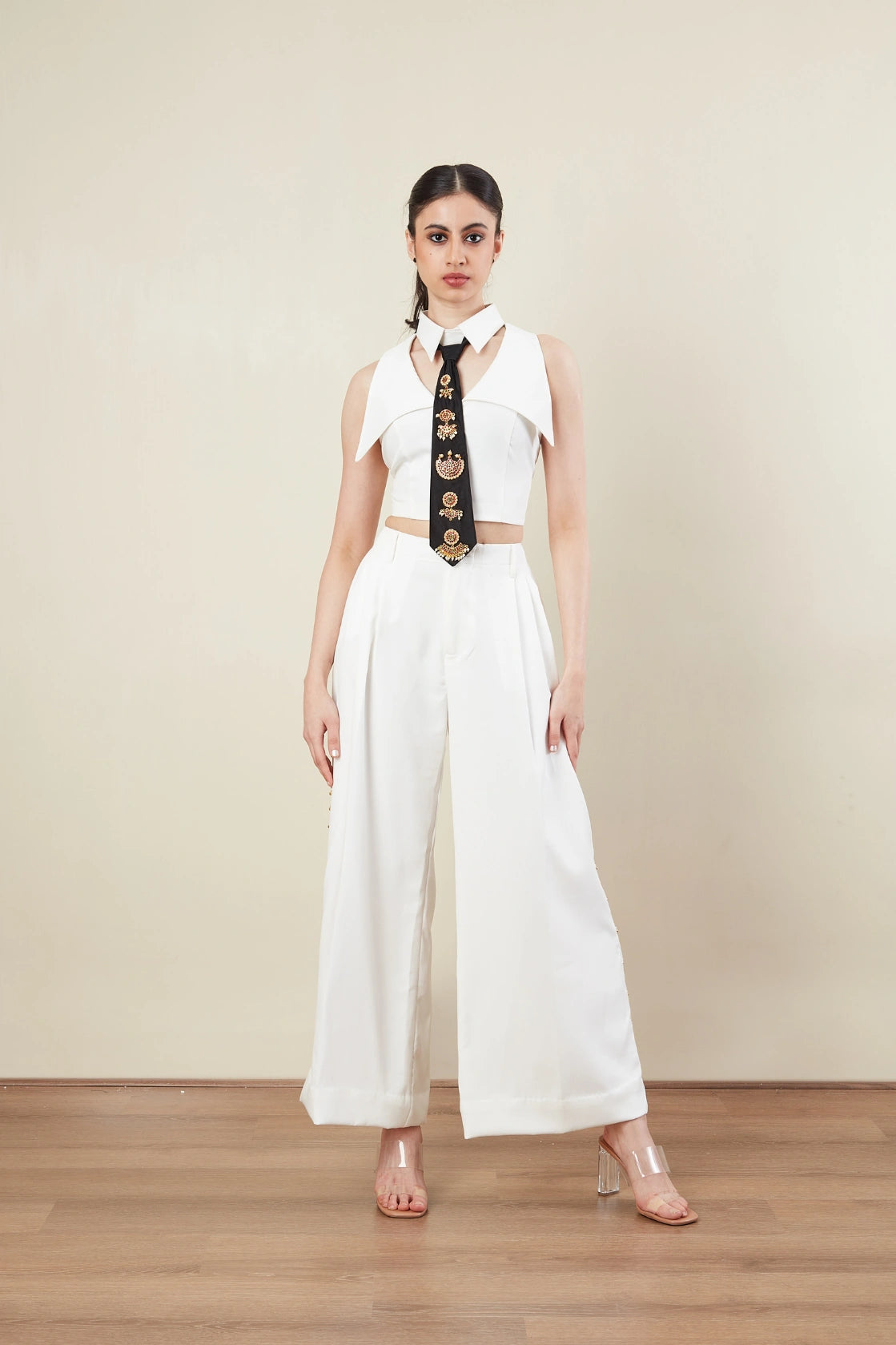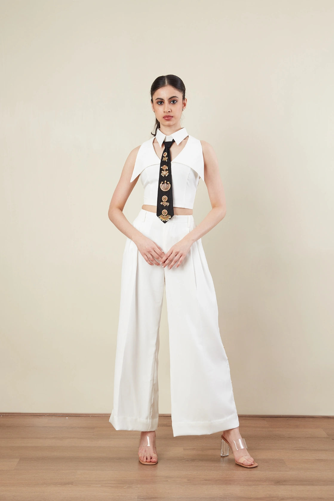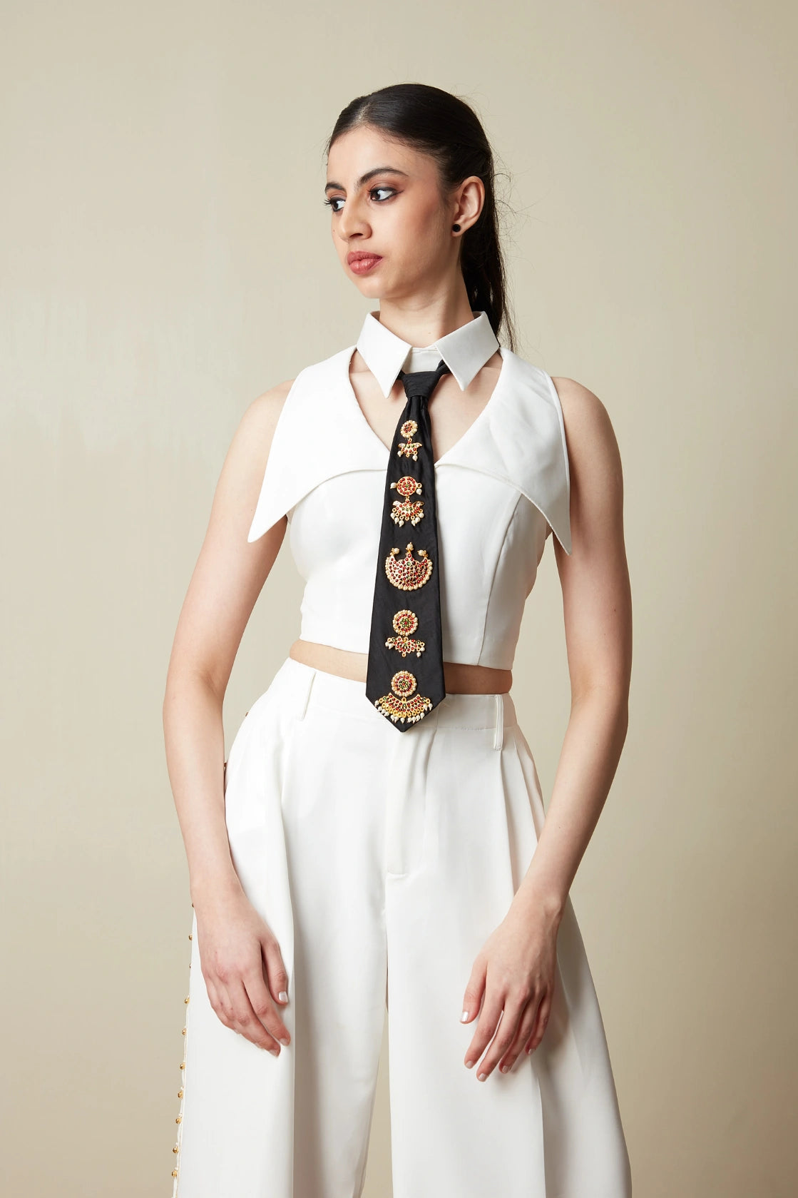 Oversize Collar -Crop Top -Collar with tie -Pleated trousers -South Indian Jewellery Embellishment