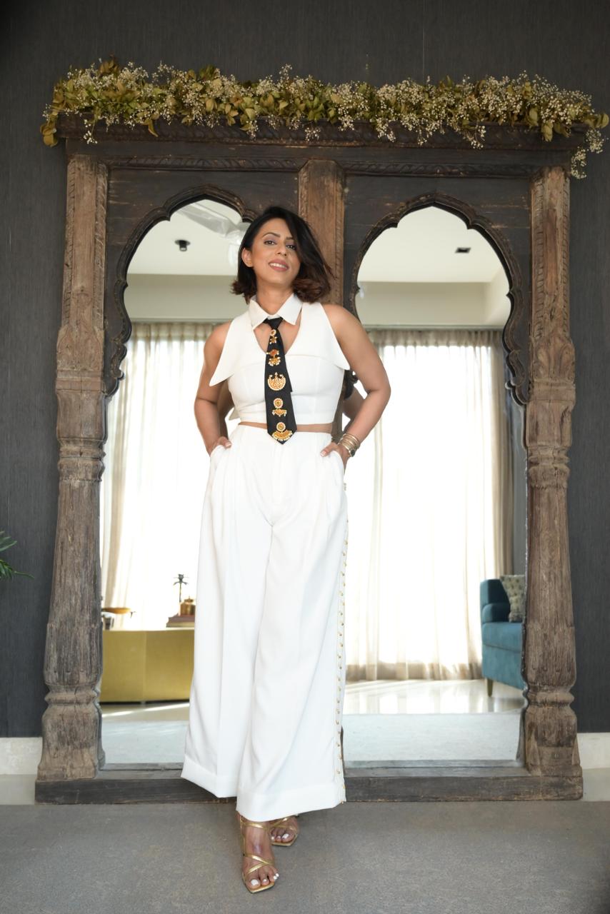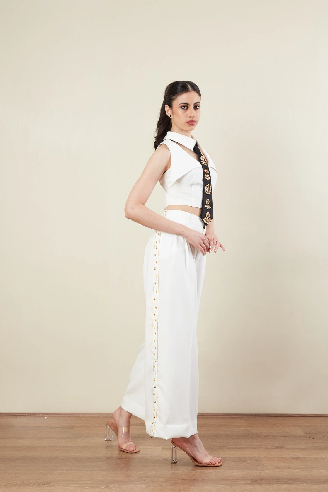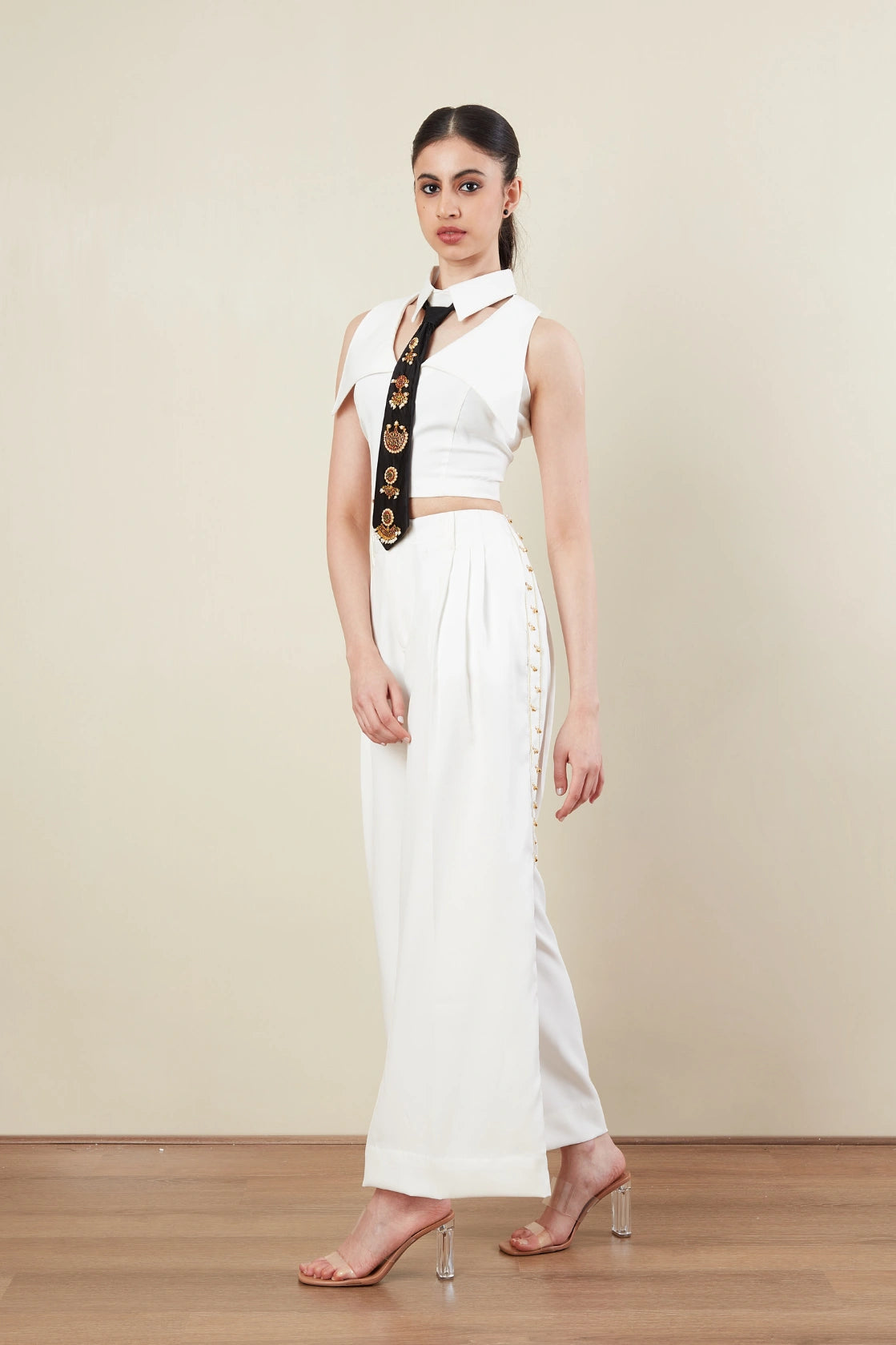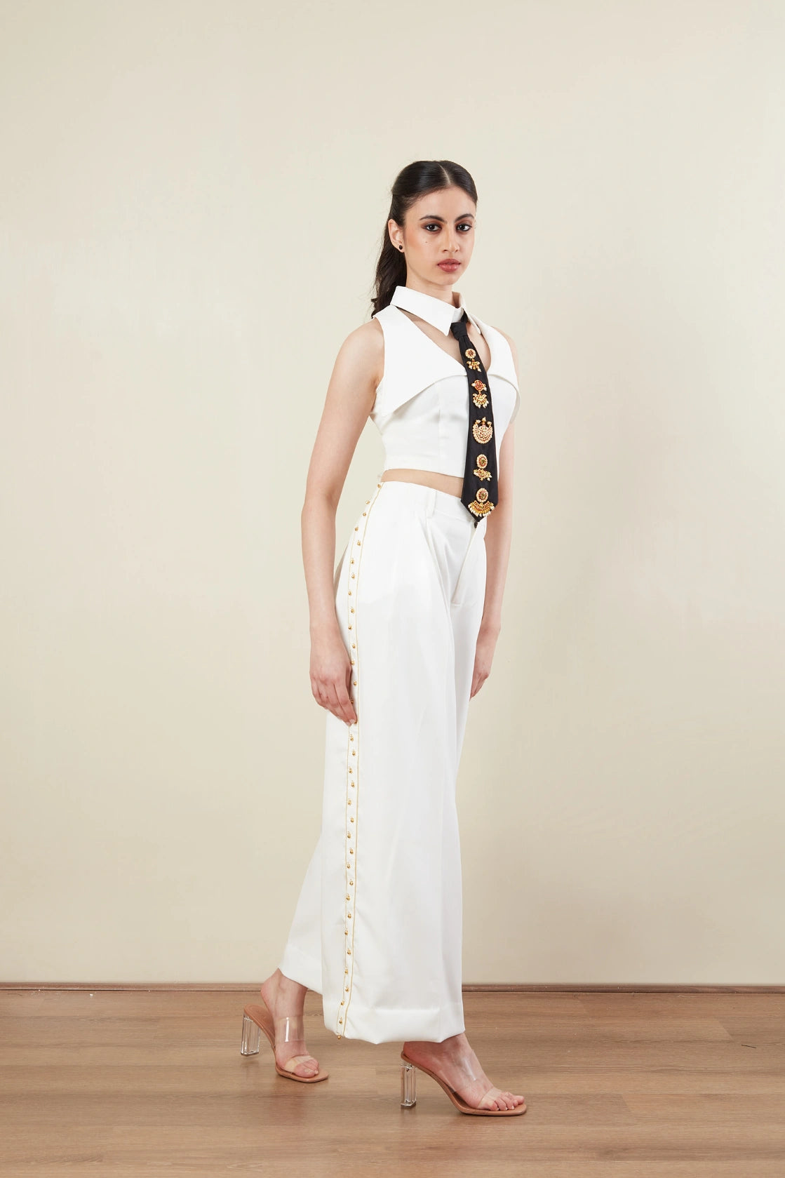 Oversize Collar -Crop Top -Collar with tie -Pleated trousers -South Indian Jewellery Embellishment