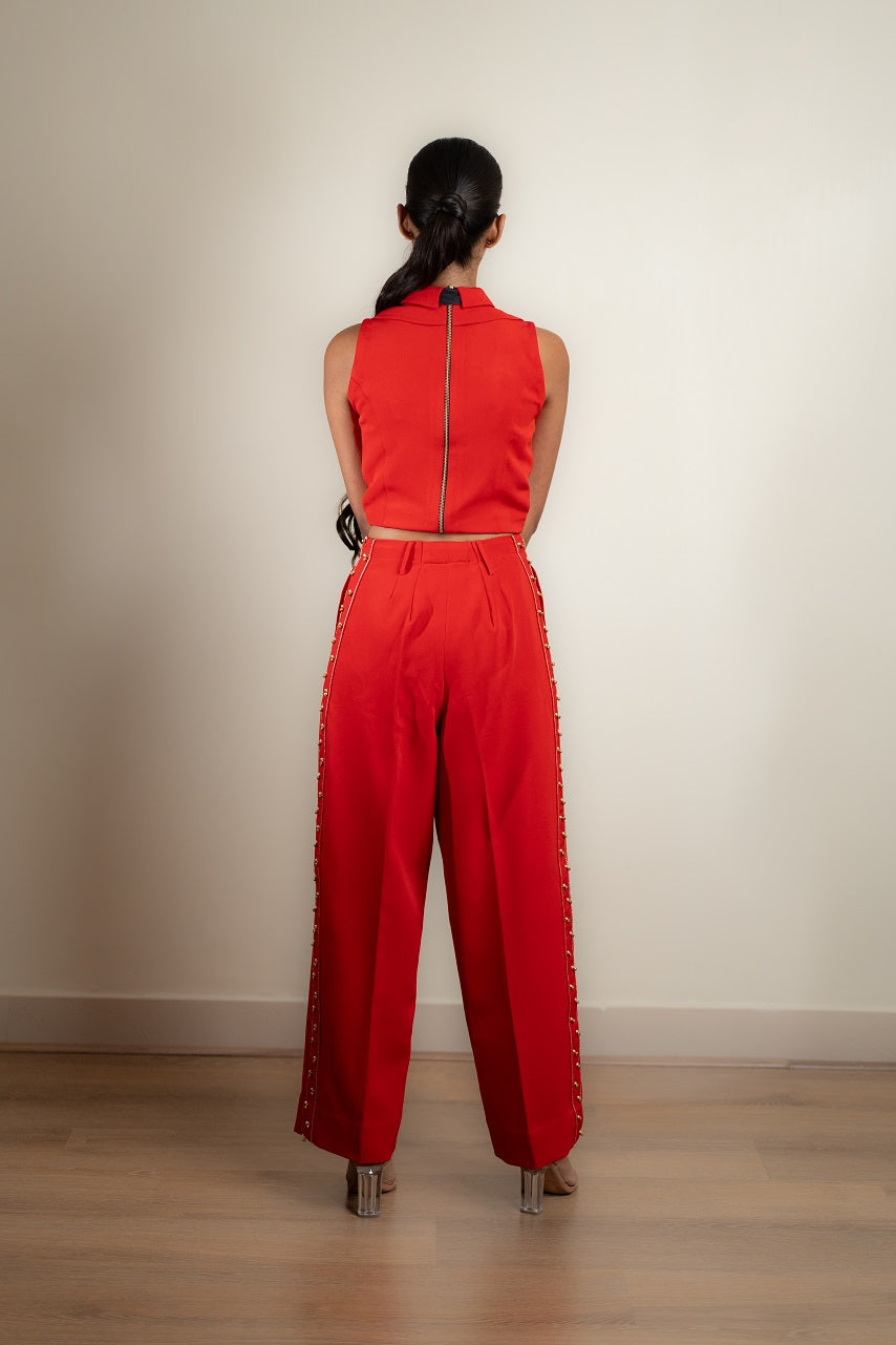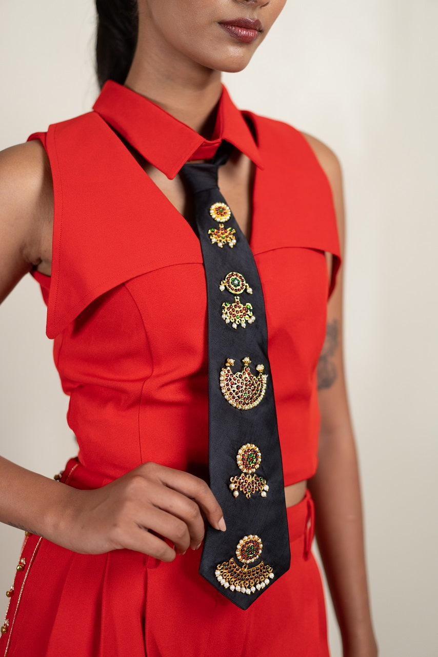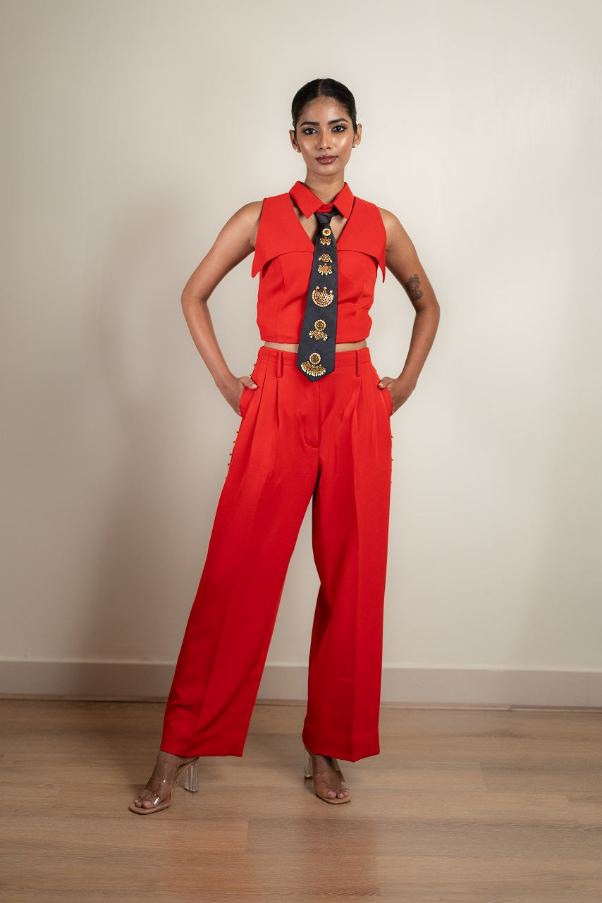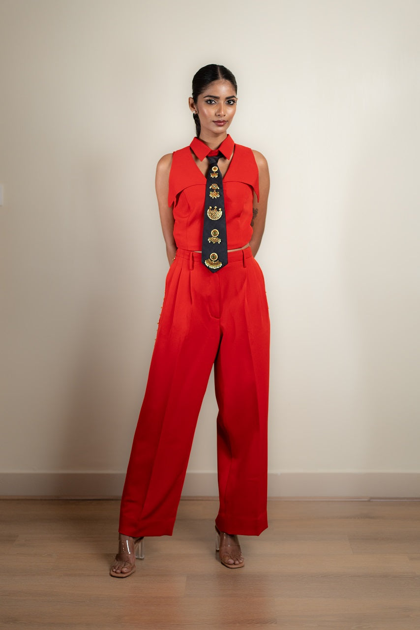 Oversize Collar -Crop Top -Collar with tie -Pleated trousers -South Indian Jewellery Embellishment