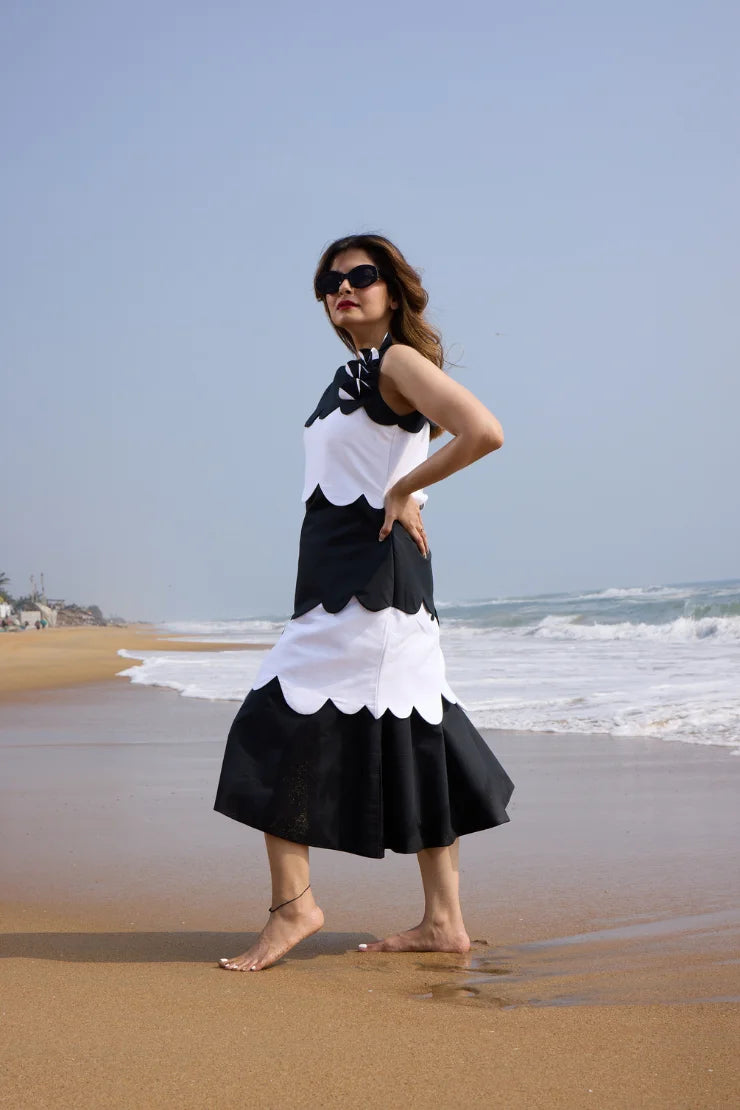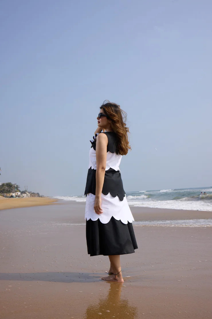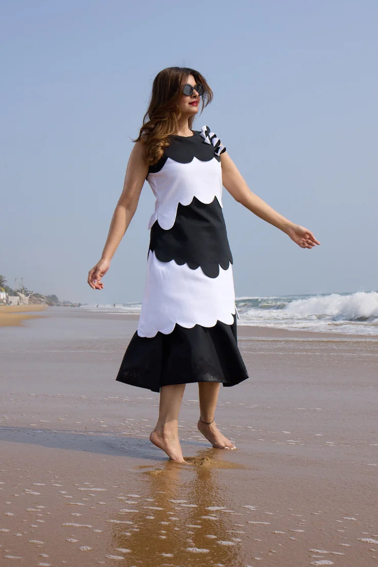 Sleeve less, Layers of Black and White Scallop Finish White and Black scallcop applique on shoulder 3/4th dress 100% Cotton