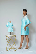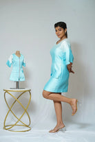 -Satin -Swarovski embellishment -White & Blue ombré -Closed neck -Metal zipper -Bell sleeves -Front pockets -Belt accentuated waist