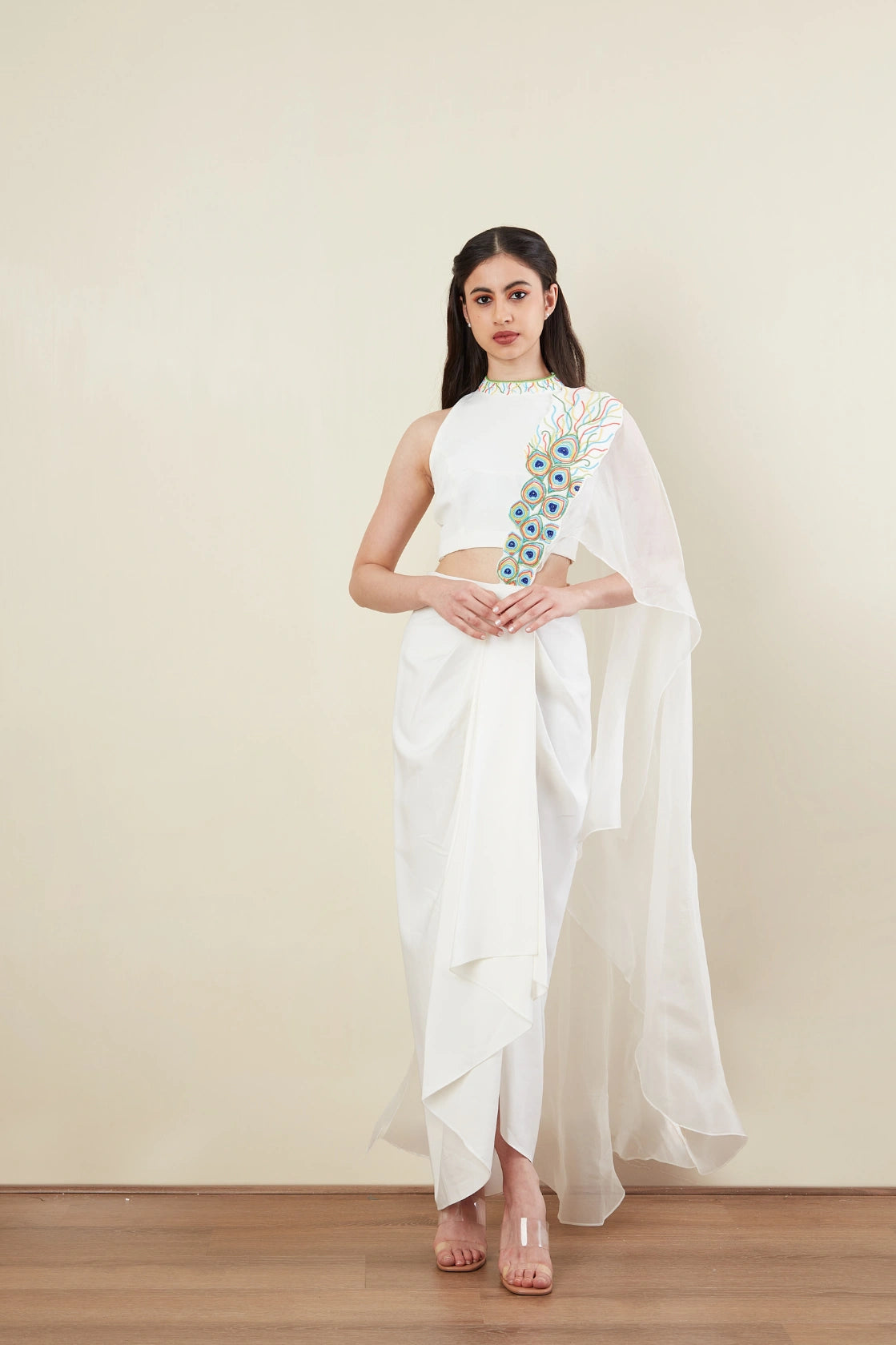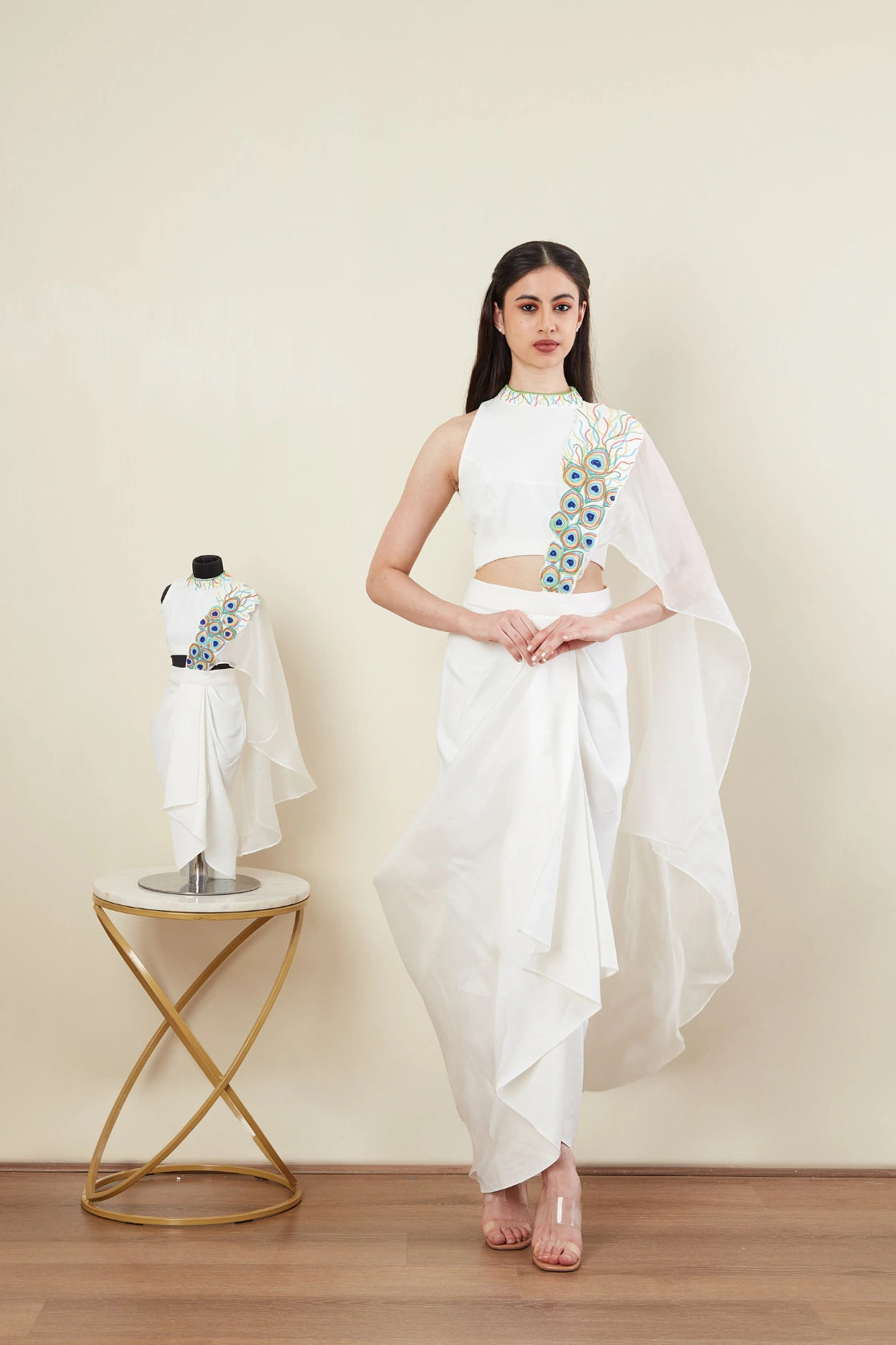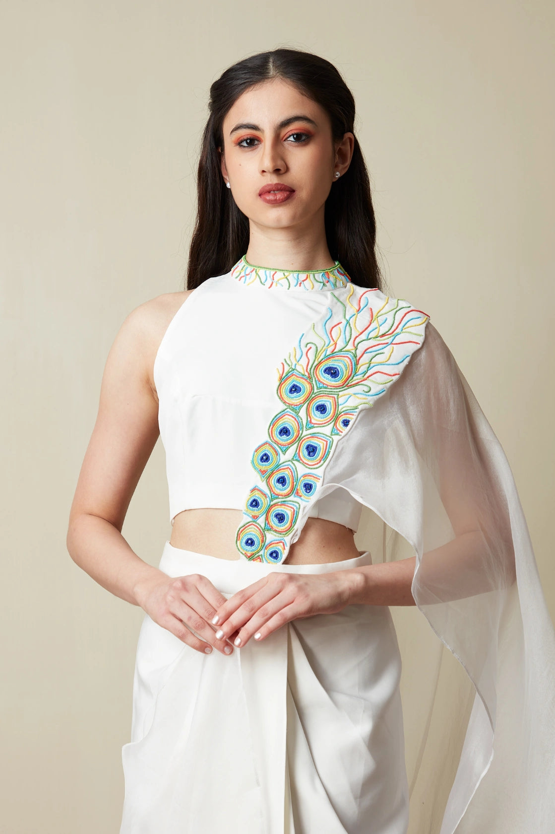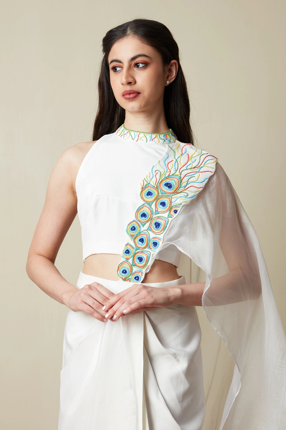 Halter Neck Blouse -Drape skirt -Pre Drape pallu -Peacock Feather motif -Pop colour beads Embroidery -Organza pallu
