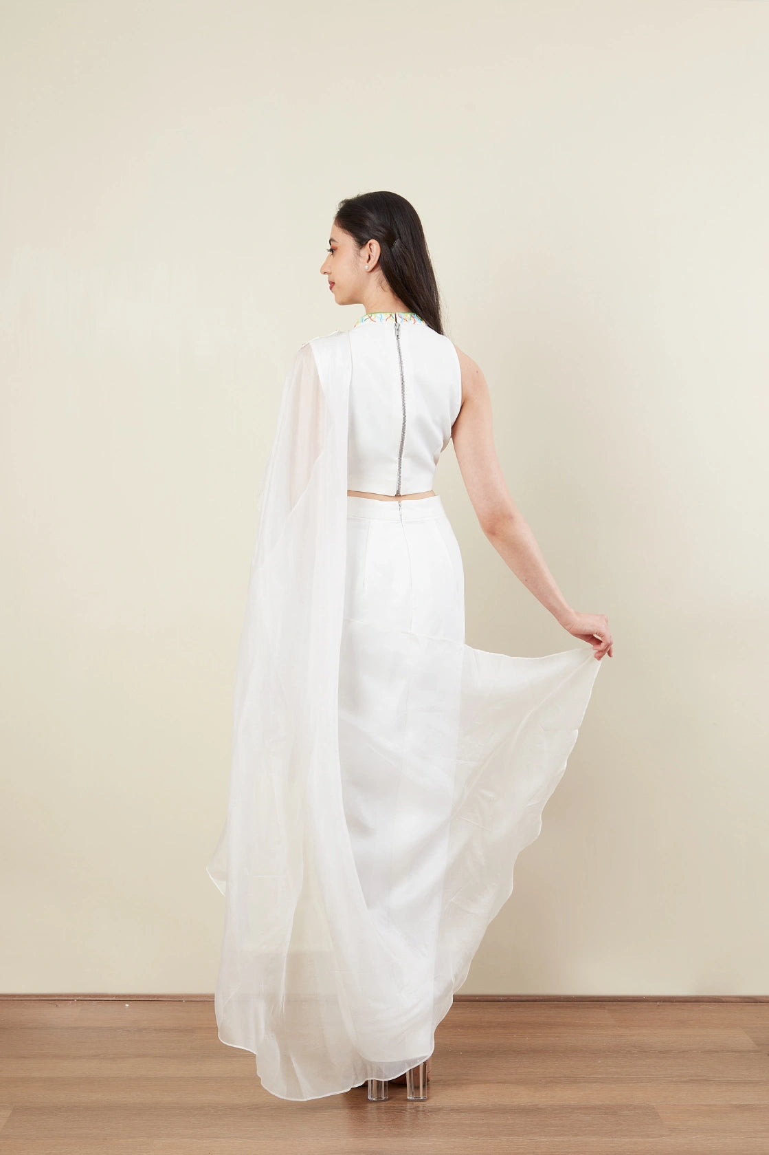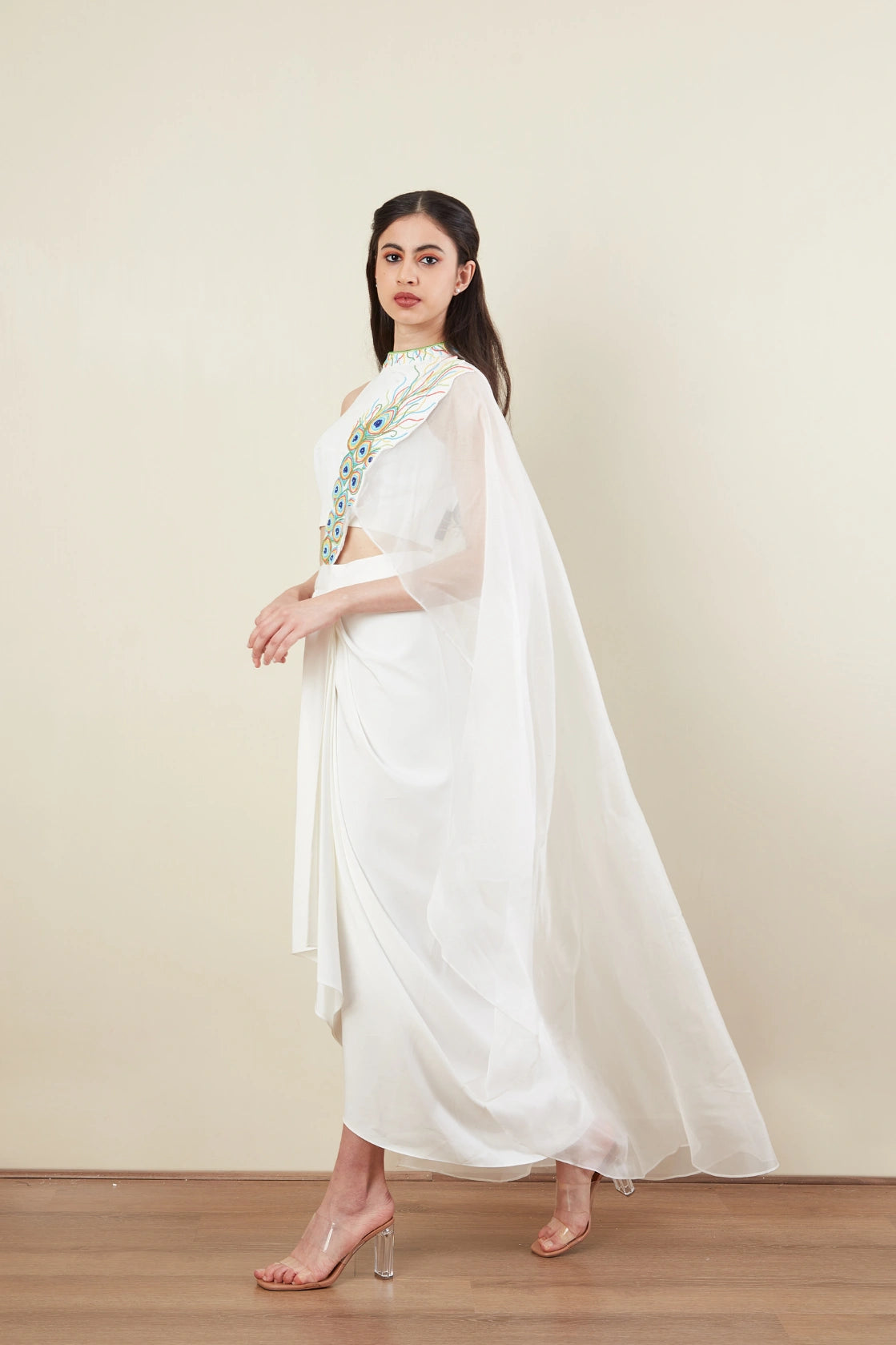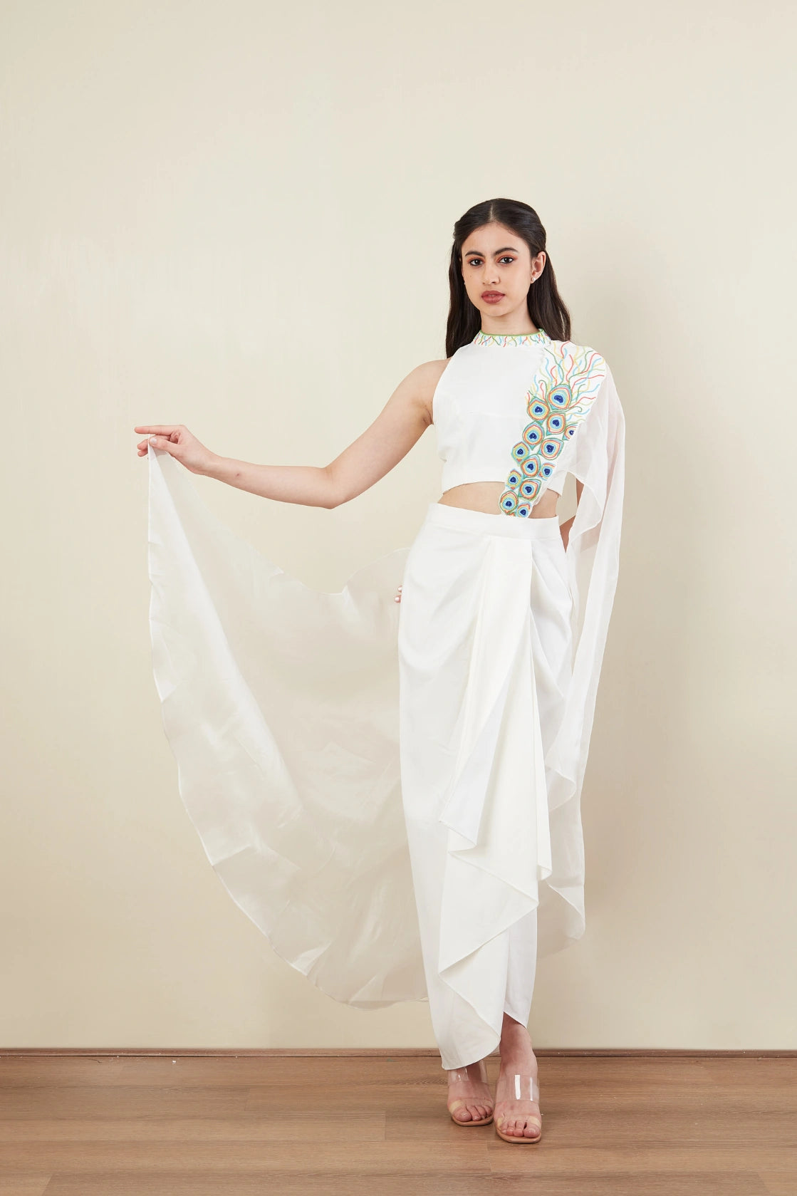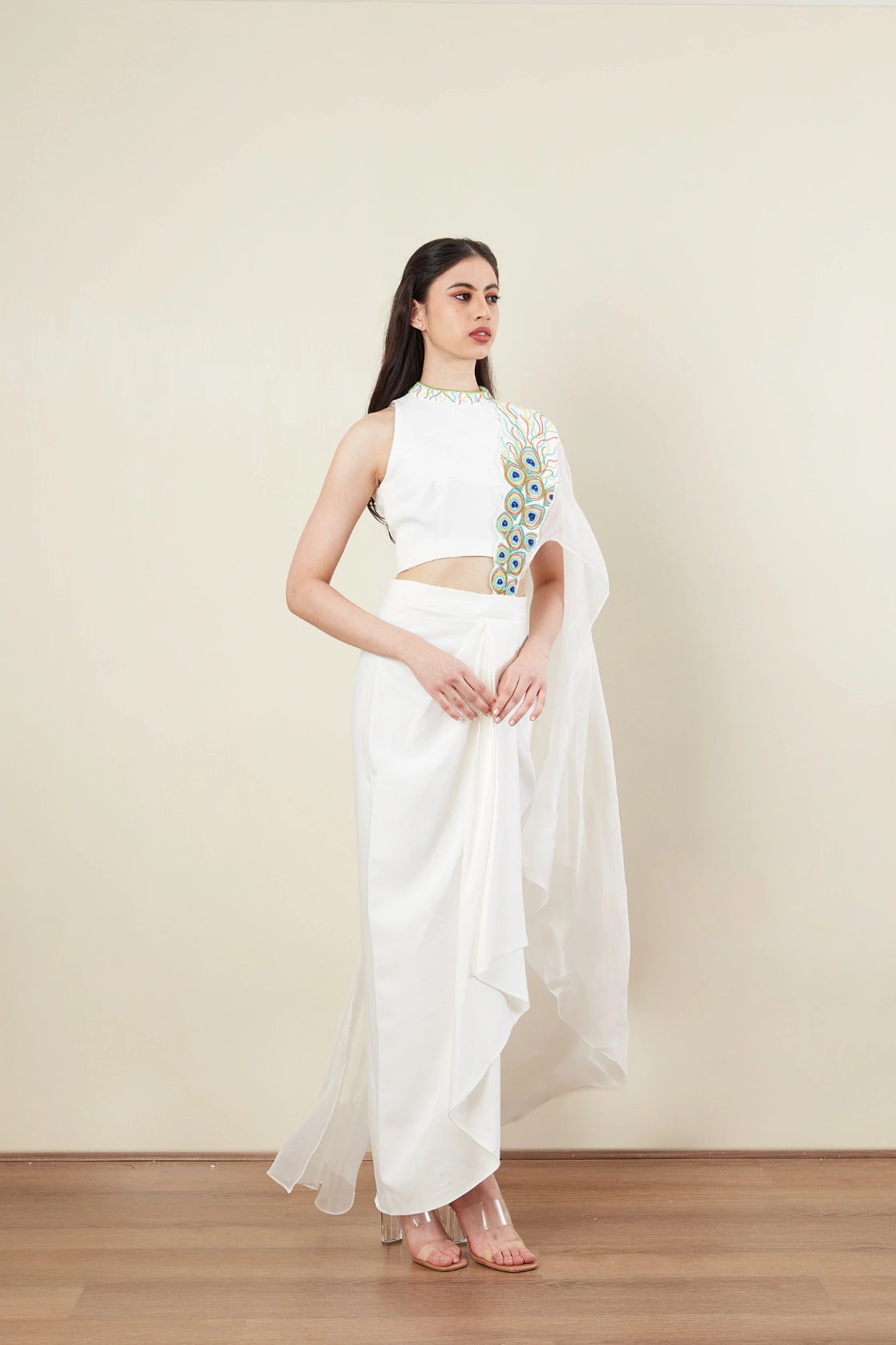 Halter Neck Blouse -Drape skirt -Pre Drape pallu -Peacock Feather motif -Pop colour beads Embroidery -Organza pallu