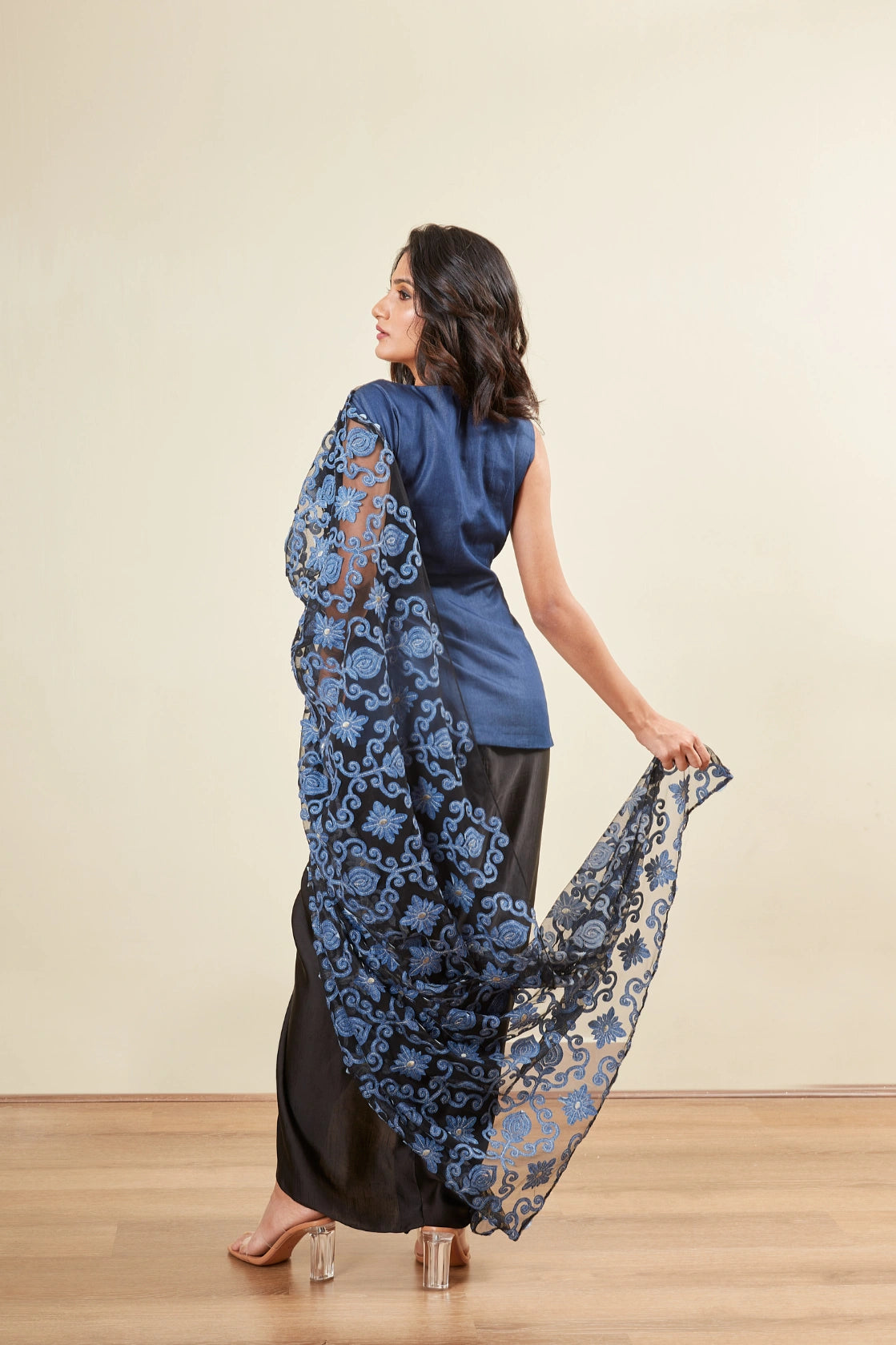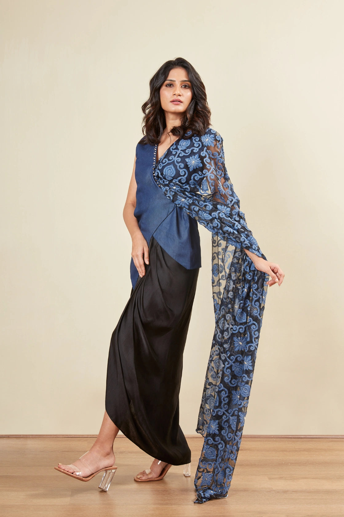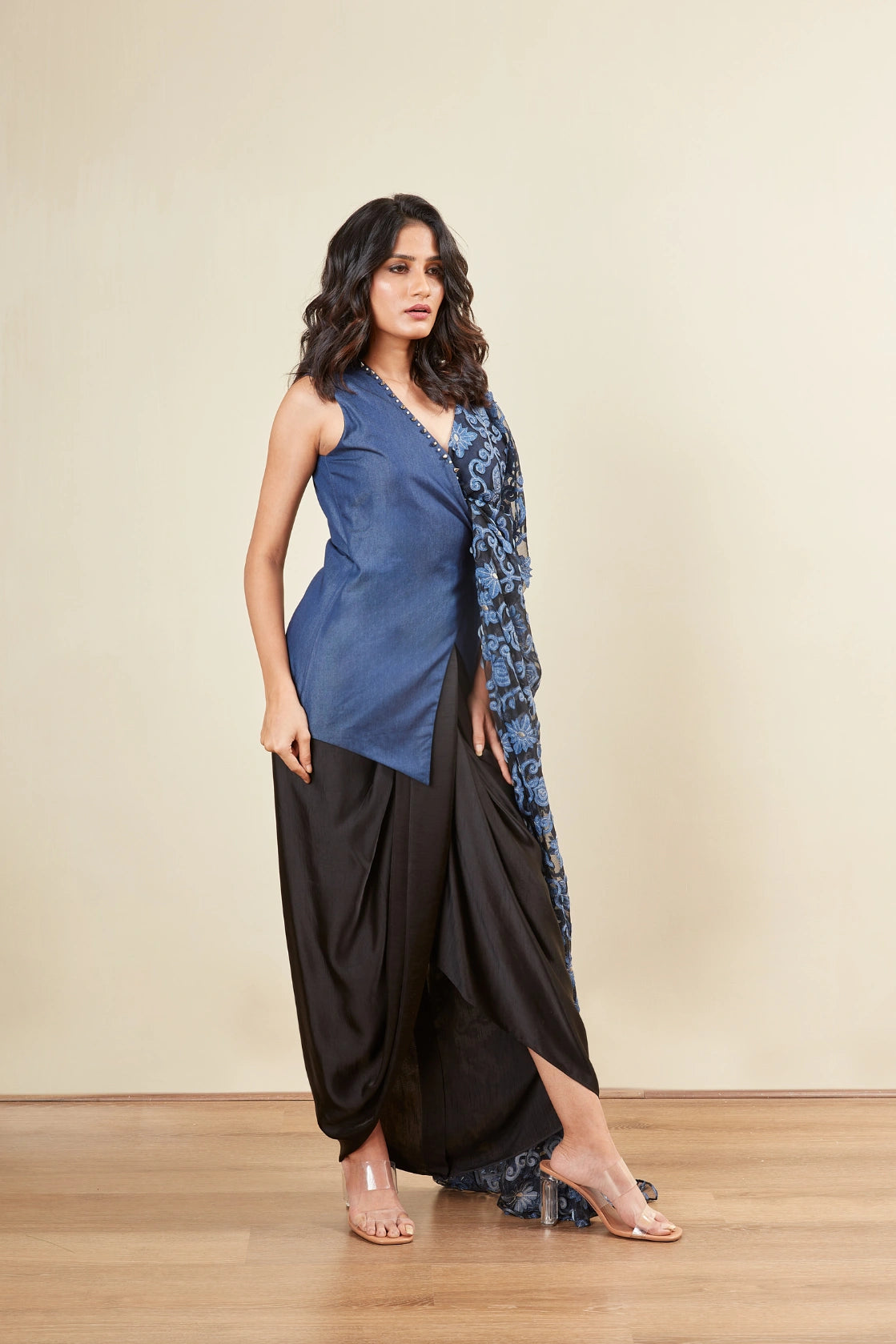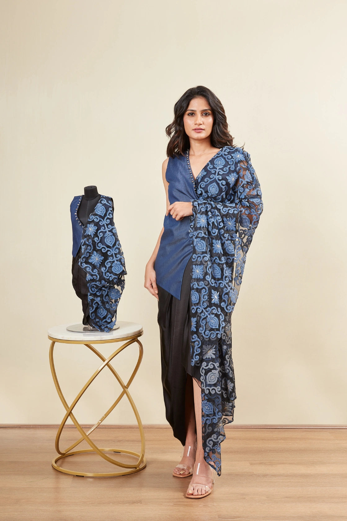 Jacket -Attached Pallu -Denim applique embriodery -Silver rock stud embriodery -Net pallu -drape skirt