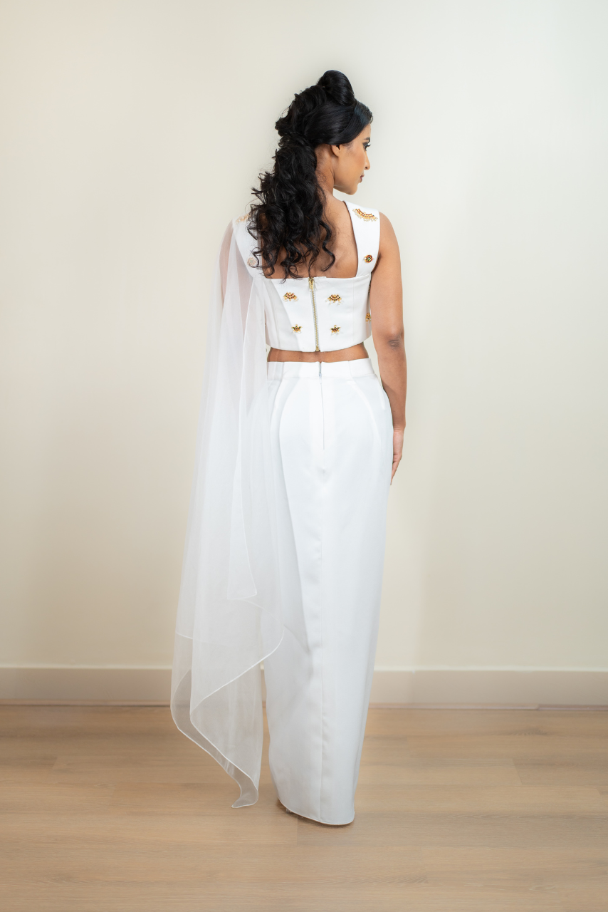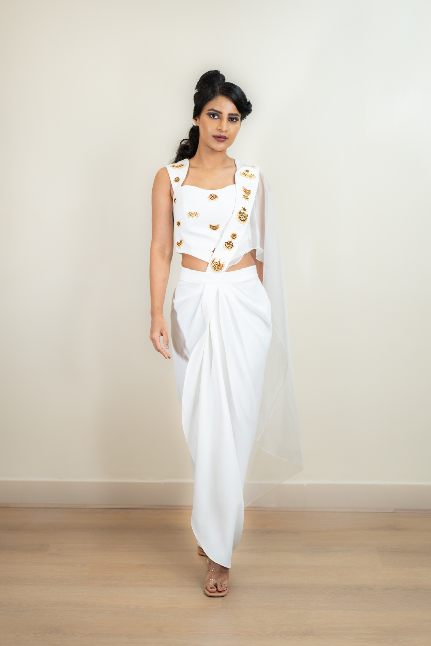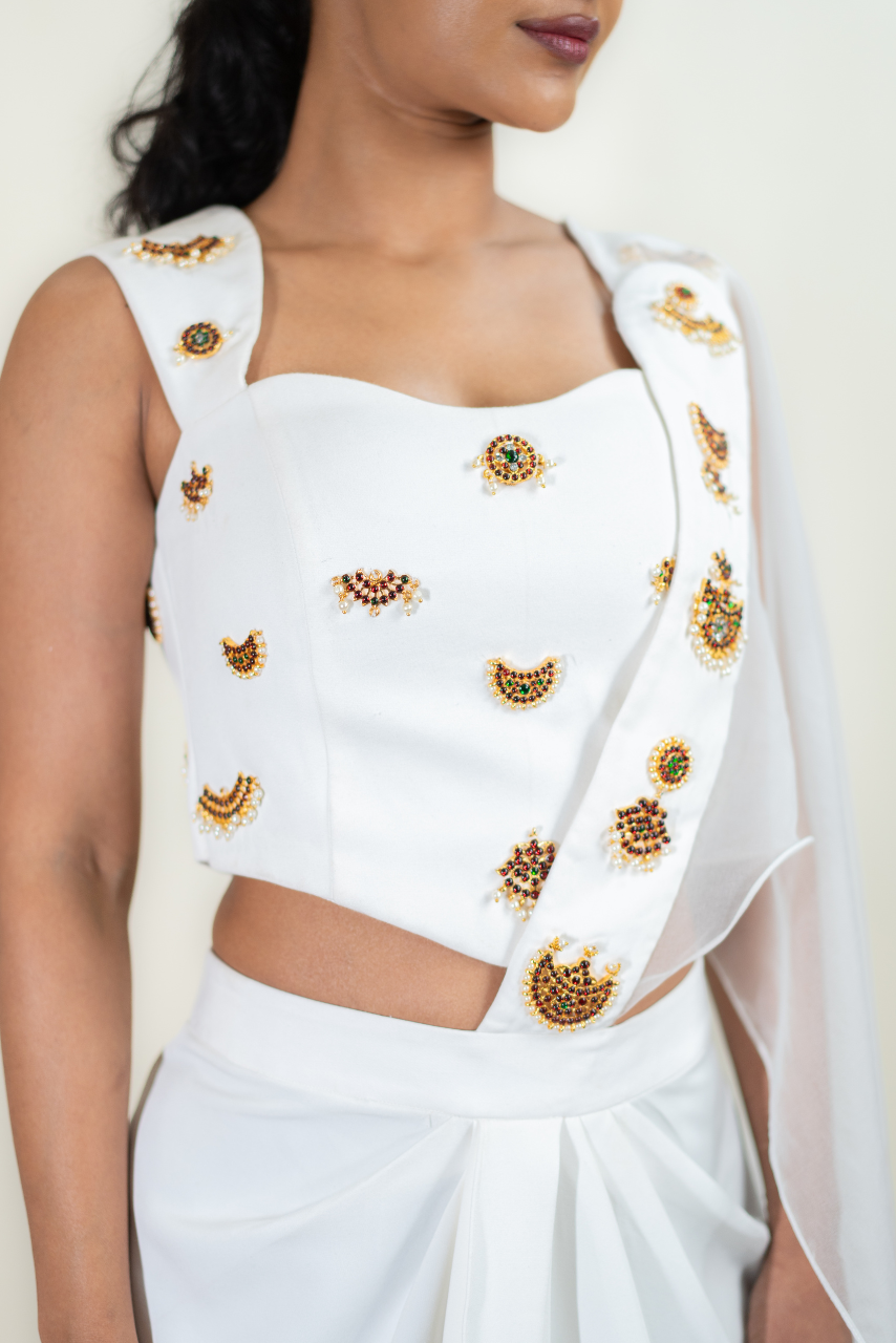 Corset Blouse,drape Skirt With Prestiched Pallu Kemp Jewellery, Embroiderd On Blouse And Pallu