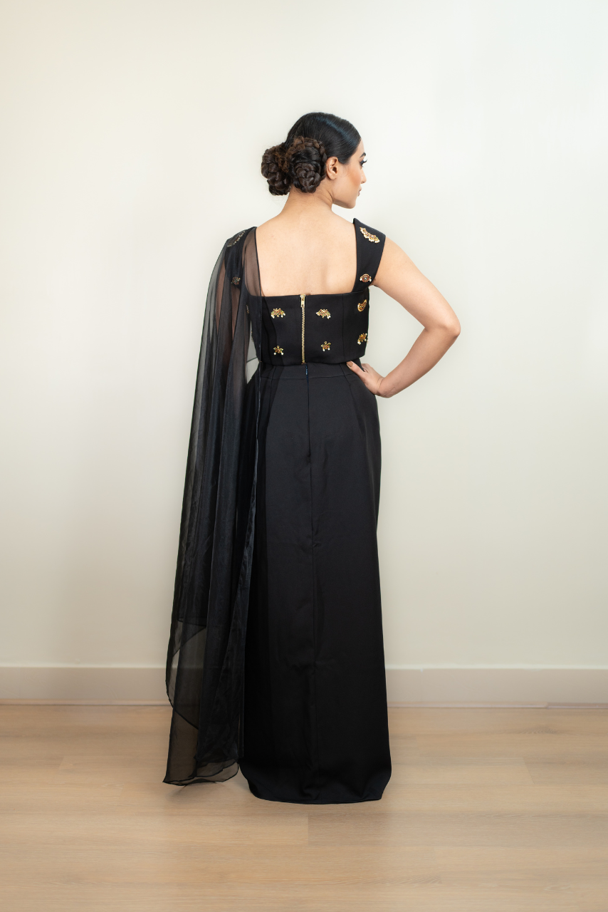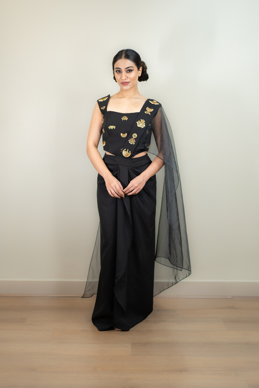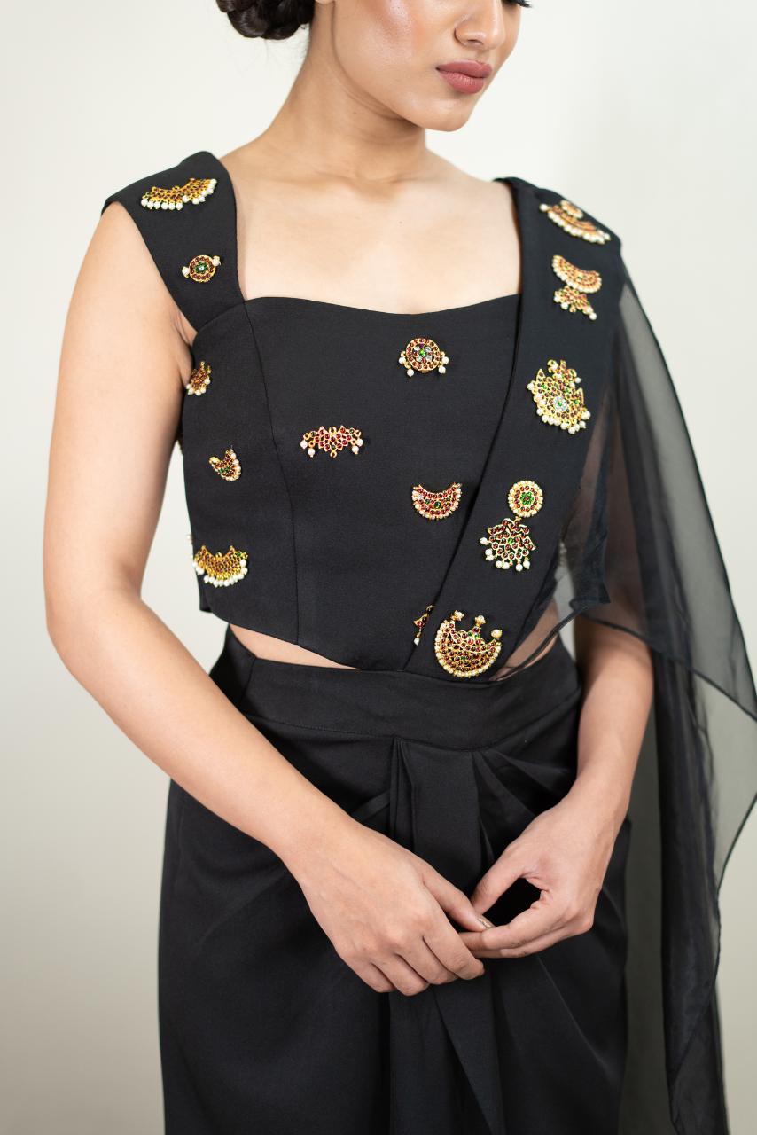 Corset Blouse,drape Skirt With Prestiched Pallu Kemp Jewellery, Embroiderd On Blouse And Pallu