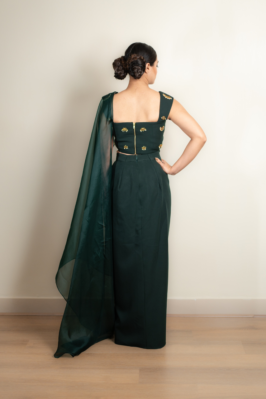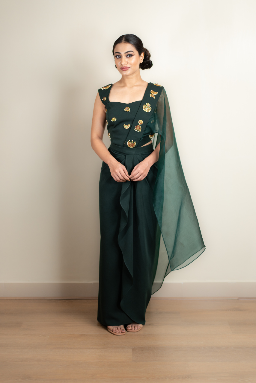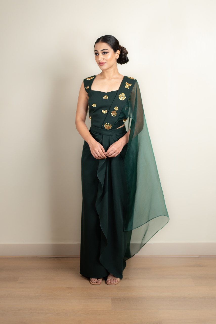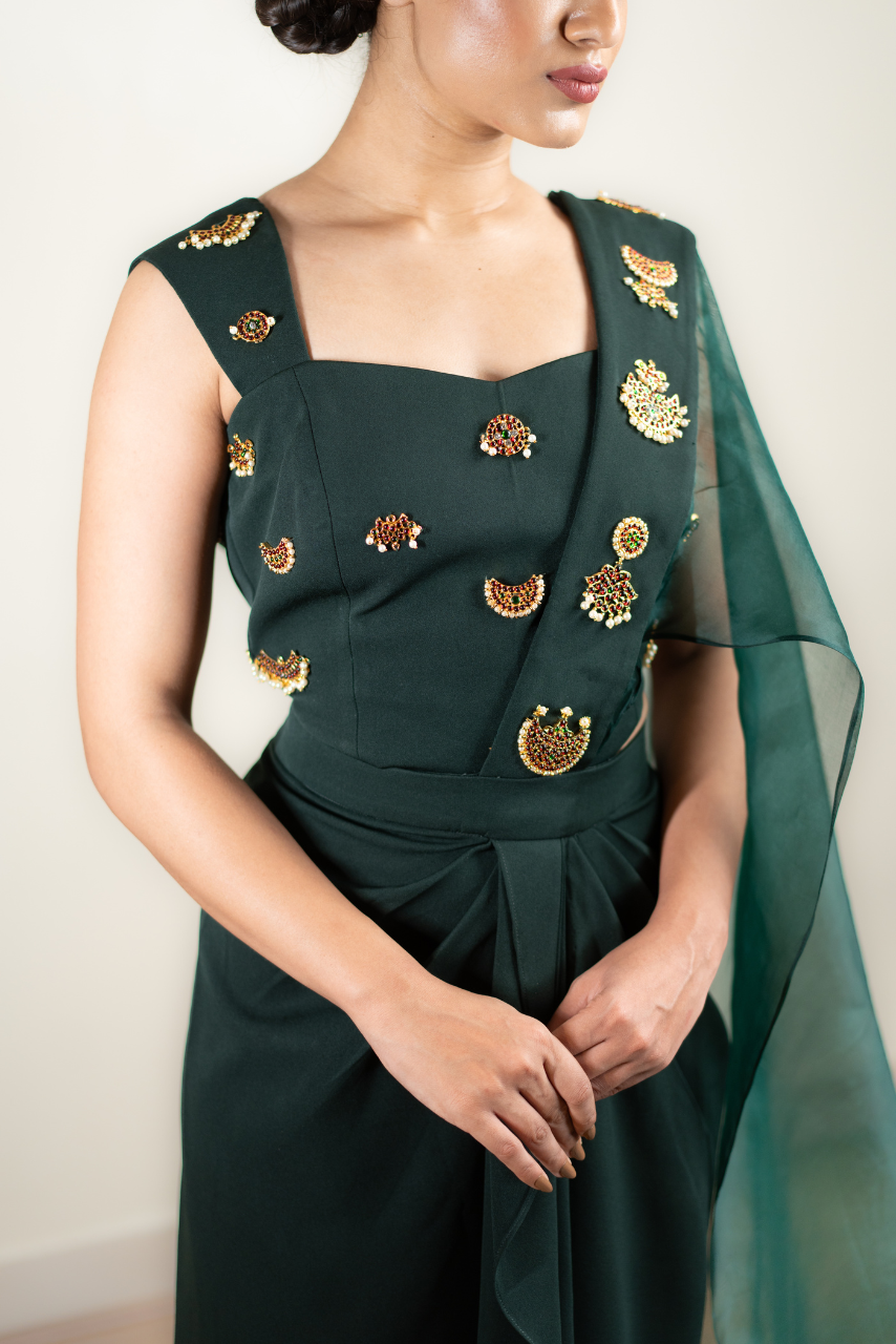 Corset Blouse,drape Skirt With Prestiched Pallu Kemp Jewellery, Embroiderd On Blouse And Pallu