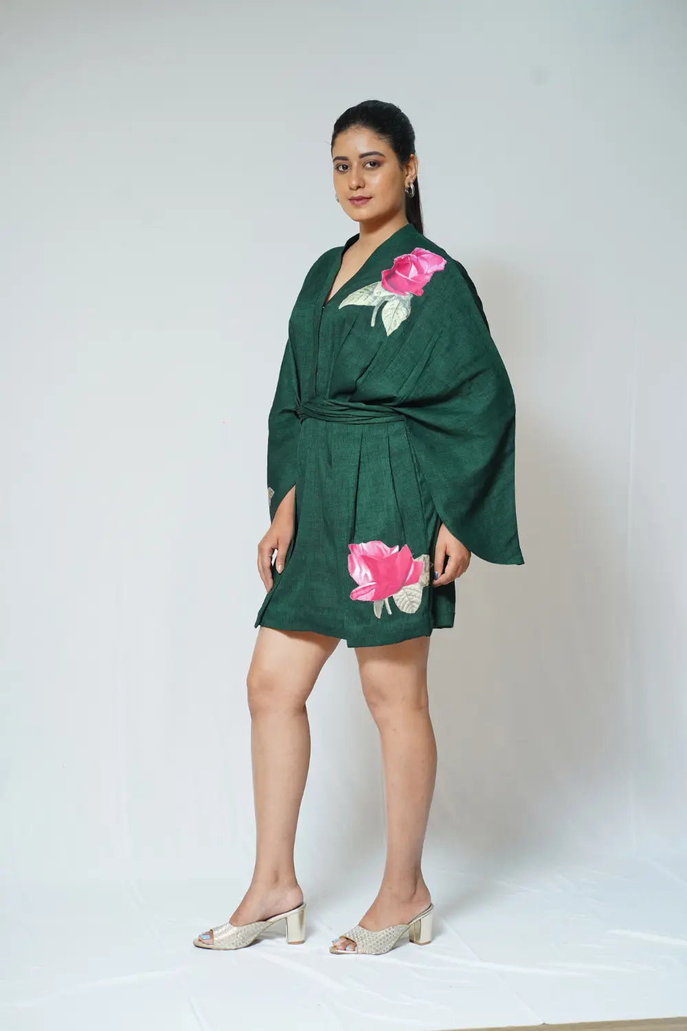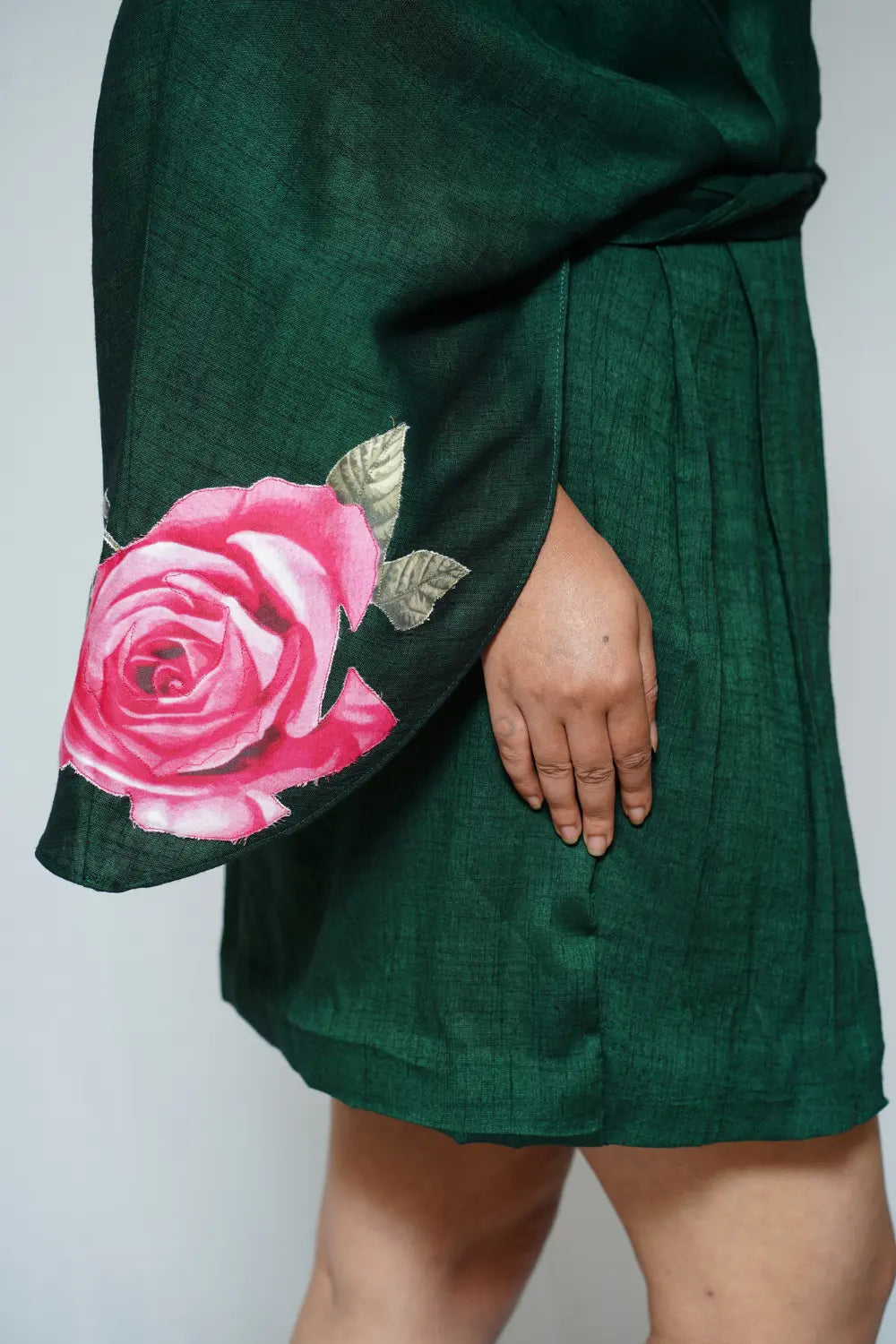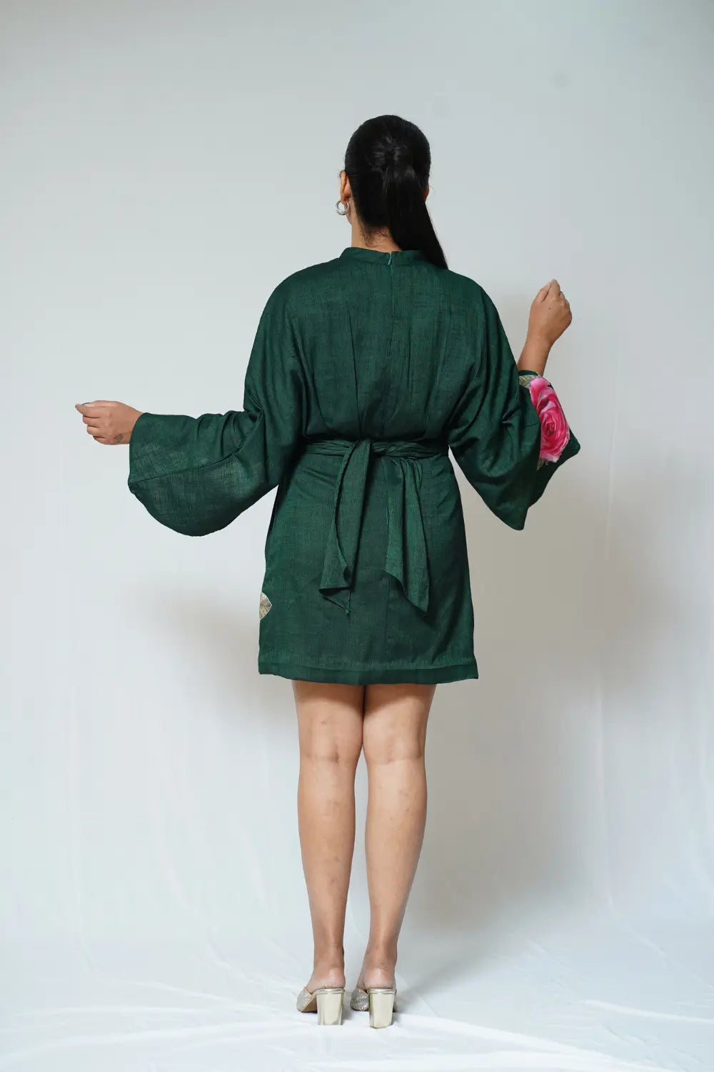 -Floral Appliqué -Bottle Green -Tie up dress -Kaftaan sleeves
