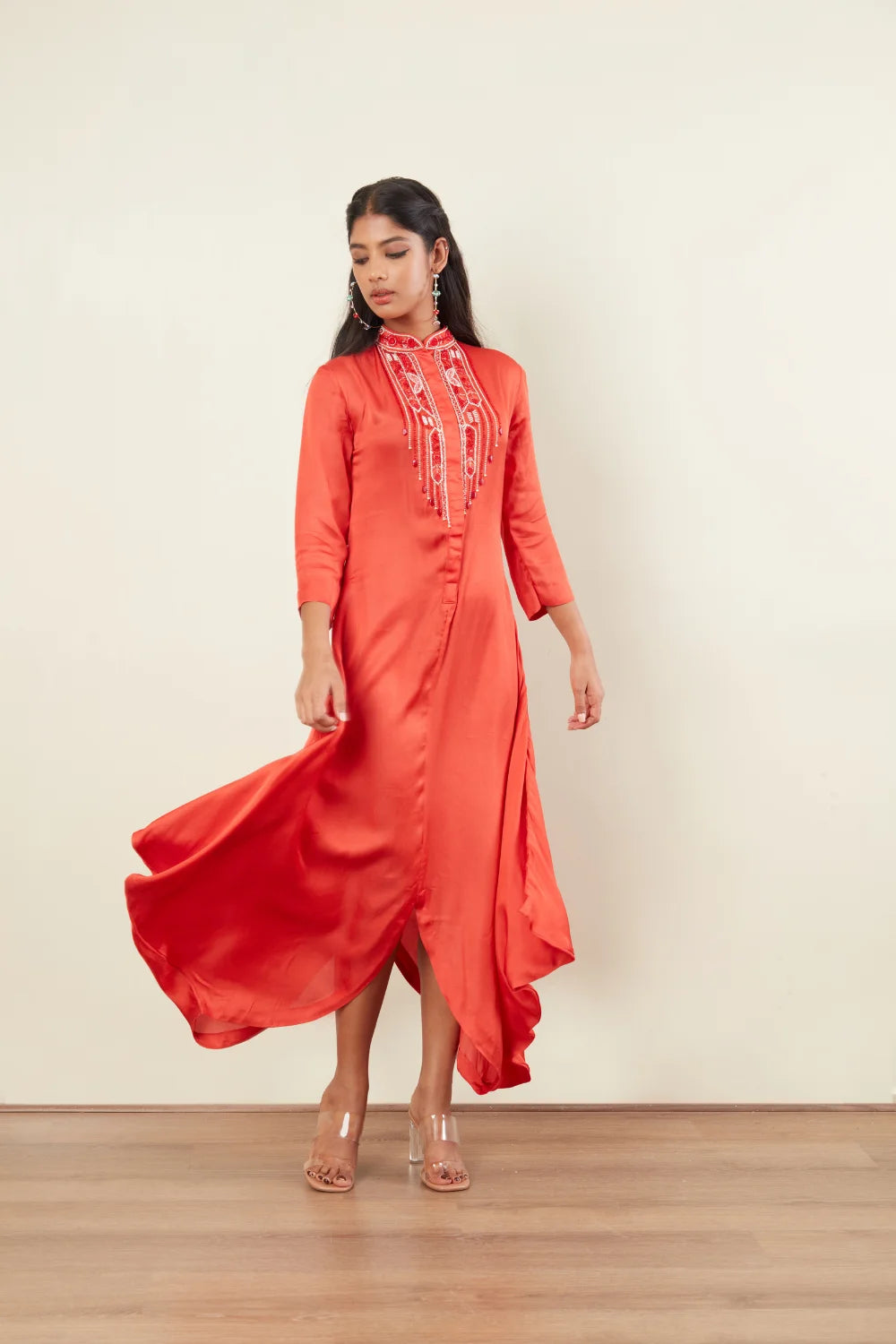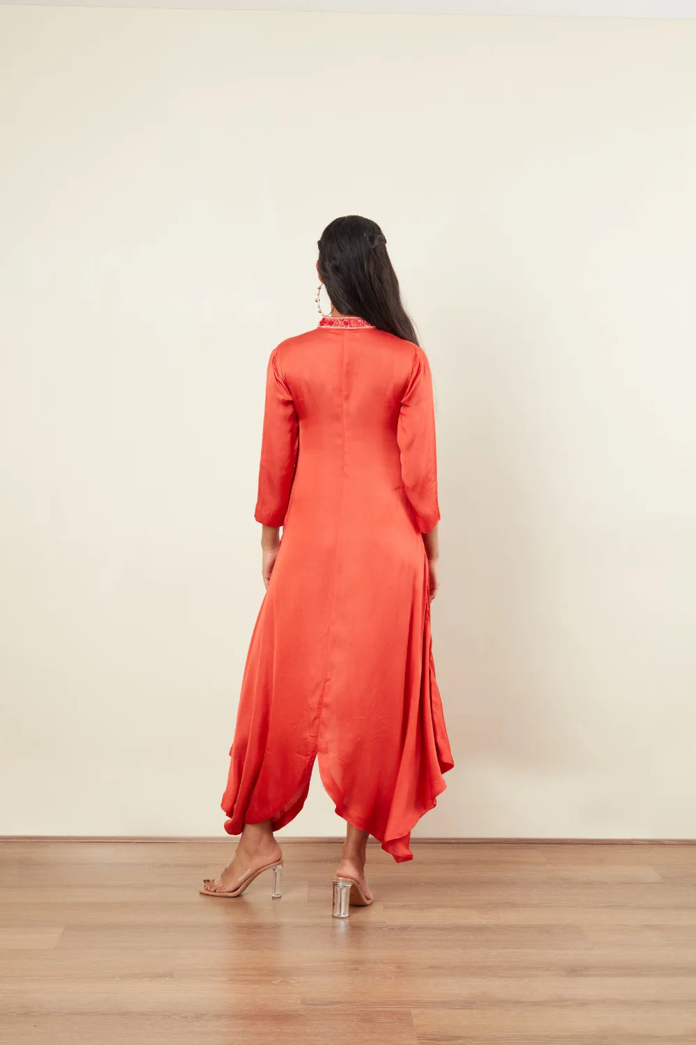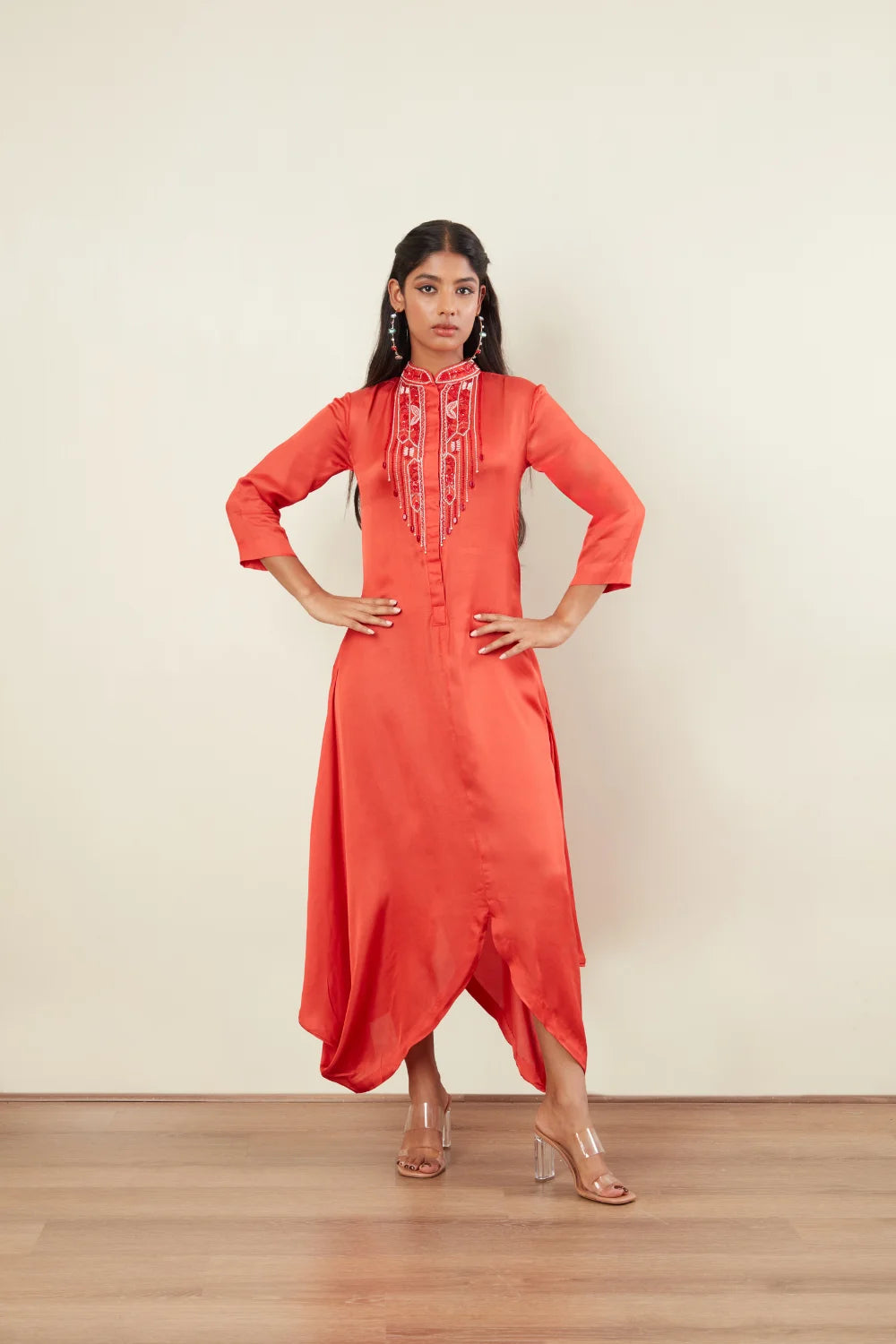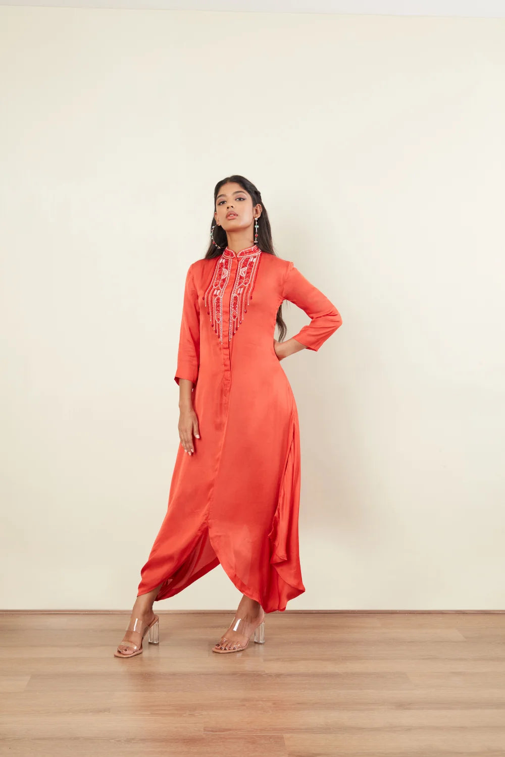 Off white Beads & Coral tubes Sequins Embriodery 3/4th Sleeves Chinesh Collar Front Open Cowl drap