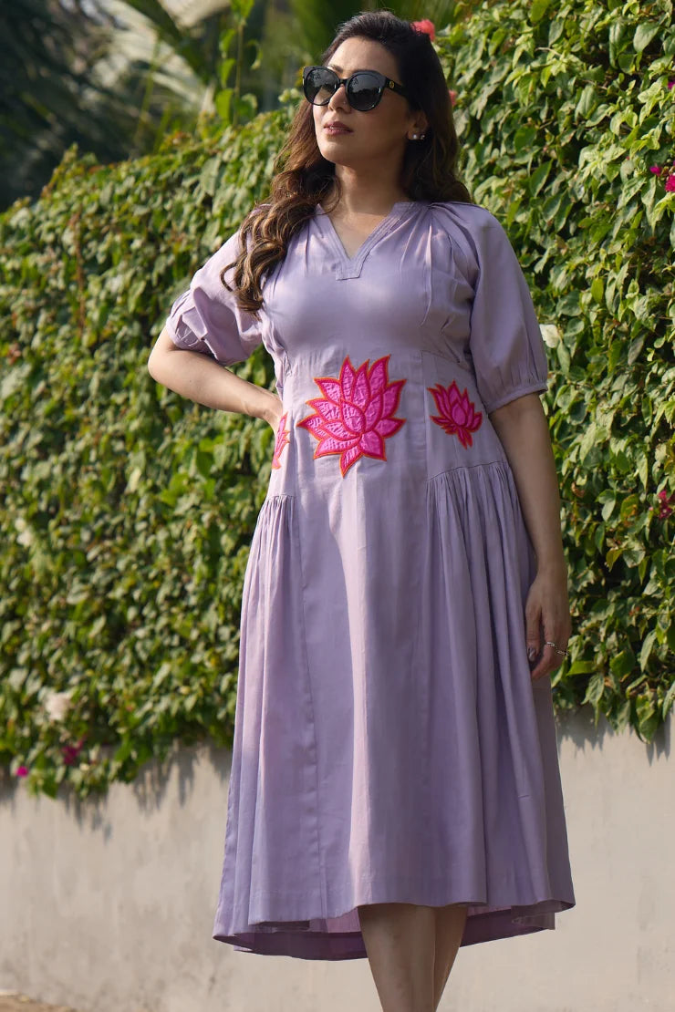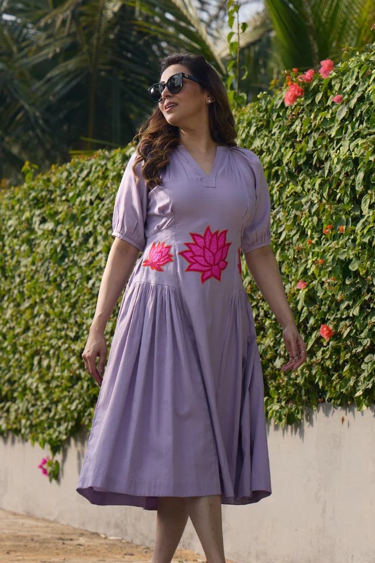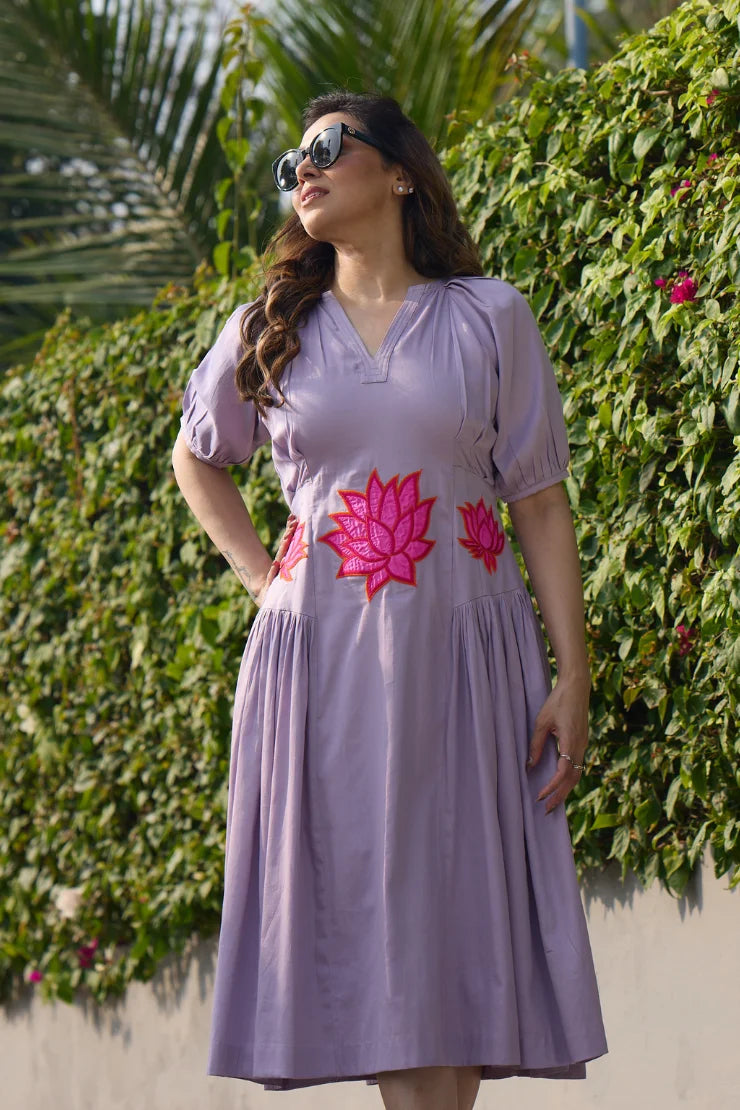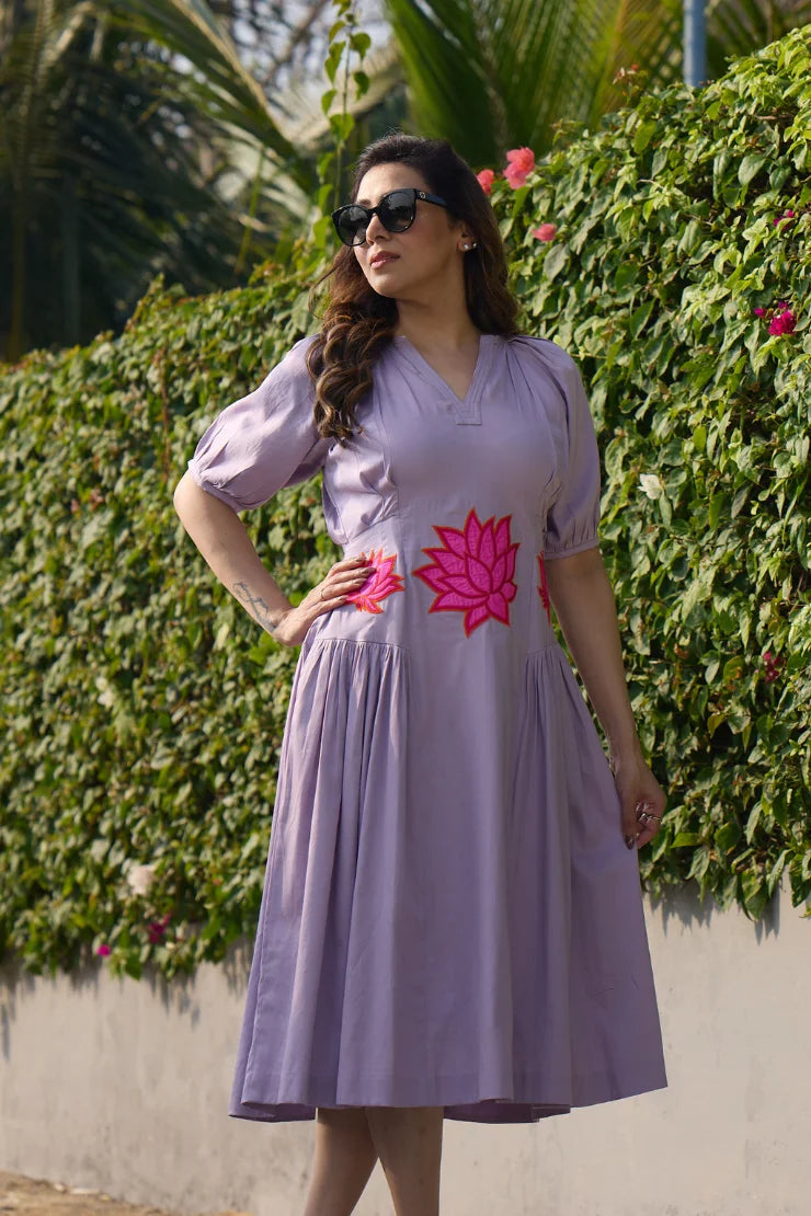 Corset looking fitted dress with shirt sleeves Pink lotus Applique Embroidery Gathers on the side of the dress