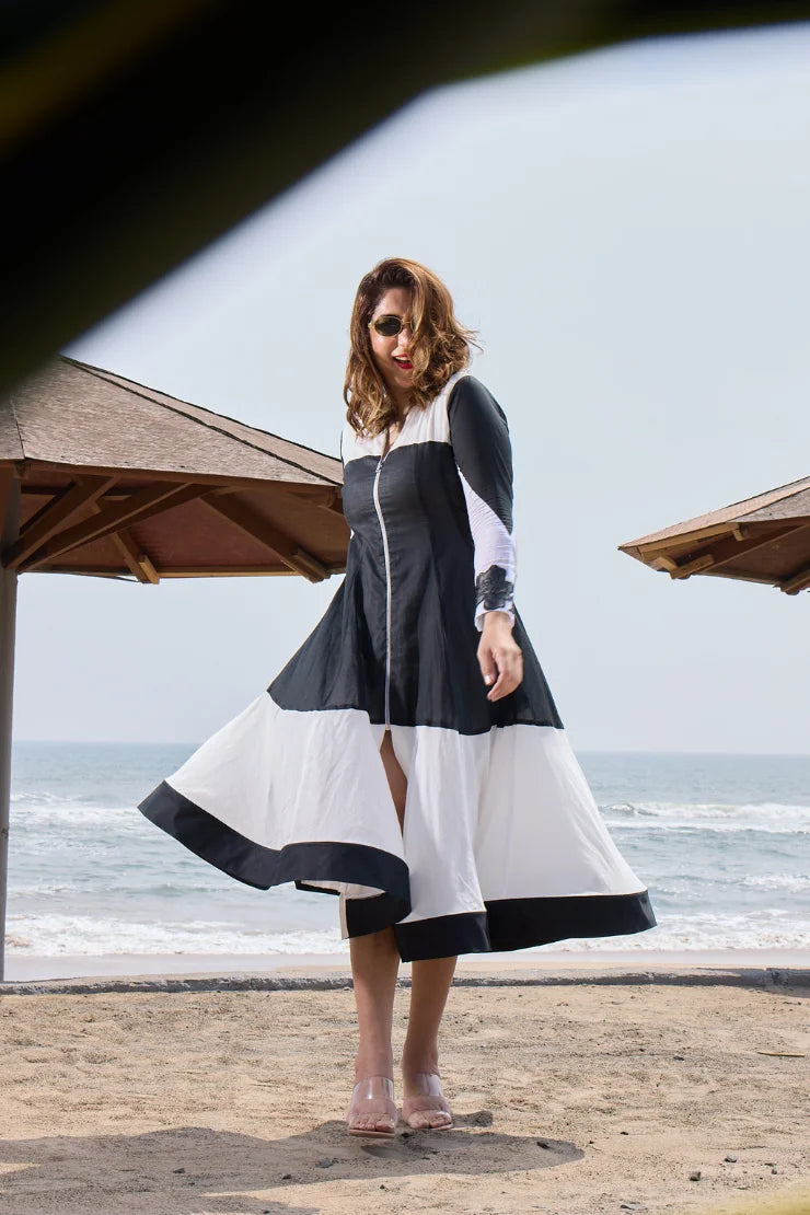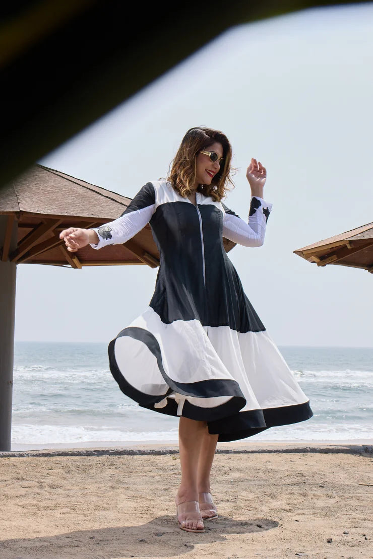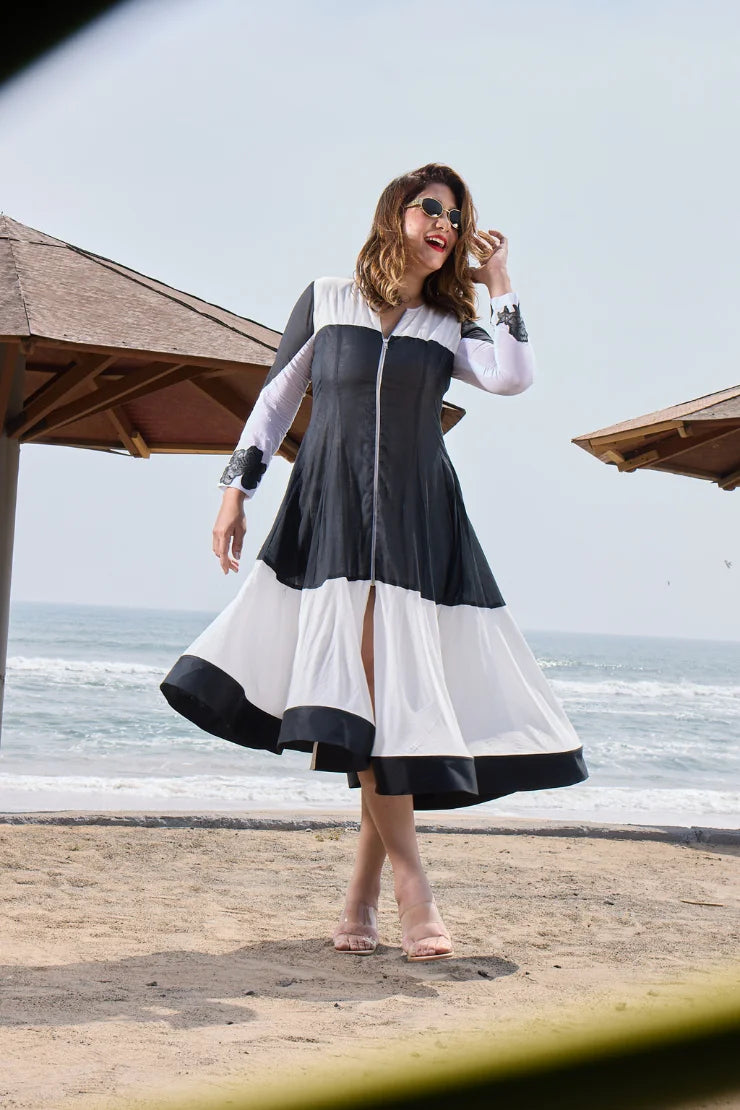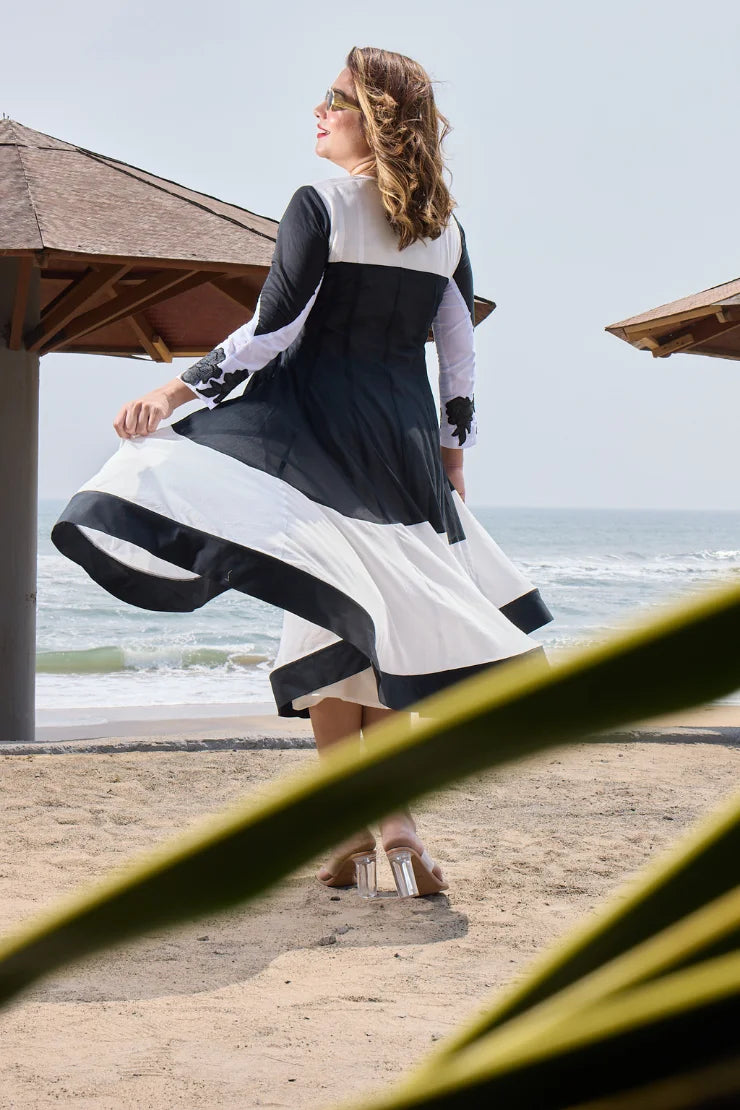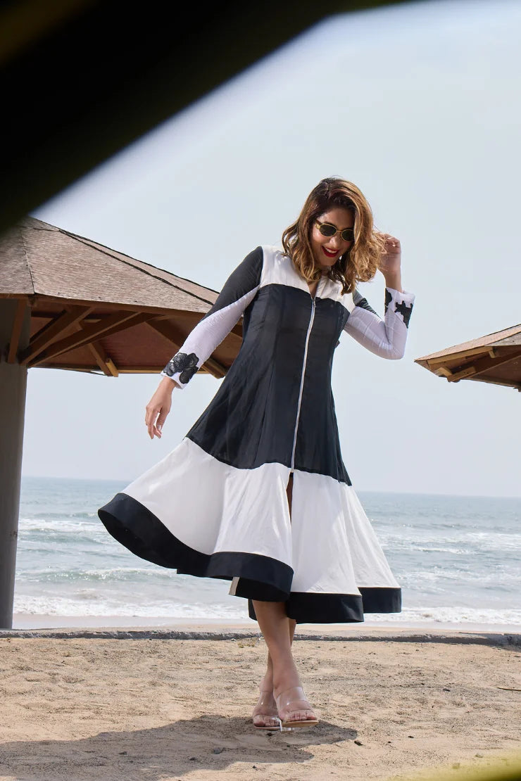 Round Neck, Metal Zipper, Black applique leather flower Embroidery Flair at the bottom