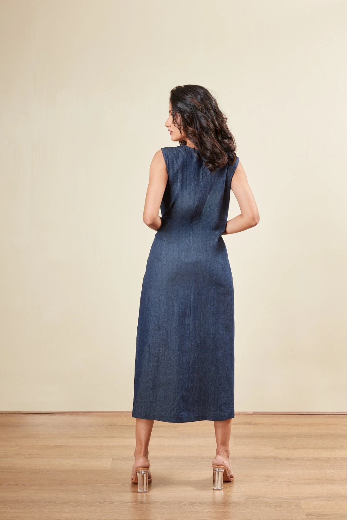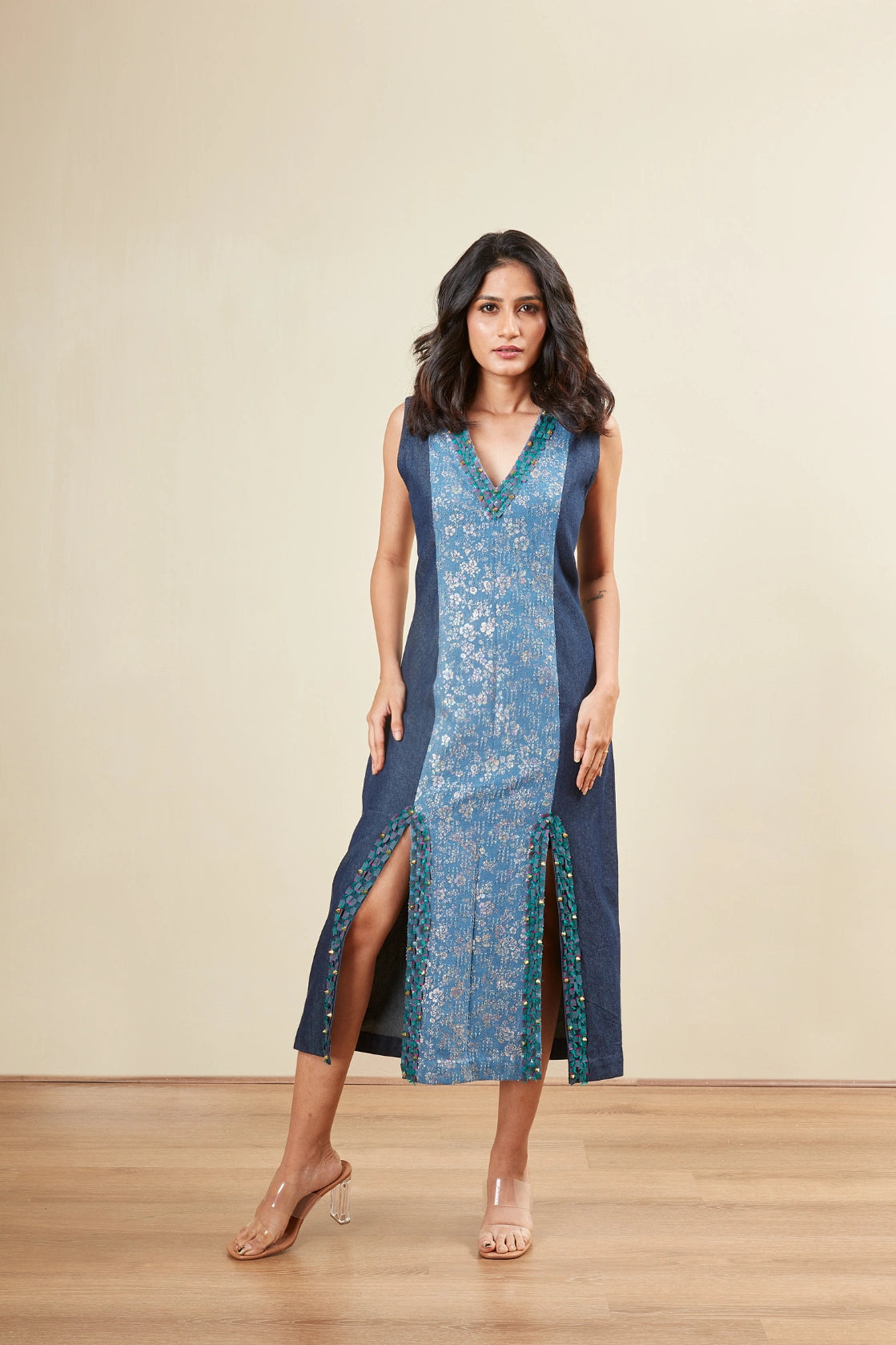 Sleeveless -V neck -Rock stud Embriodery -Fabric Embriodery -Front slit -Mettalic denim