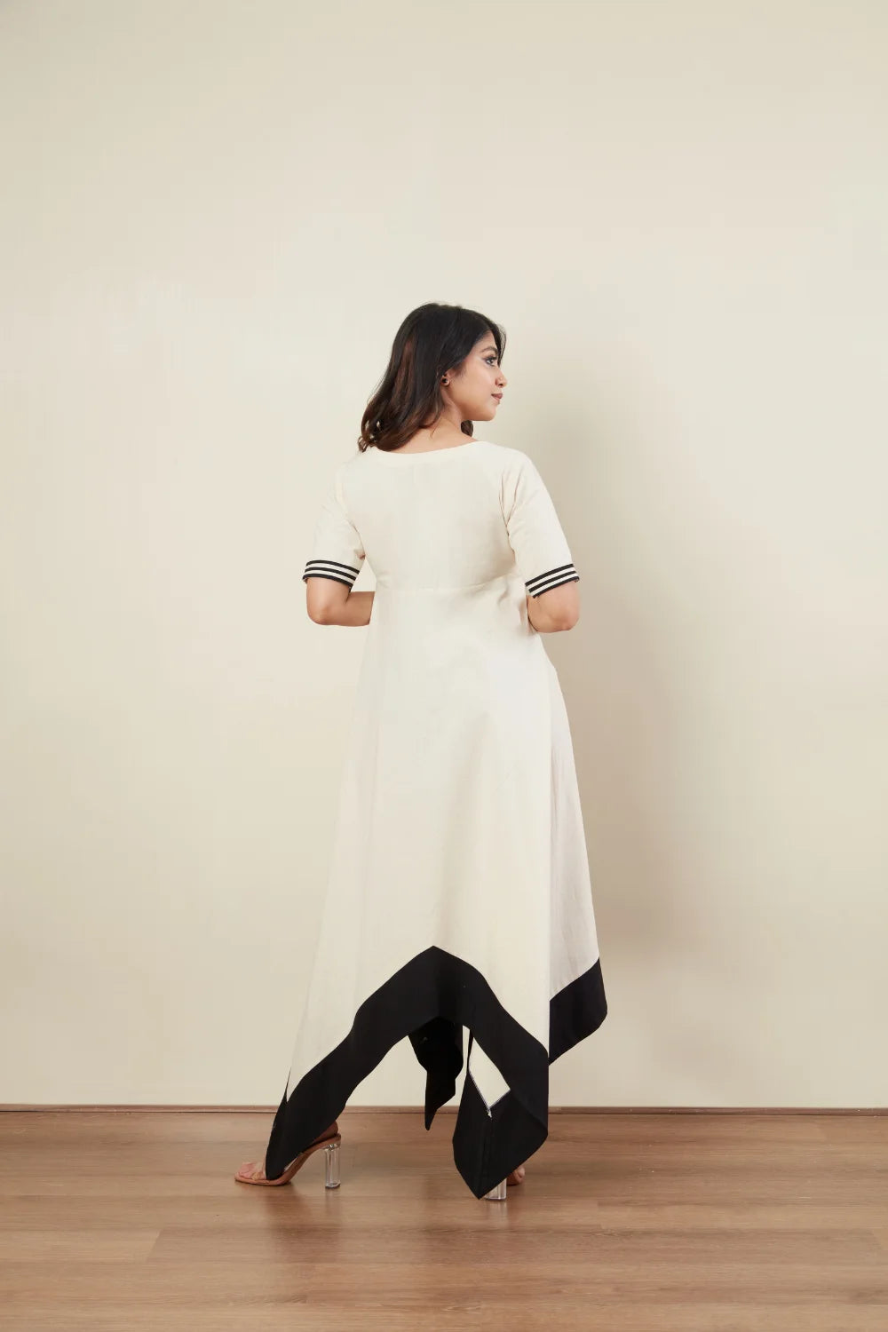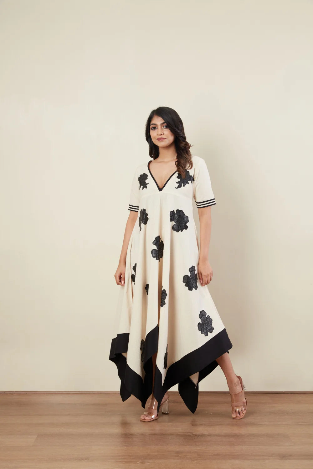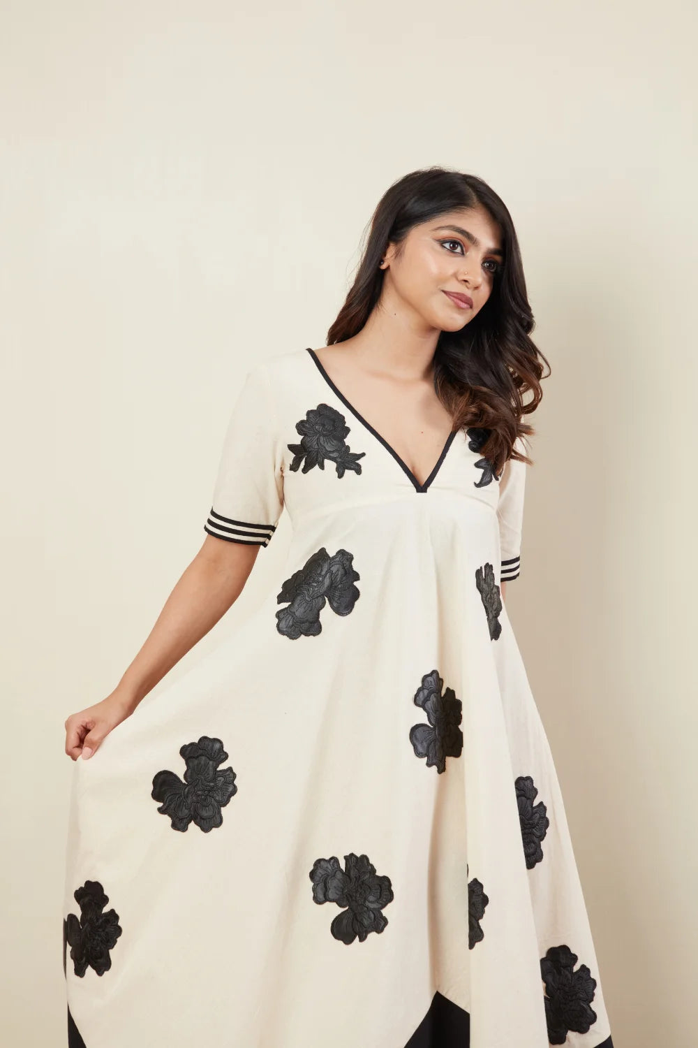 vide V Neck Black Floral Embriodery Lazer cut Flowers Short Sleeve Upper Bust Joint Handkerchief cut