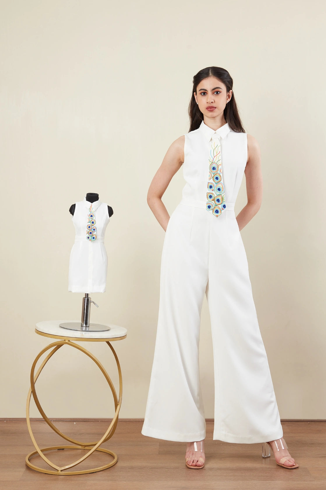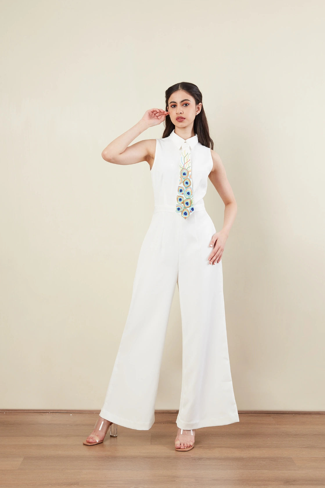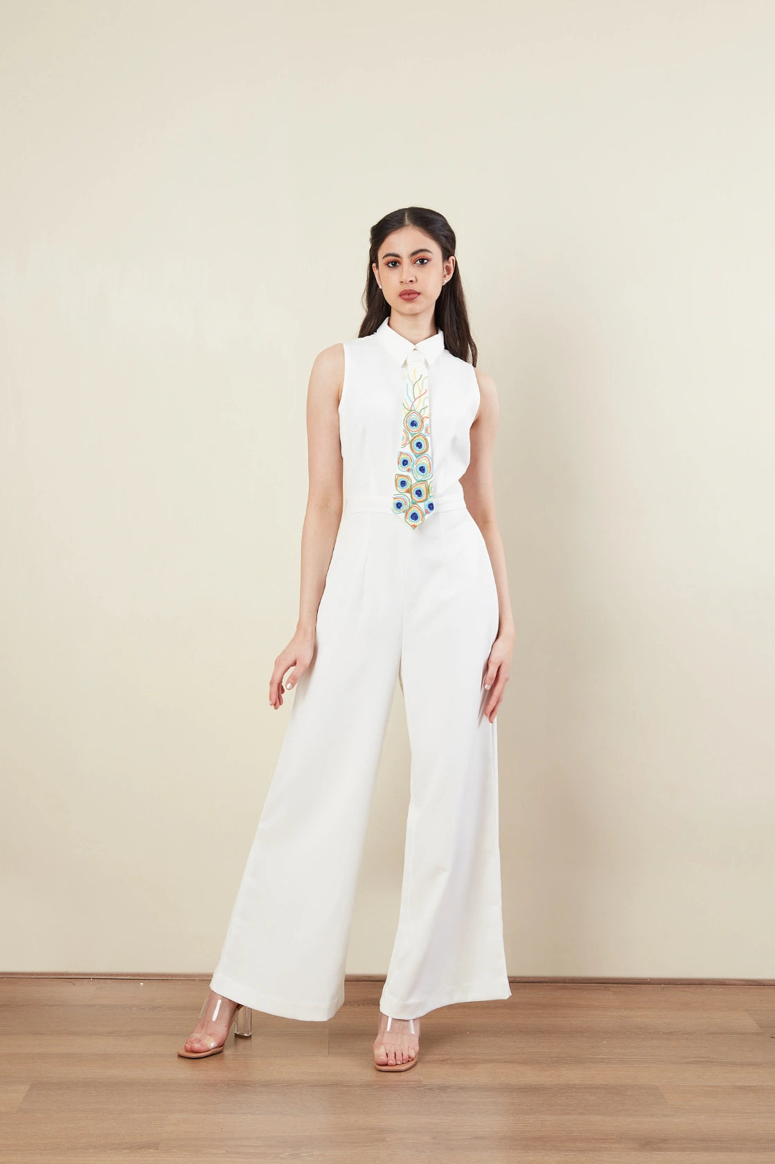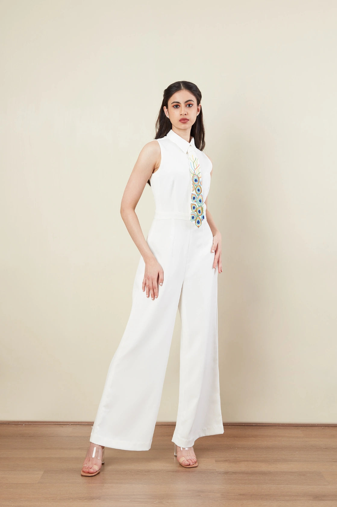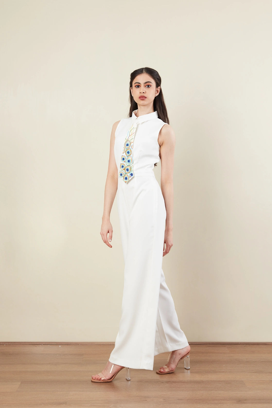 Jump Suit -Tie -Shirt collar -Sleeveless -Peacock Feather motif -Pop colour beads Embroidery