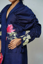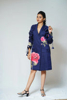 -Floral Appliqué -Royal Blue -Full sleeves -Grid lock sleeves -Blazer dress -Front open