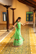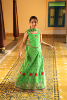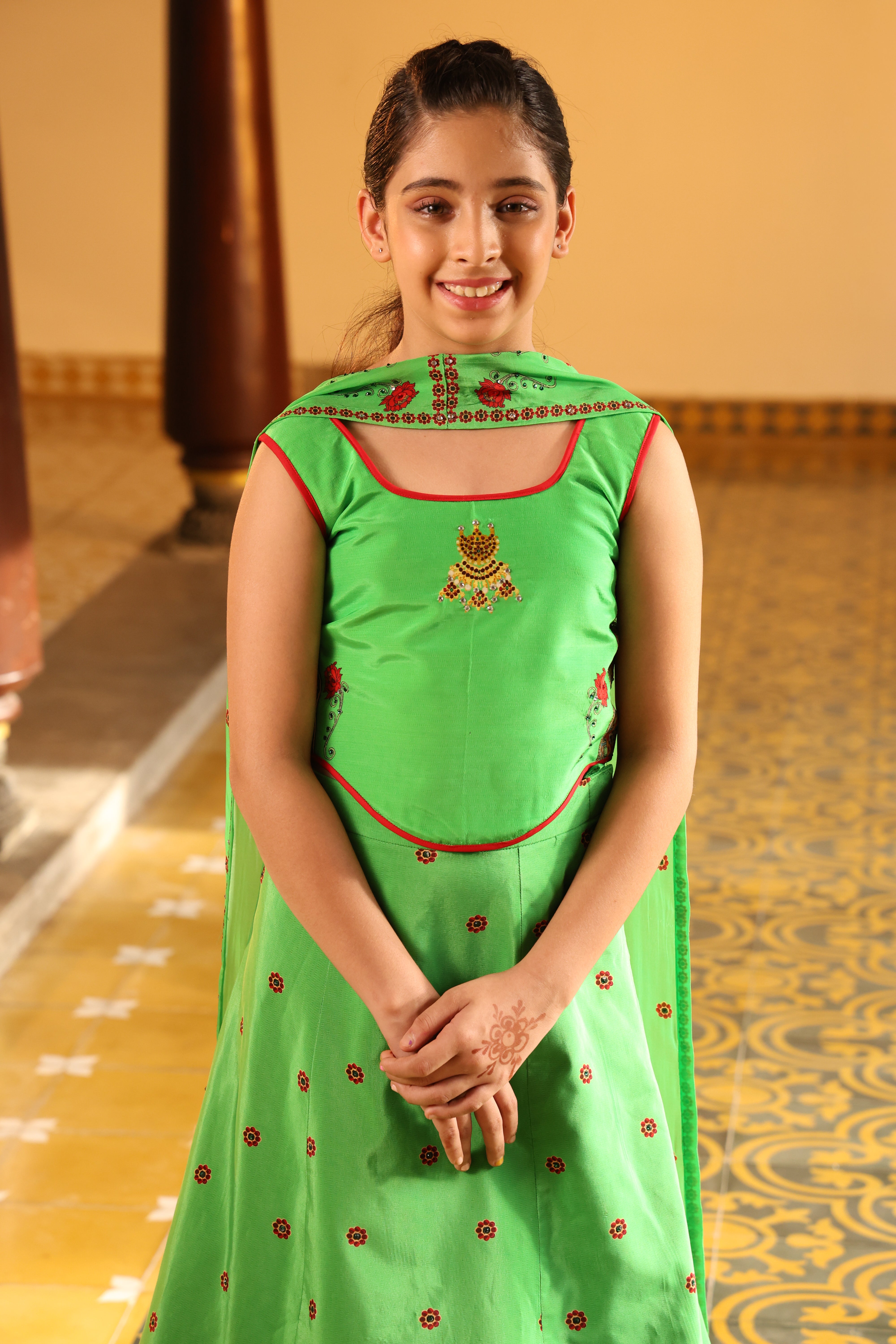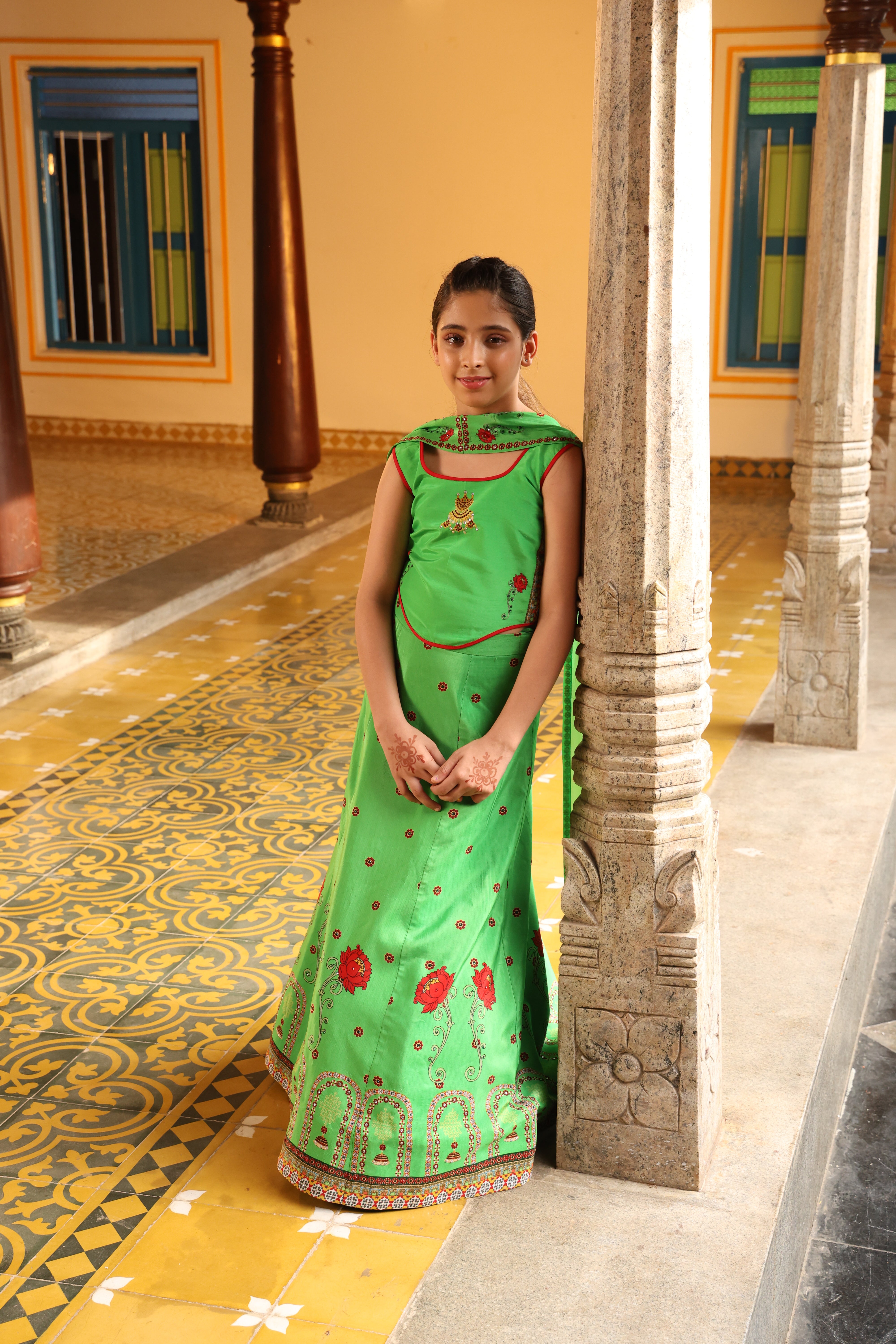 Which are digitally printed all over the corset top ,kali lehenga and stole also embellished with stone work
