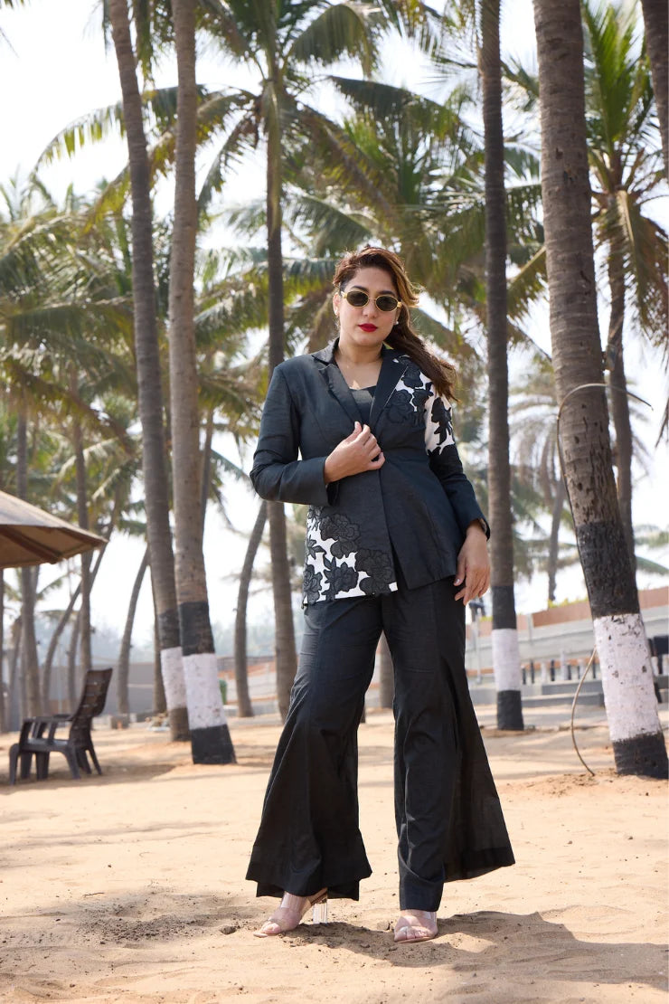 Blazer neck, Full Sleeves, Front open, Black applique leather flower Embroidery