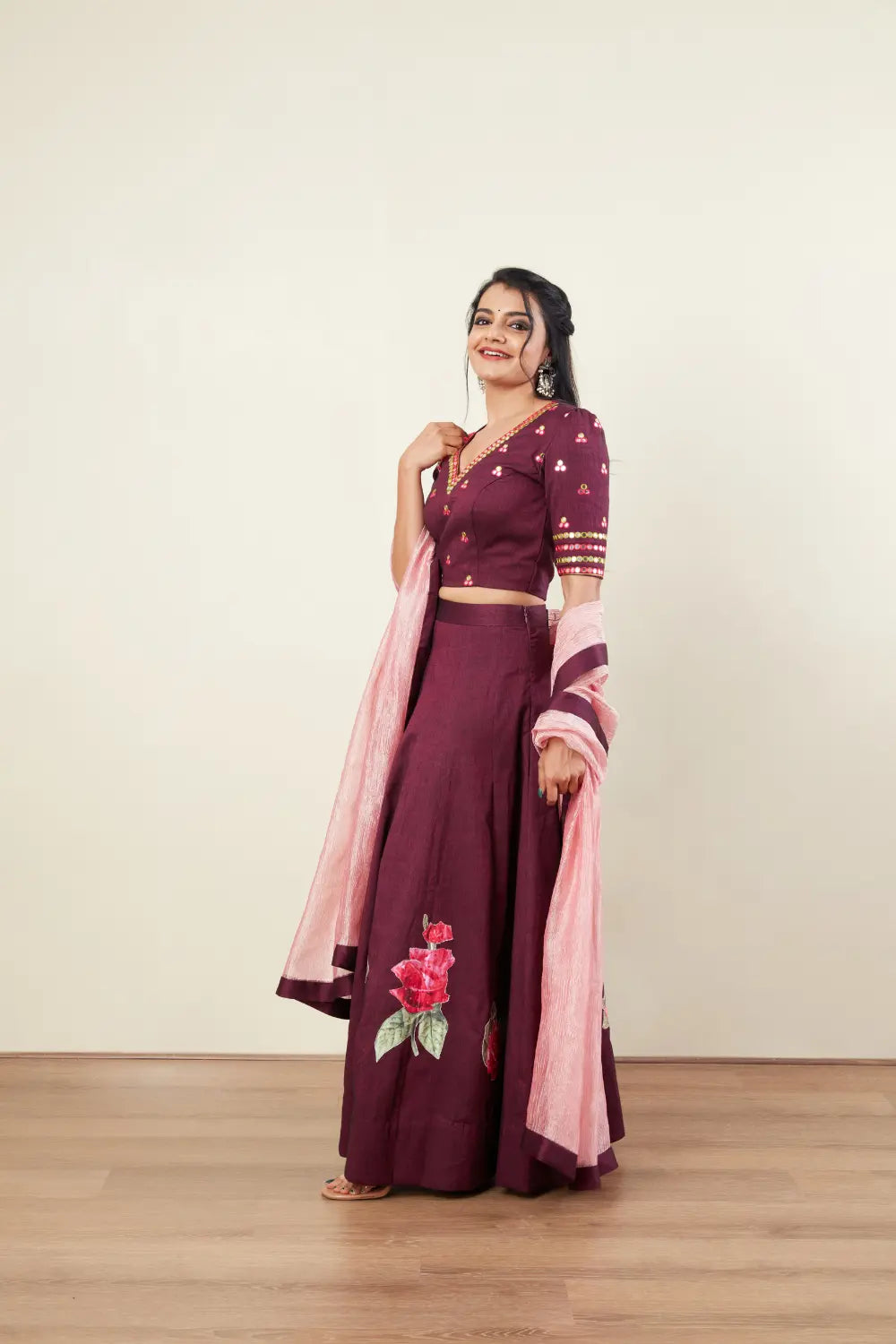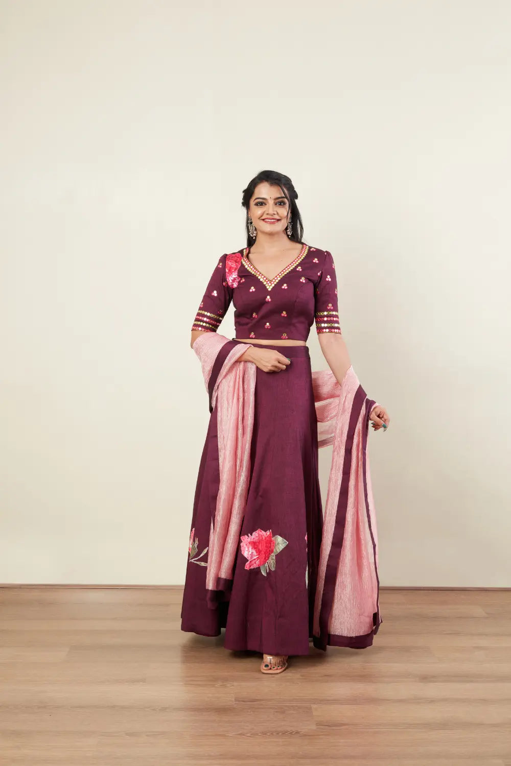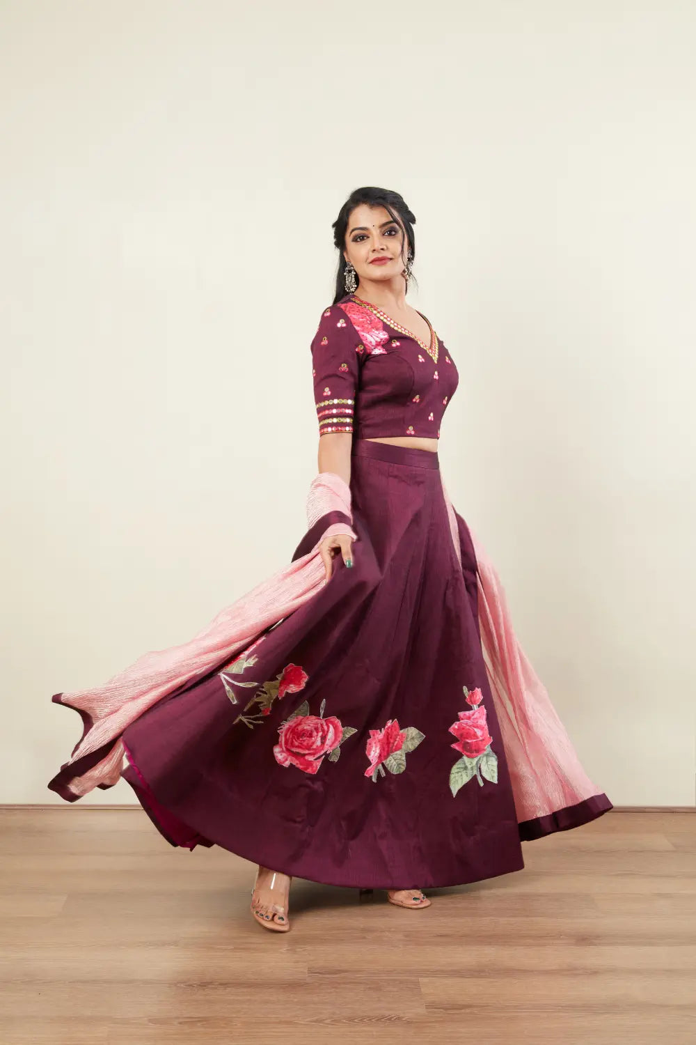 Floral print Applique work Sequence & Pearl Embriodery Multi Colur Mirror Embriodery Vide V neck Blouse Kali Leghanga Crush Dupatta