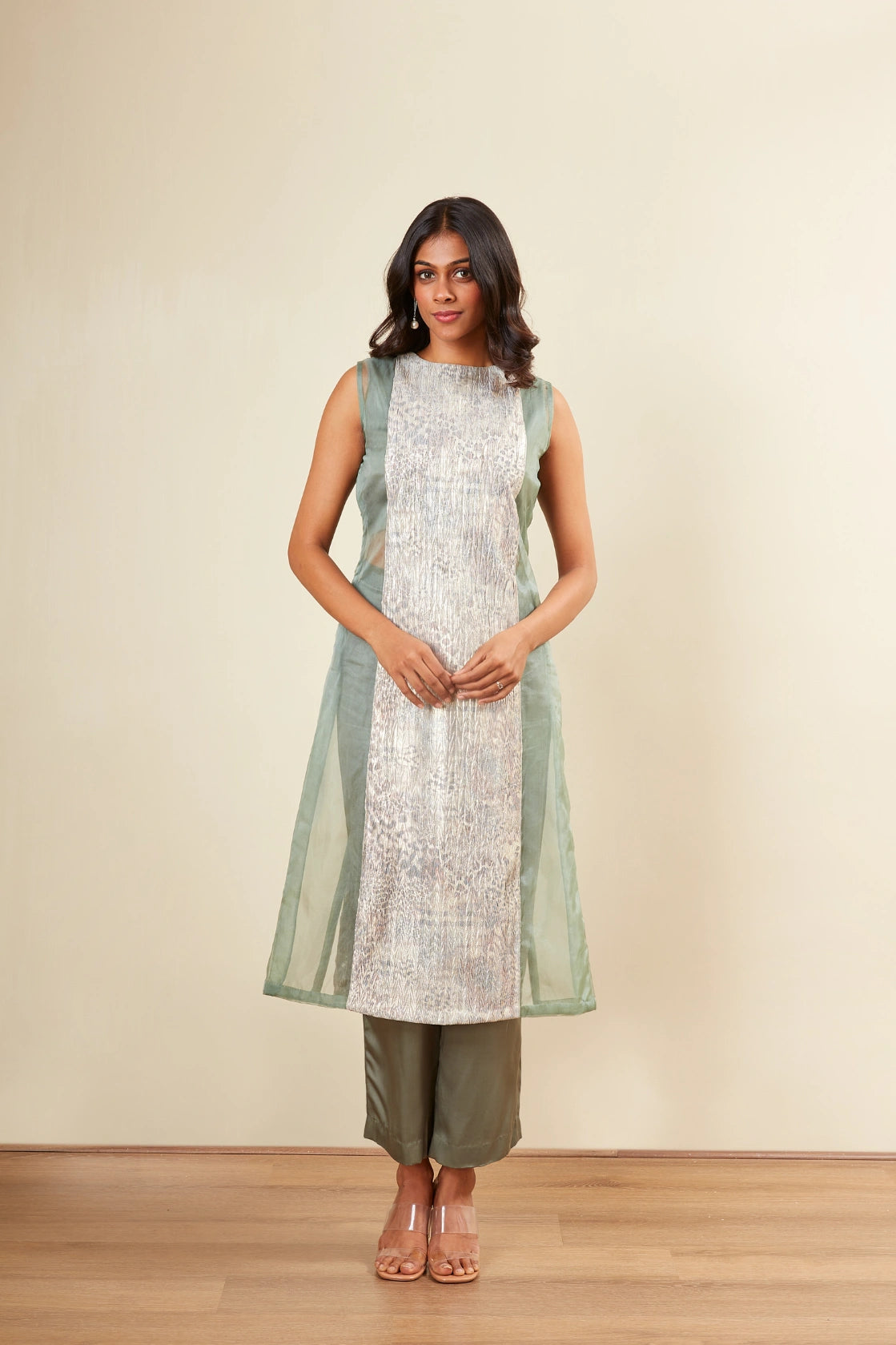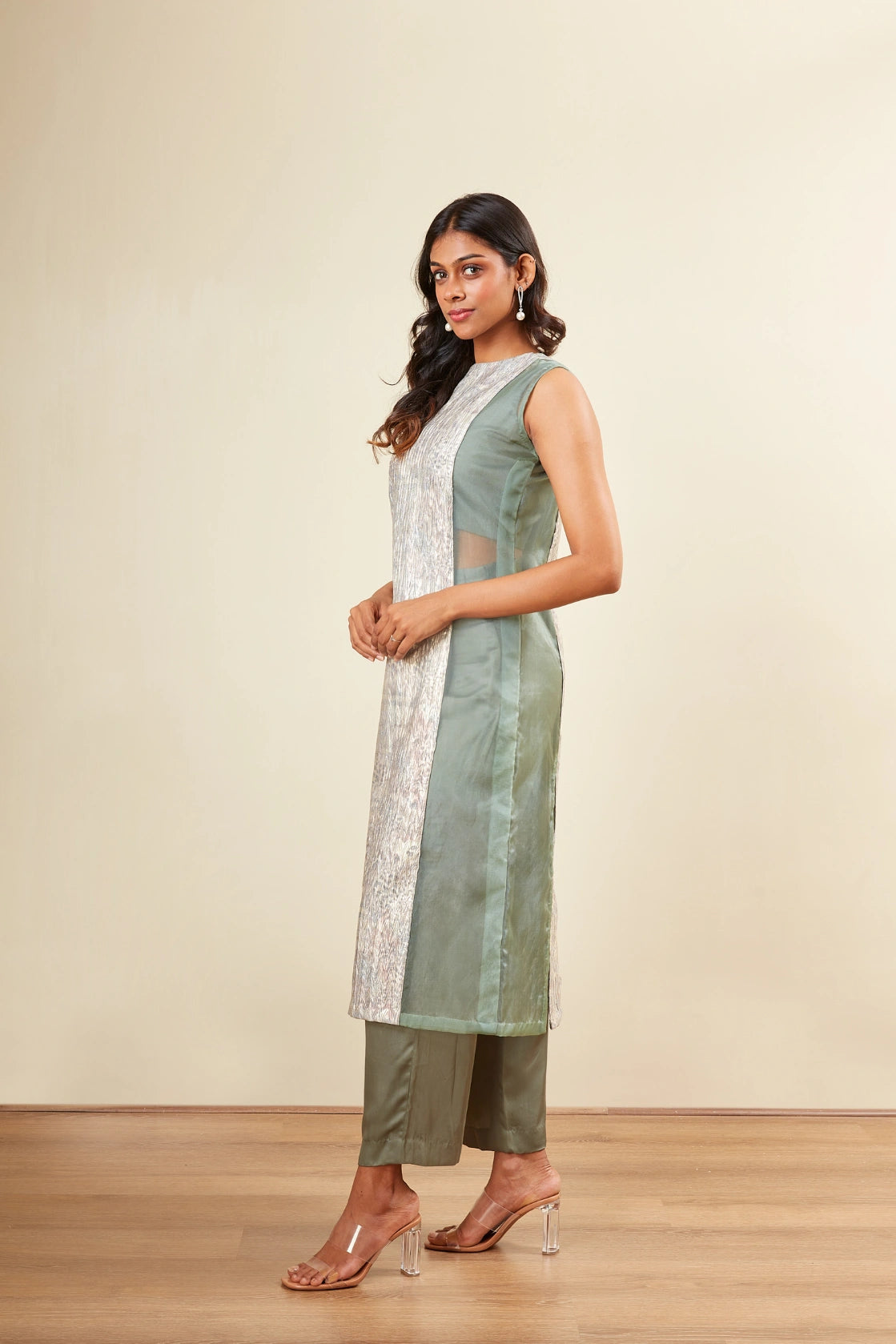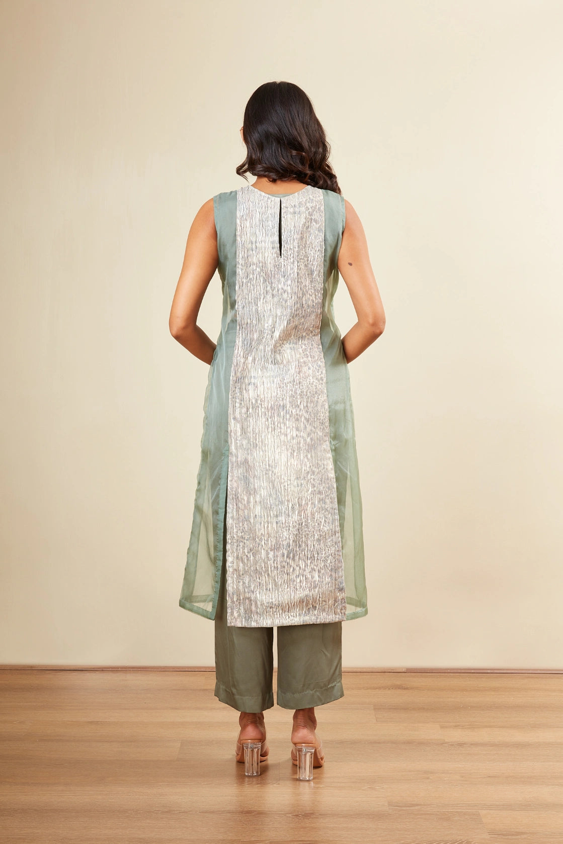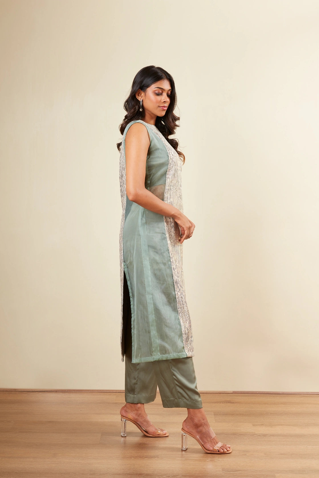 -Dull Gold Crush Metallic Print -Sleeveless kurta -Bustier -Pants -Sage Green