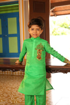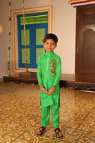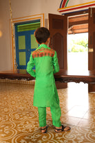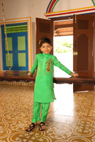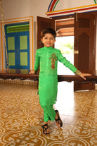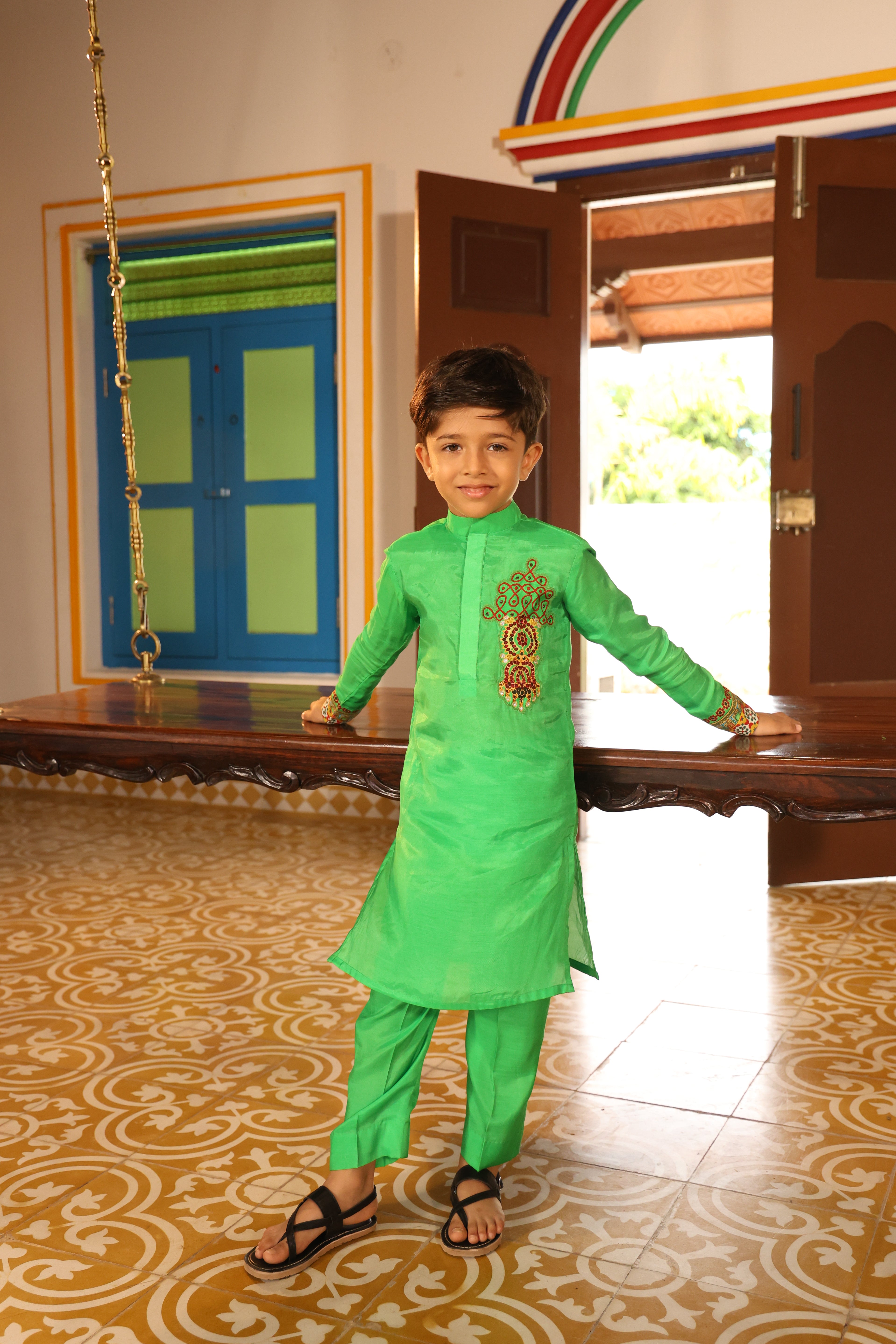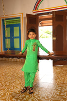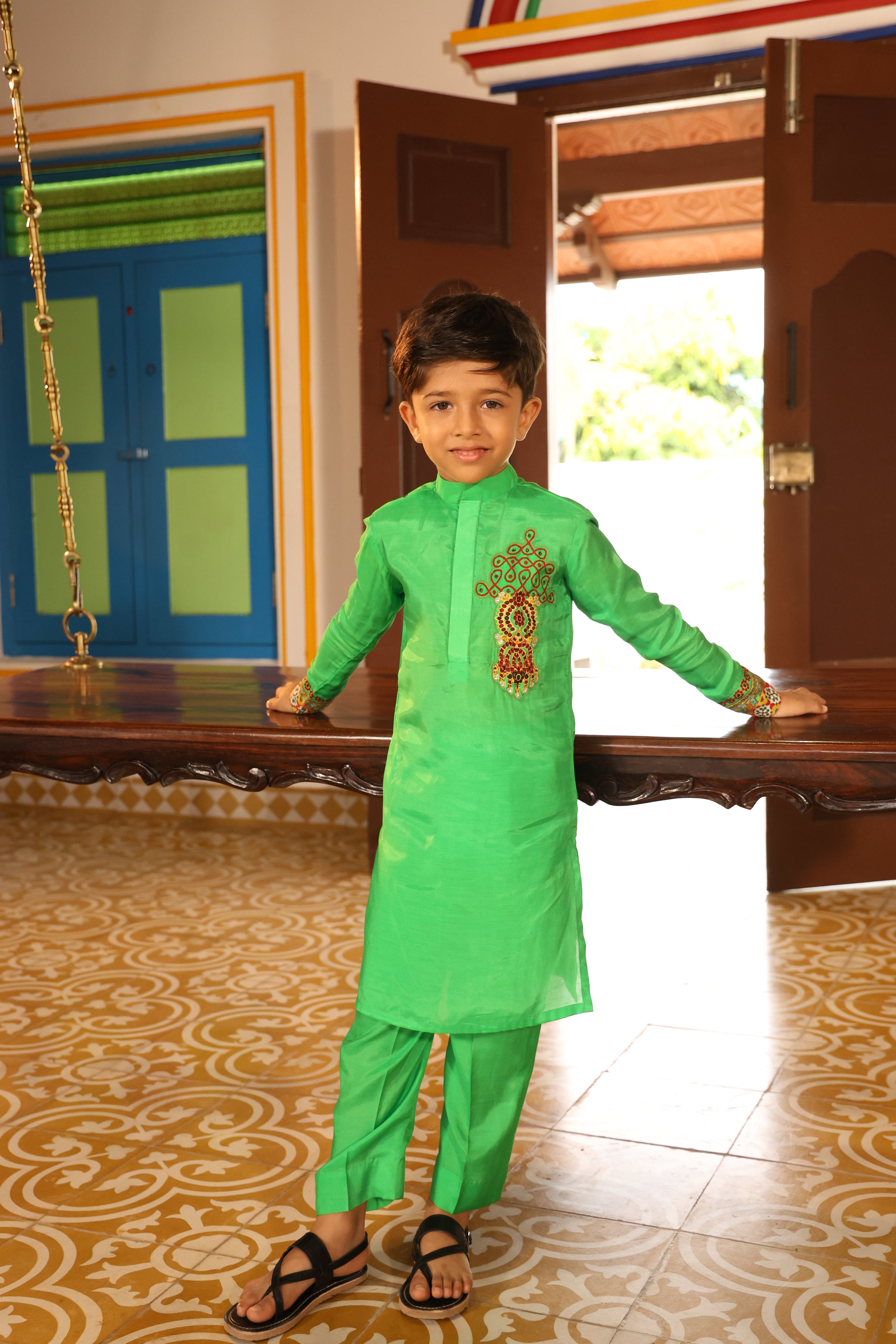 Chinese collor full sleeve kurta with straight fit pants.