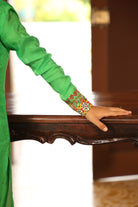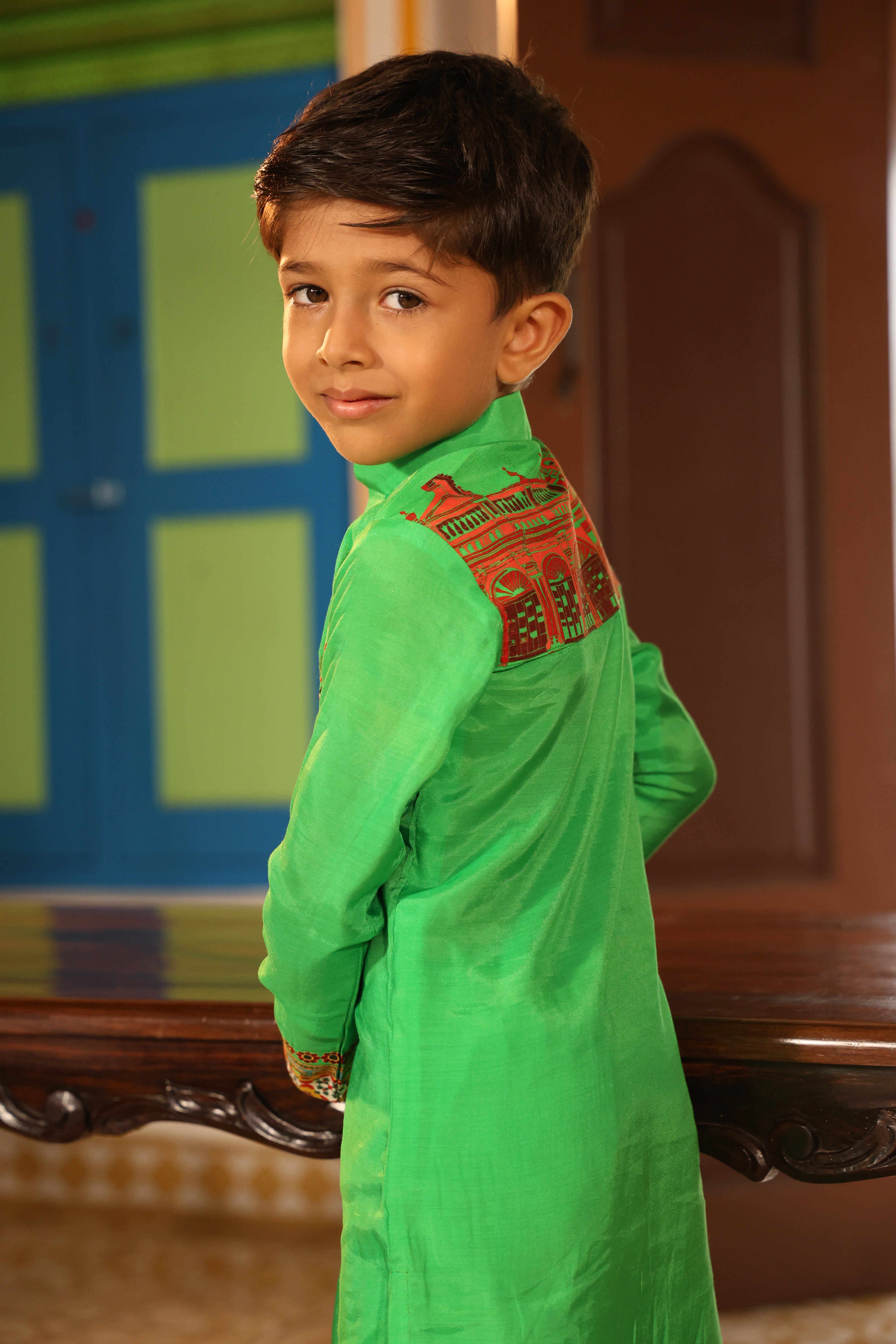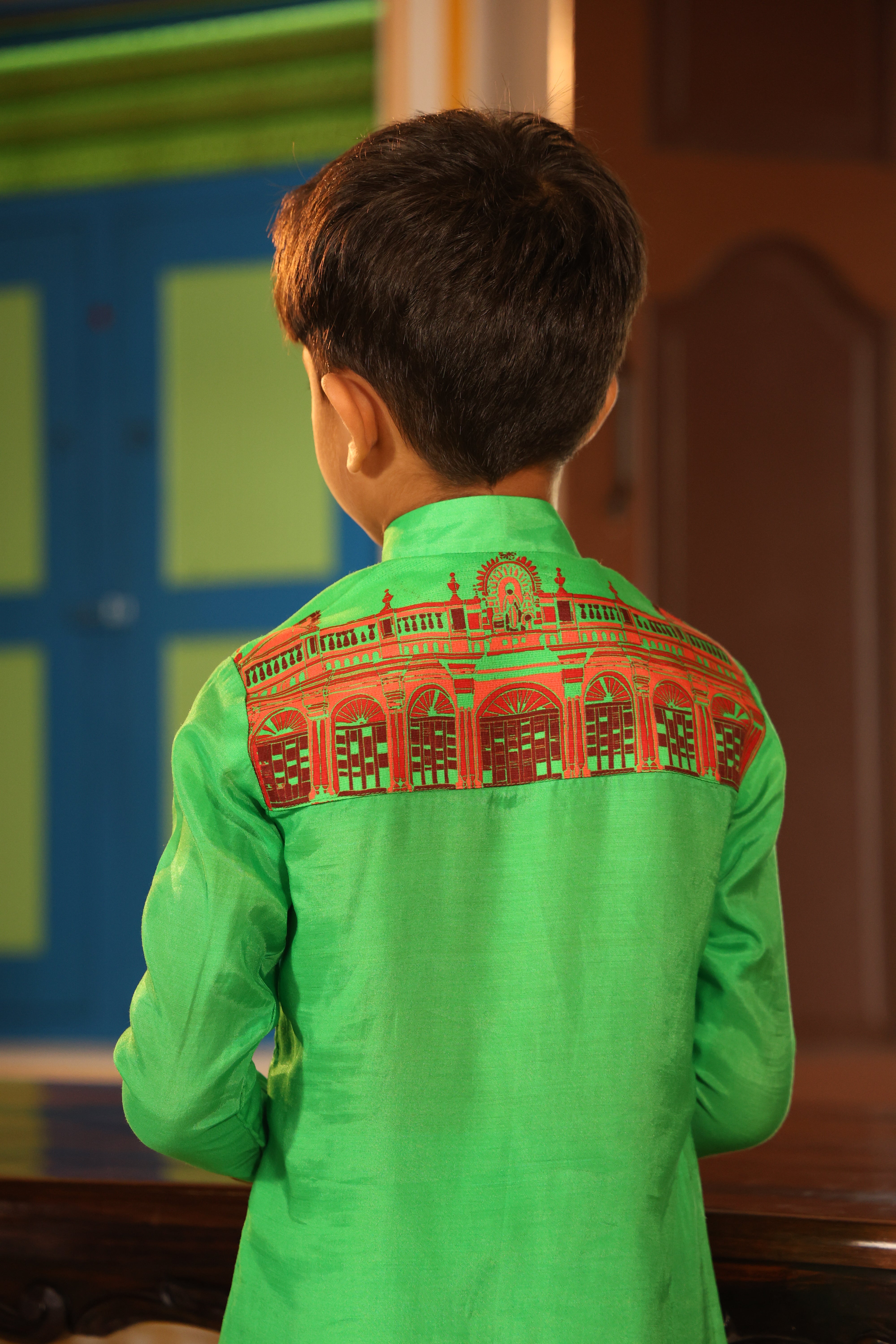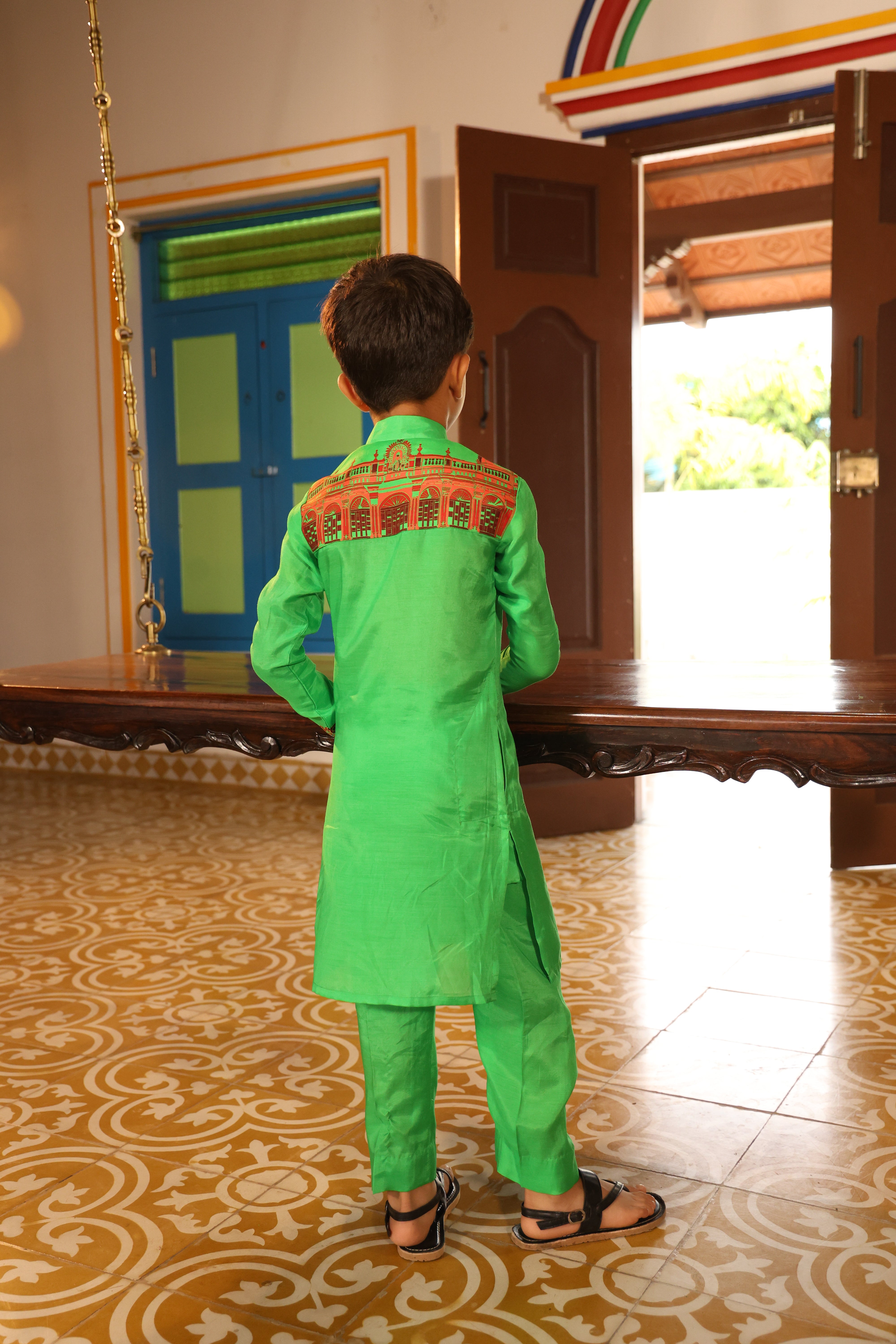 Connecting nattukottai chettiyars legecy, architeture and kemp jewellery on the kurta through digitally print motif also embellished with stones.