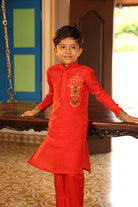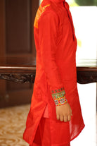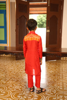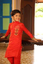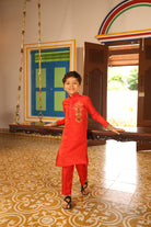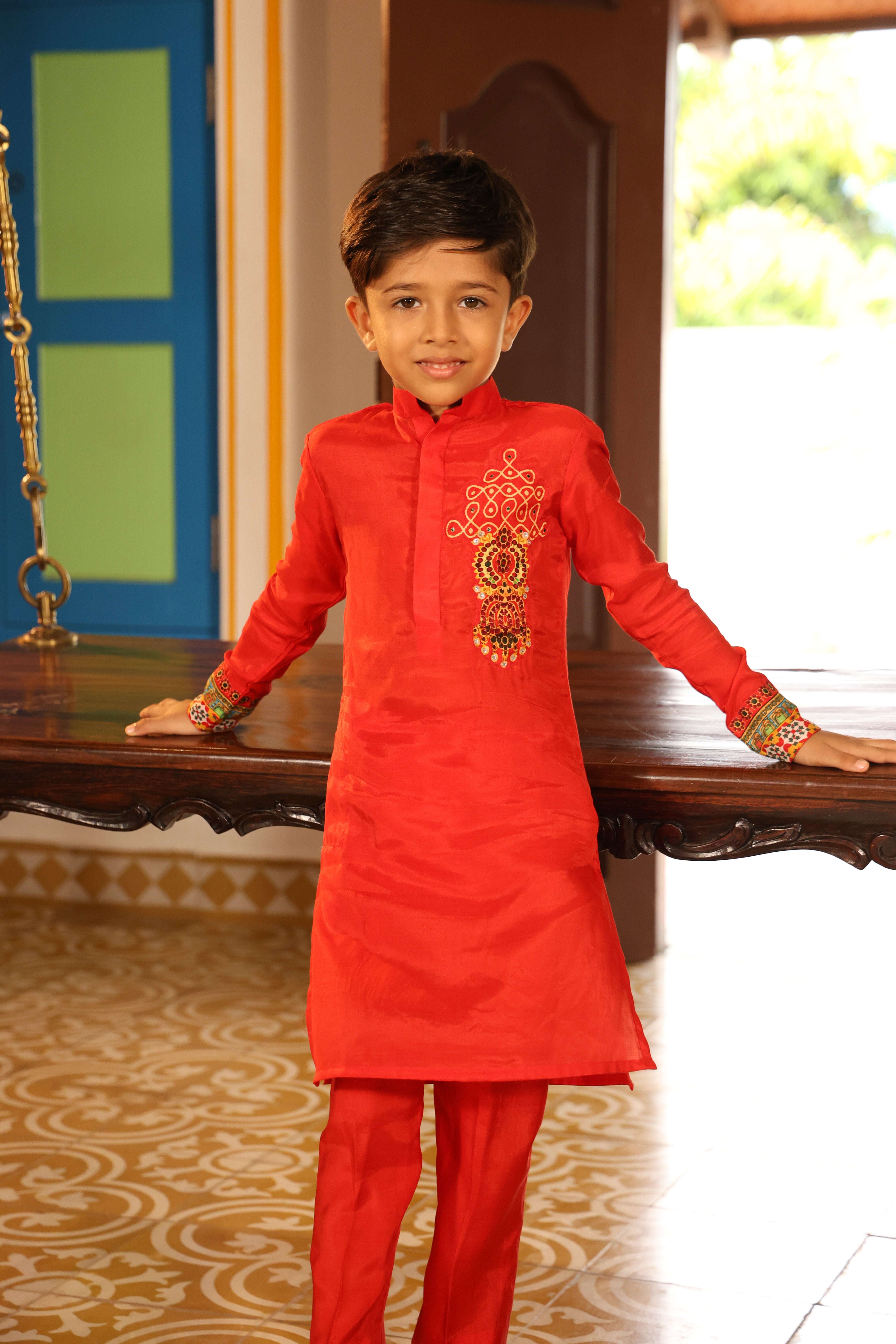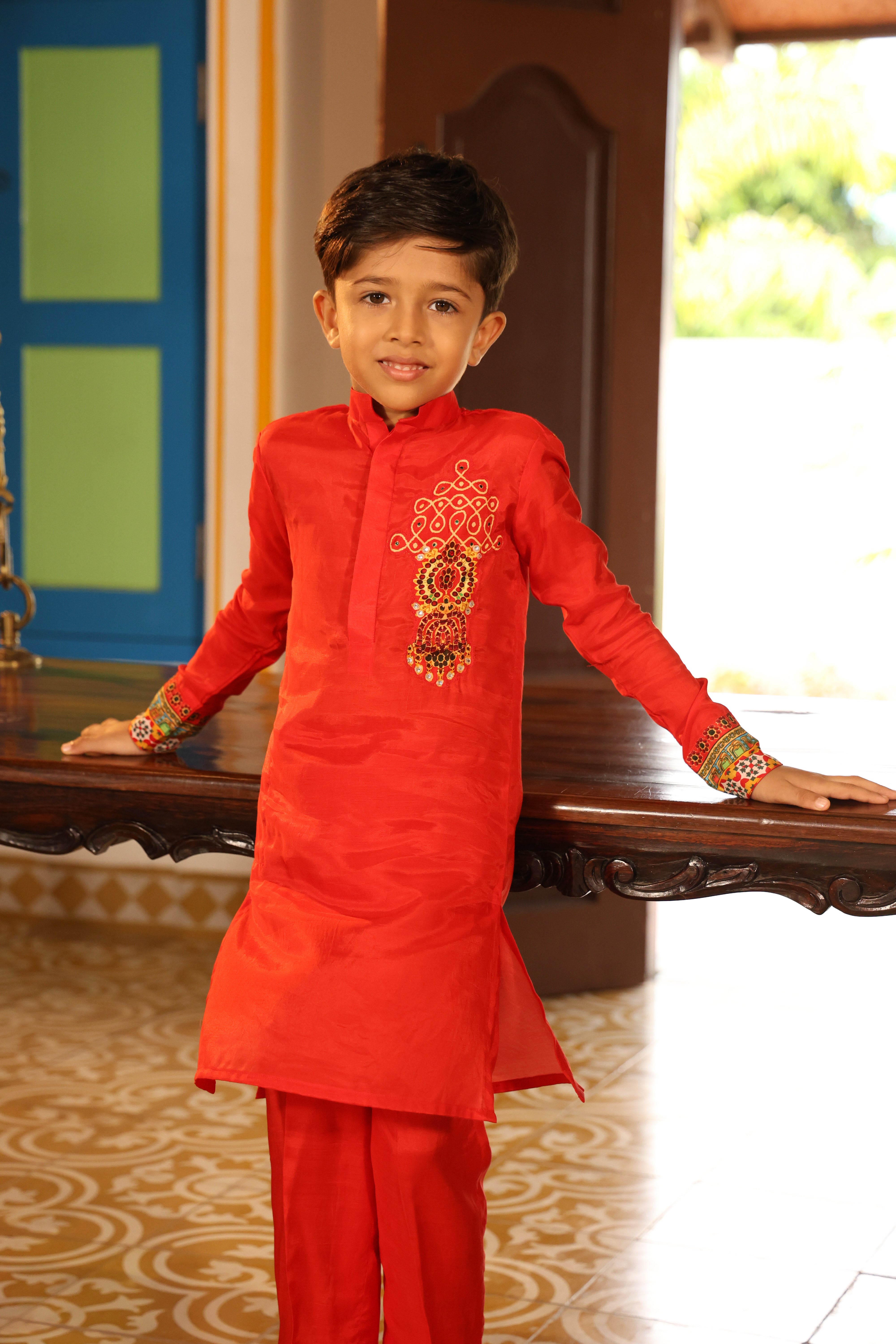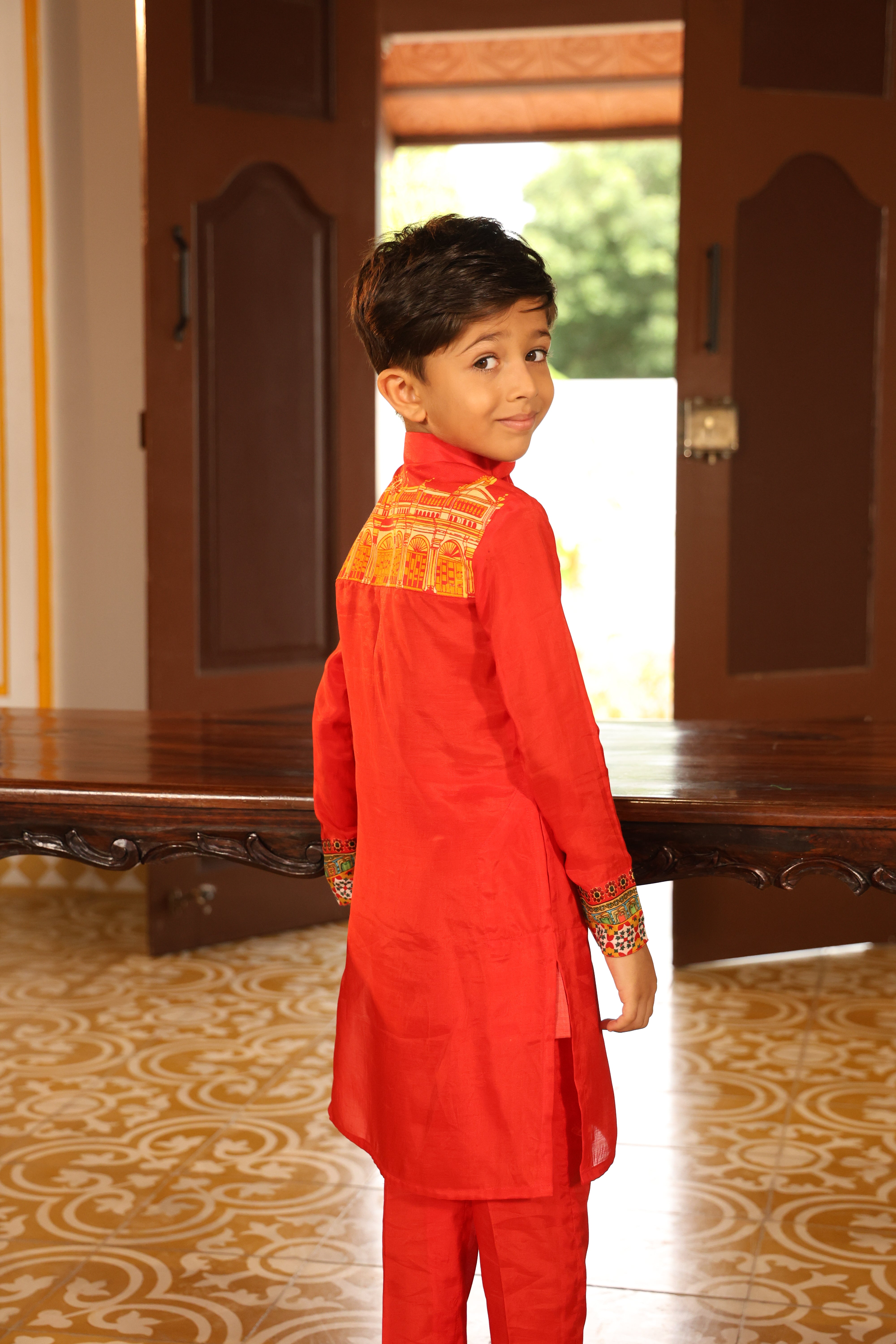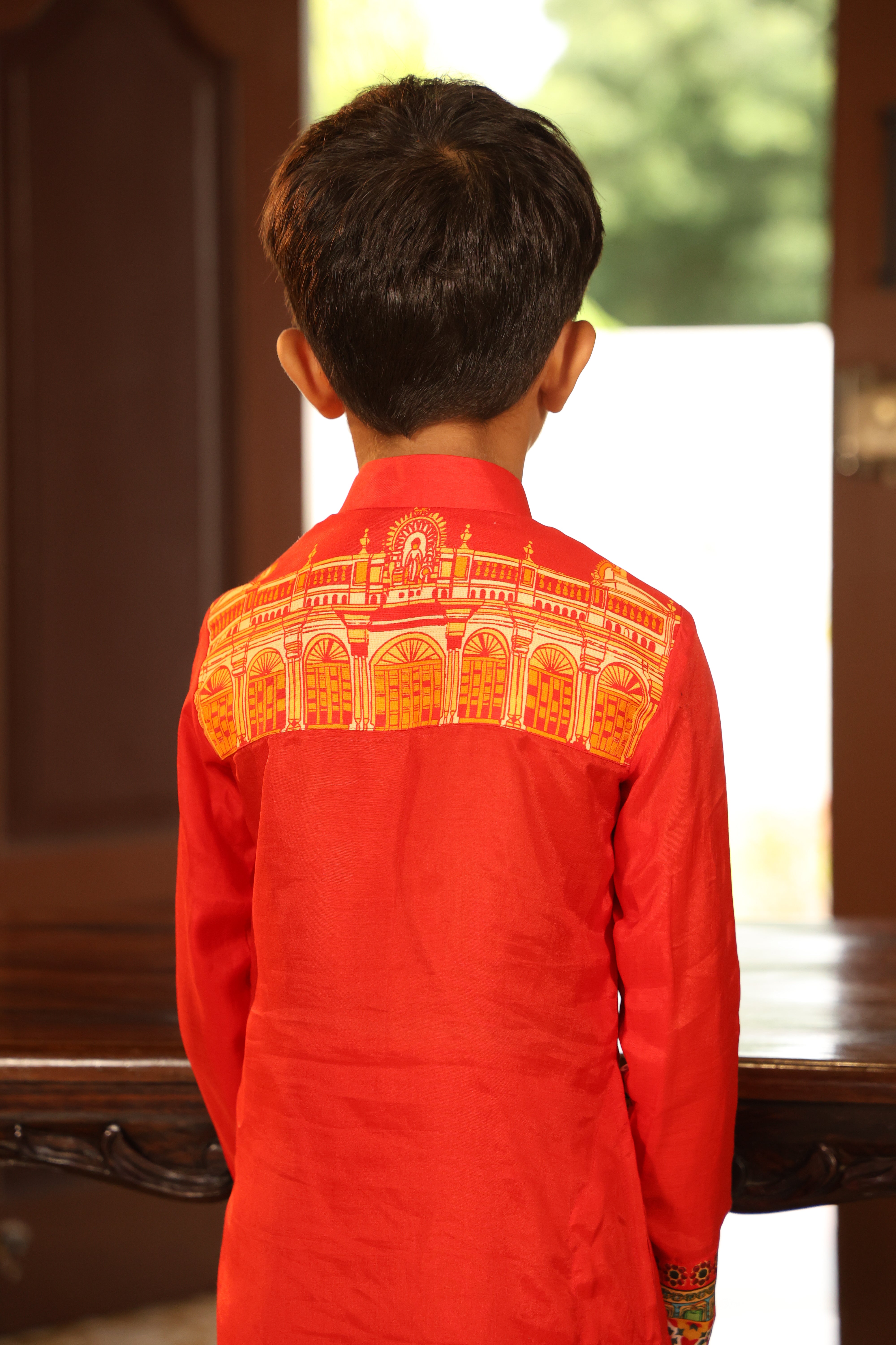 Connecting nattukottai chettiyars legecy, architeture and kemp jewellery on the kurta through digitally print motif also embellished with stones.