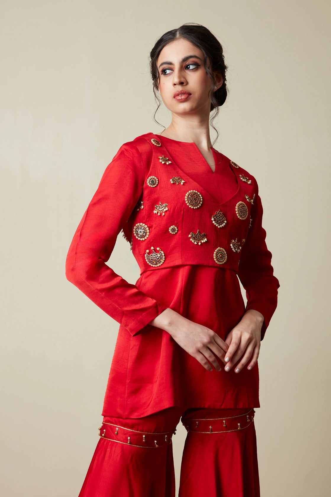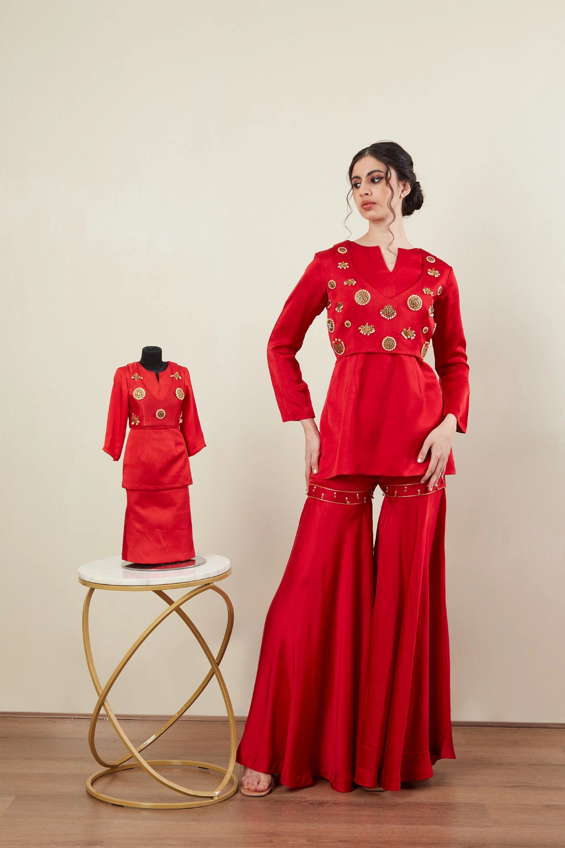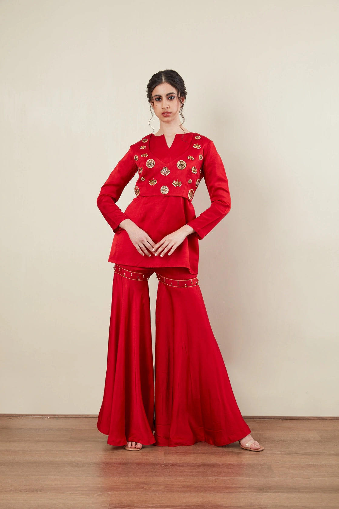 Round Neck -V slit -Full Sleeves -Kurta -Sharara pants -Back Metal Zipper -Crop Jacket -South Indian Jewellery Embellishment