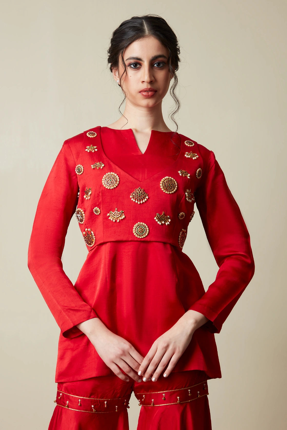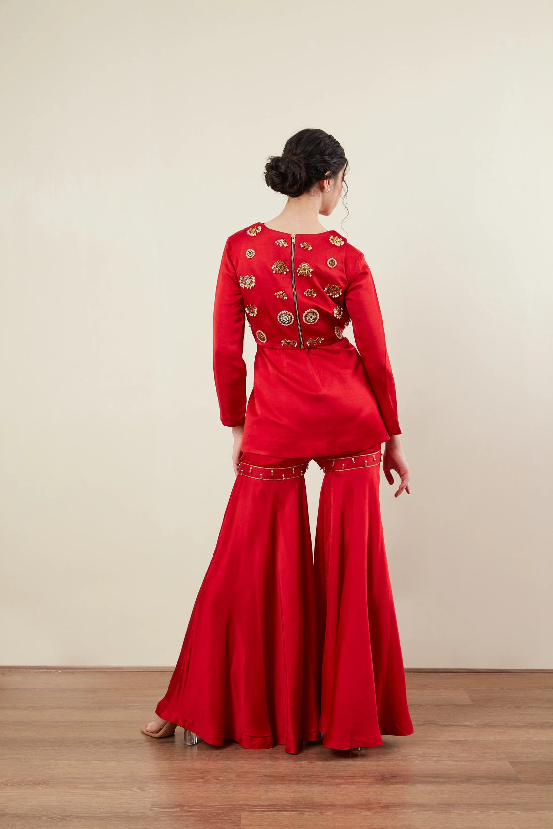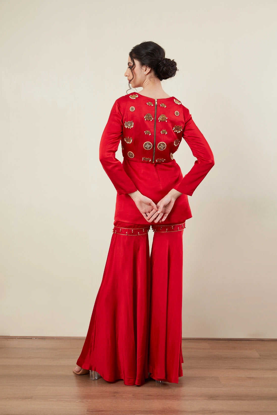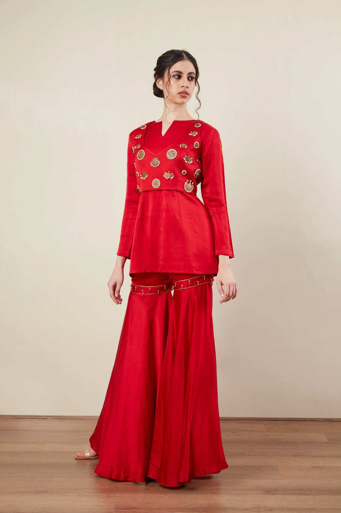 Round Neck -V slit -Full Sleeves -Kurta -Sharara pants -Back Metal Zipper -Crop Jacket -South Indian Jewellery Embellishment