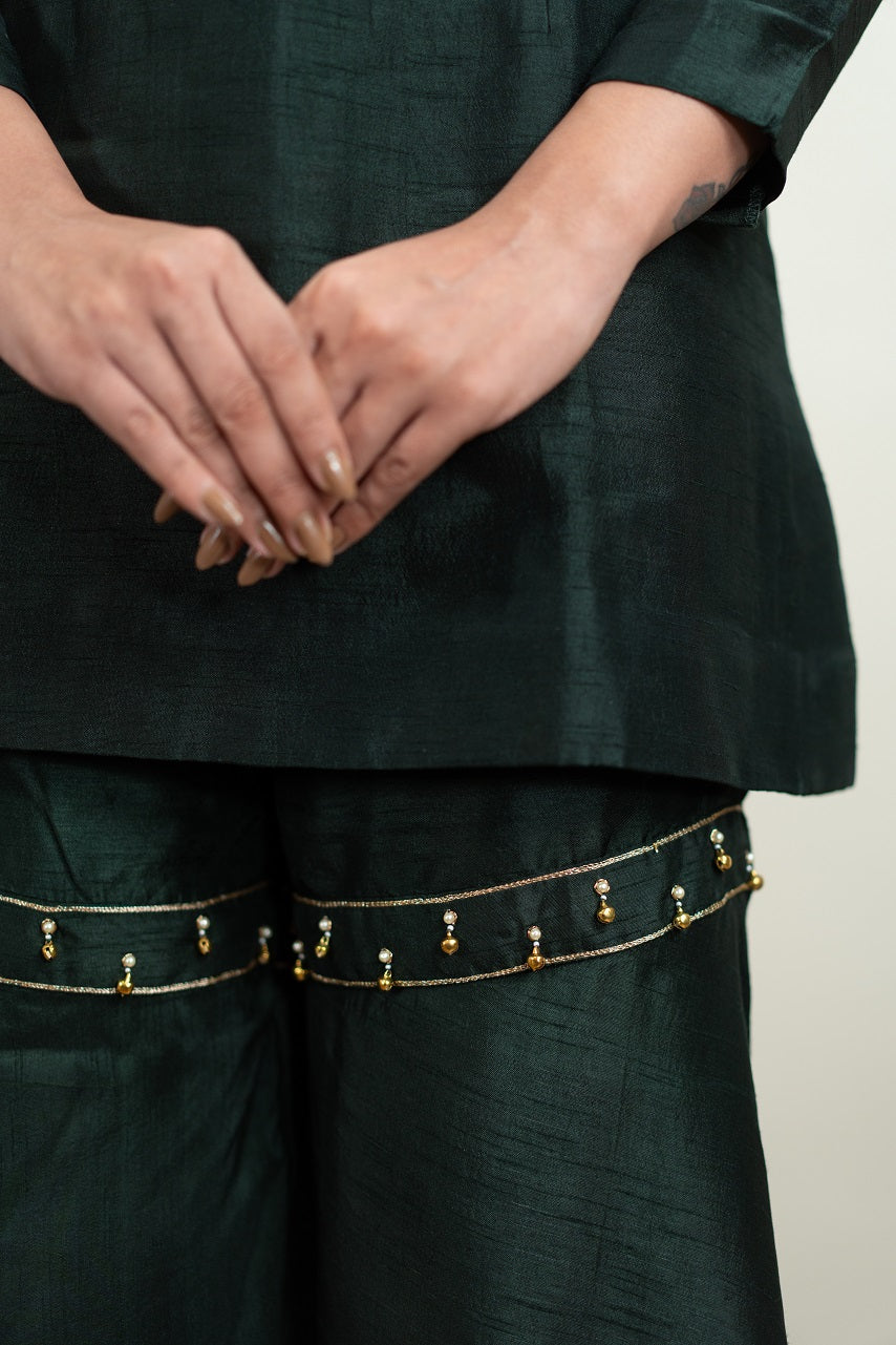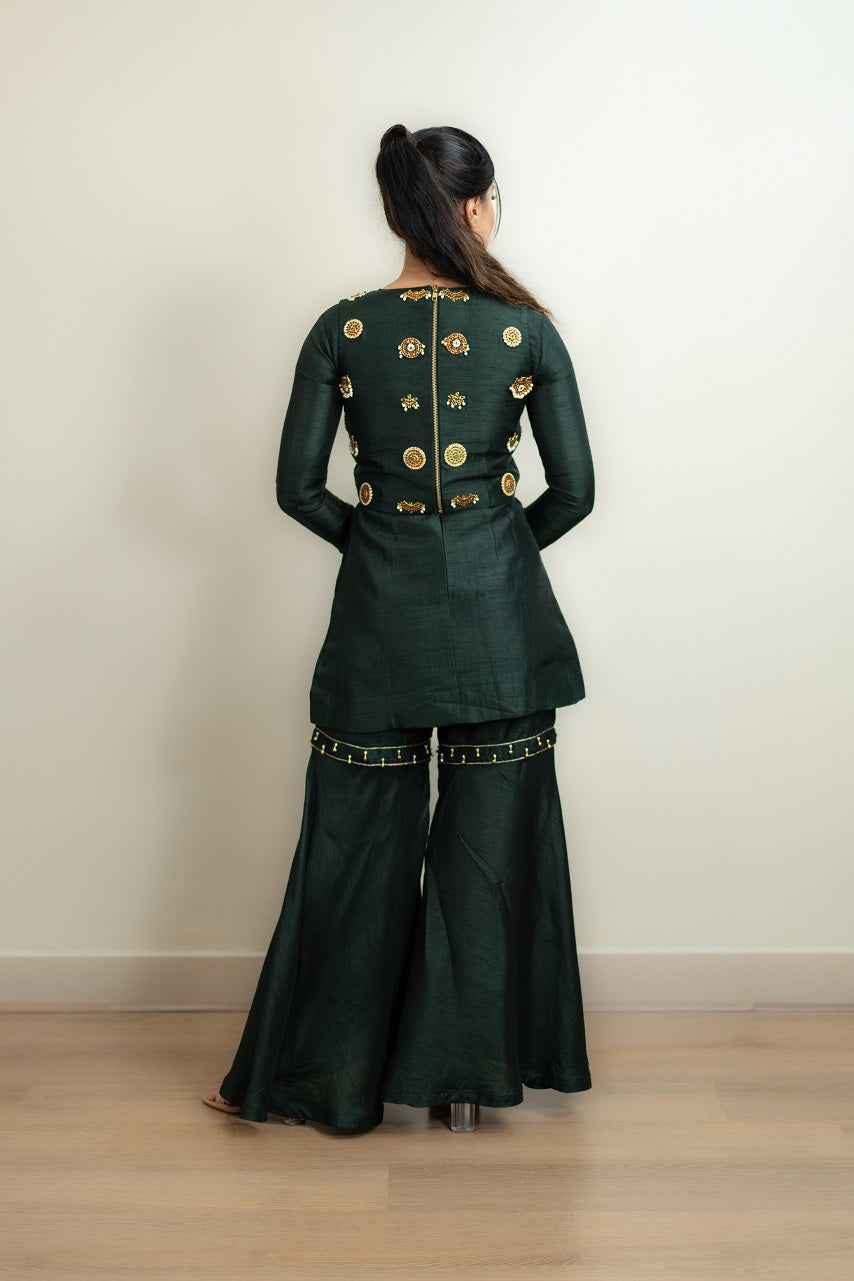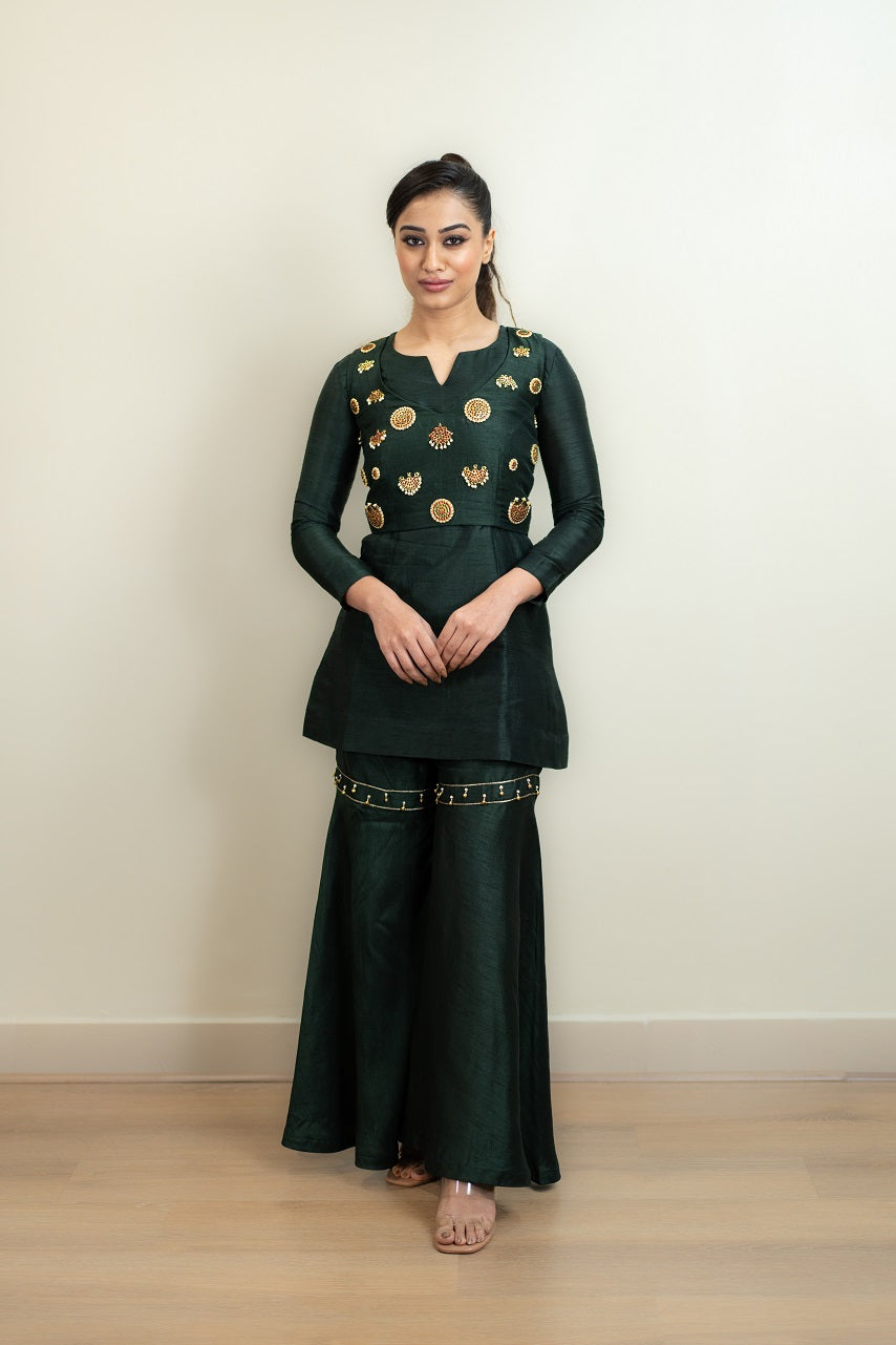 Round Neck -V slit -Full Sleeves -Kurta -Sharara pants -Back Metal Zipper -Crop Jacket -South Indian Jewellery Embellishment