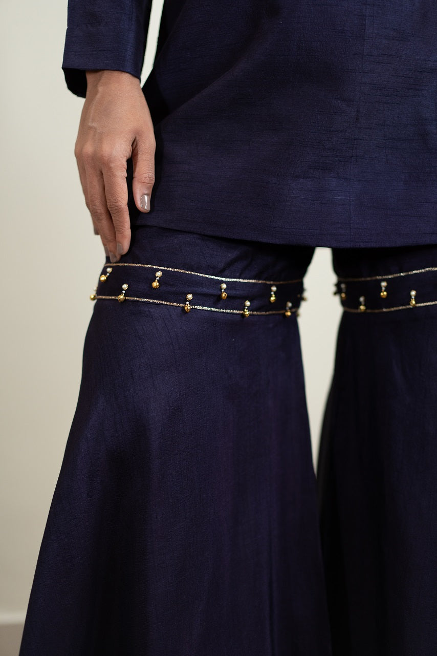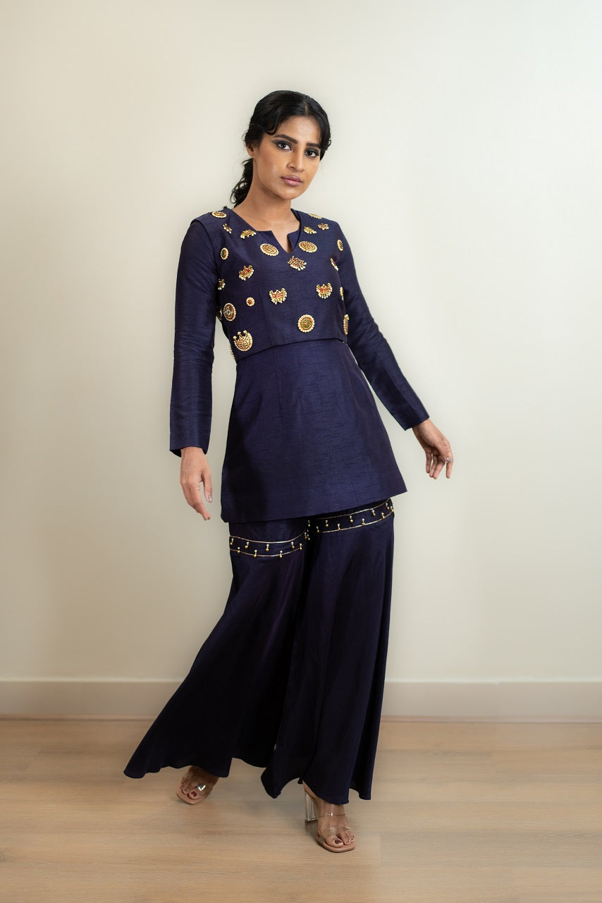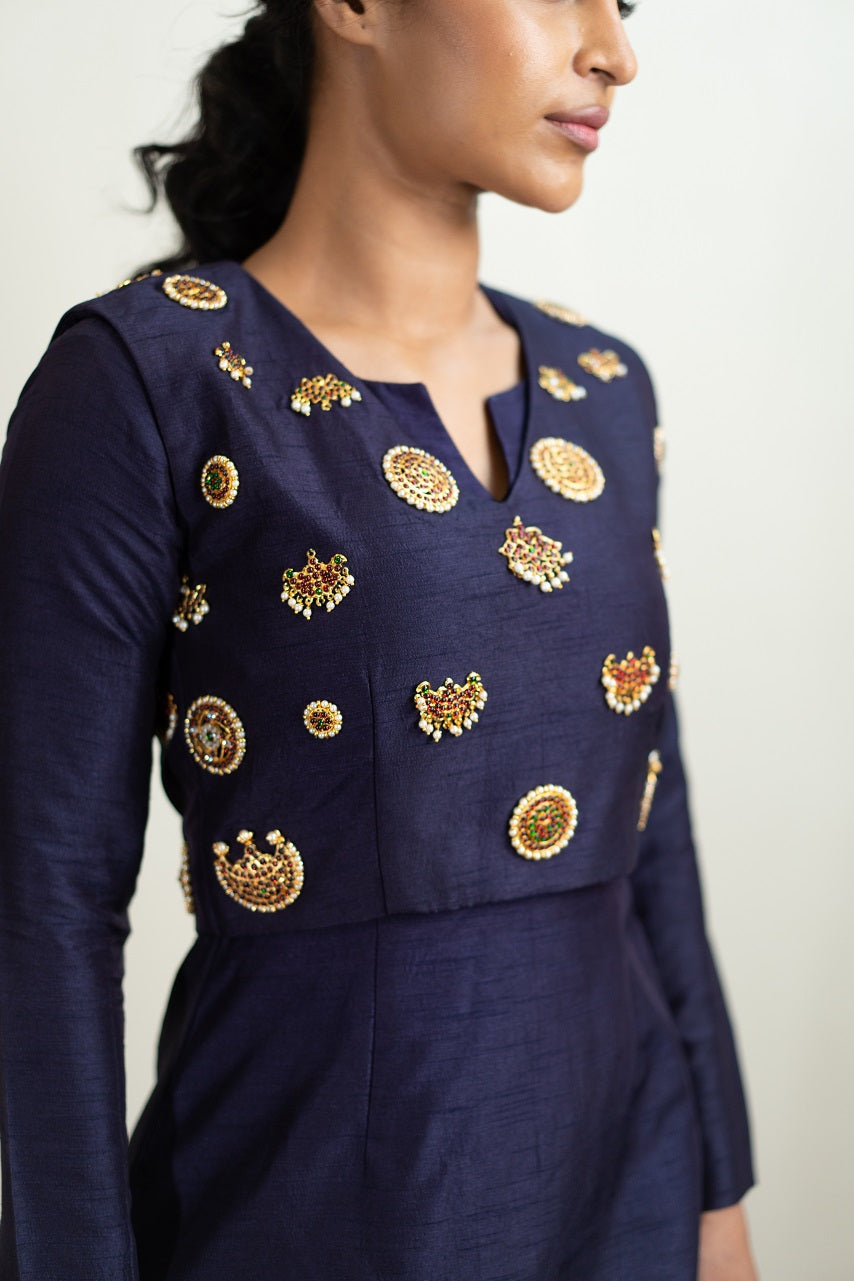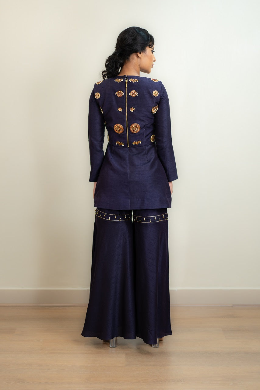Round Neck -V slit -Full Sleeves -Kurta -Sharara pants -Back Metal Zipper -Crop Jacket -South Indian Jewellery Embellishment