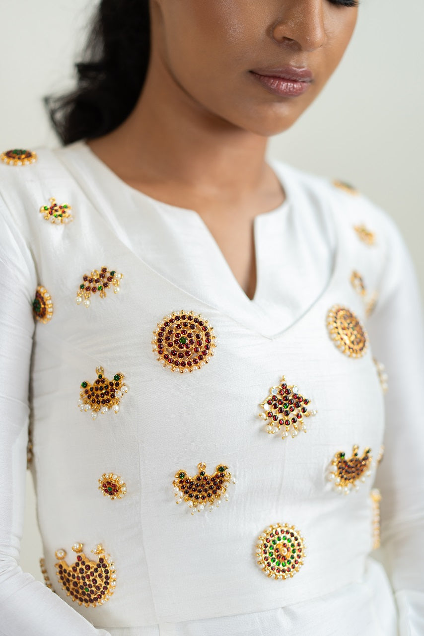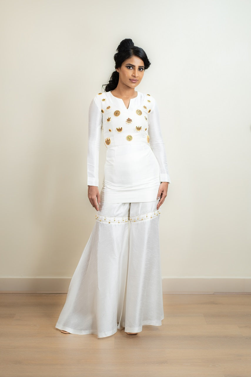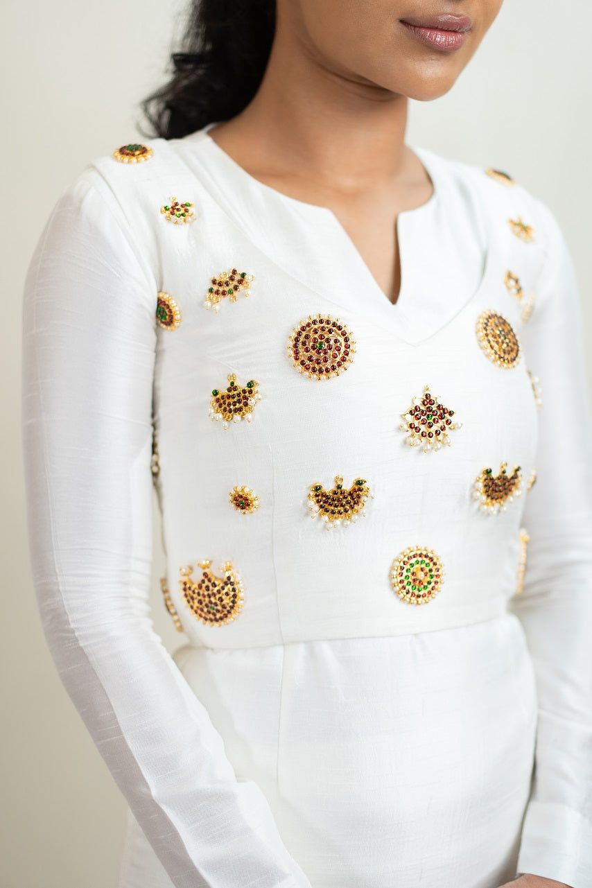 Round Neck -V slit -Full Sleeves -Kurta -Sharara pants -Back Metal Zipper -Crop Jacket -South Indian Jewellery Embellishment