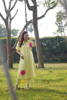 Shirt Collar, Short Sleeves, Front open kurta, Loose plazo pants, Pink Lotus Applique Embroidery
