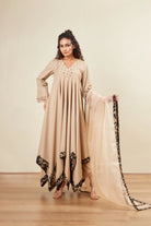 Gold Rock stud embroidery -V neck -Full Sleeve -Handkerchief Anarkali -Animal Print Border -Organza Dupatta -Beige pants -Bottom with organza finish