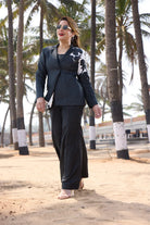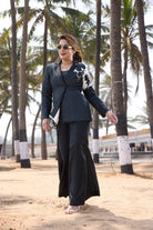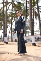 Blazer neck, Full Sleeves, Front open, Black applique leather flower Embroidery