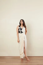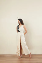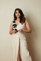 Black Floral Embriodery Lazer cut Flowers Sleeveless one side drape v neck