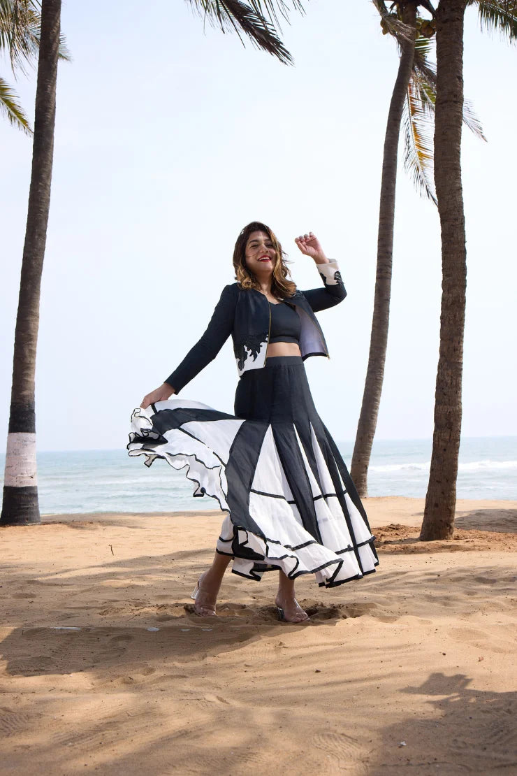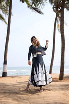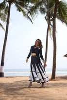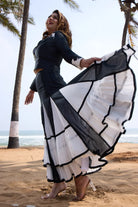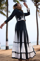 Bustier, metal Zipper, Full Sleeve, Black applique leather flower Embroidery, Multi kali and double layered skirt
